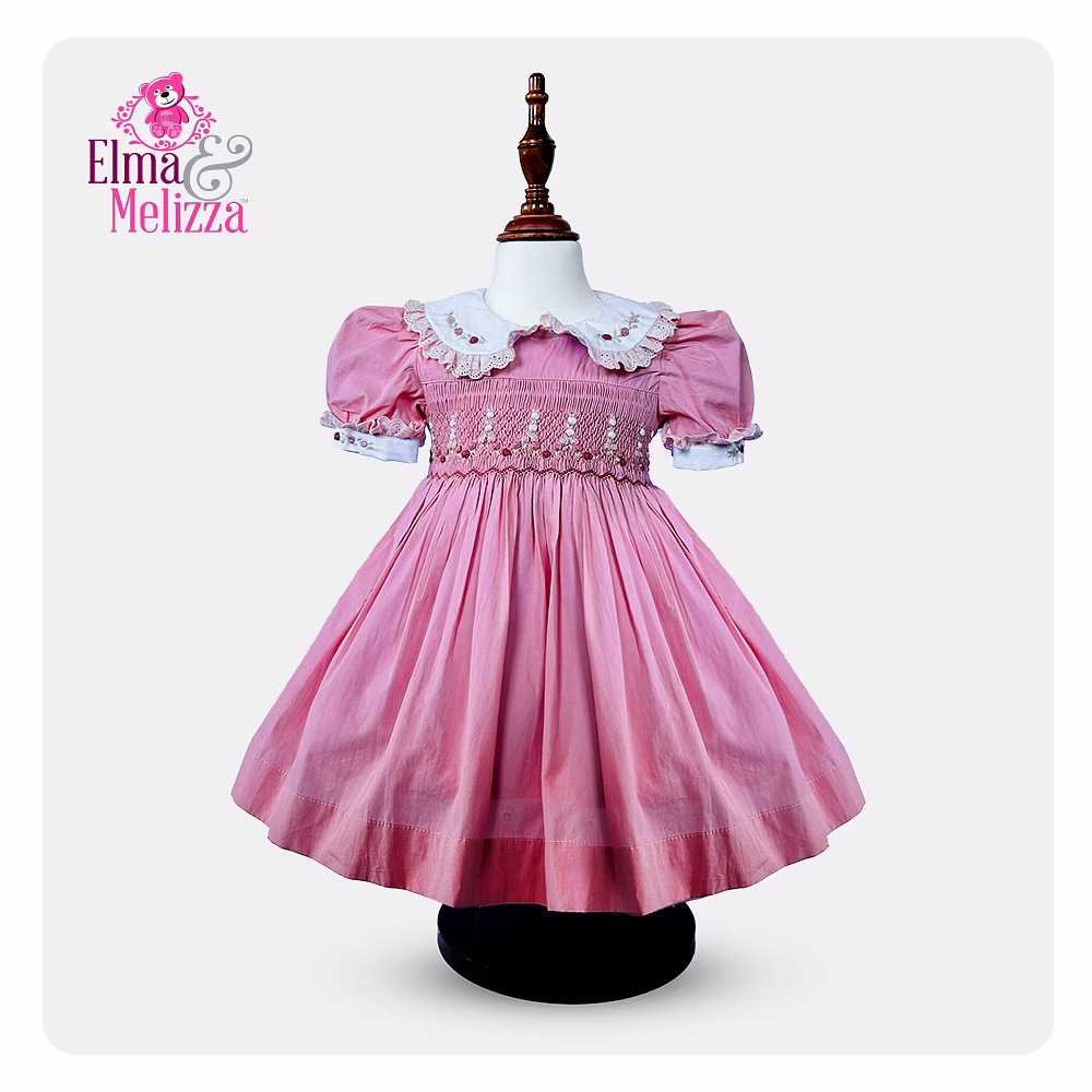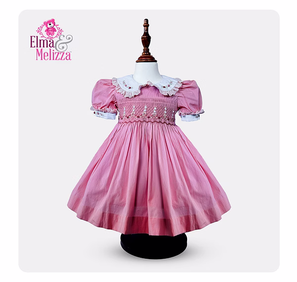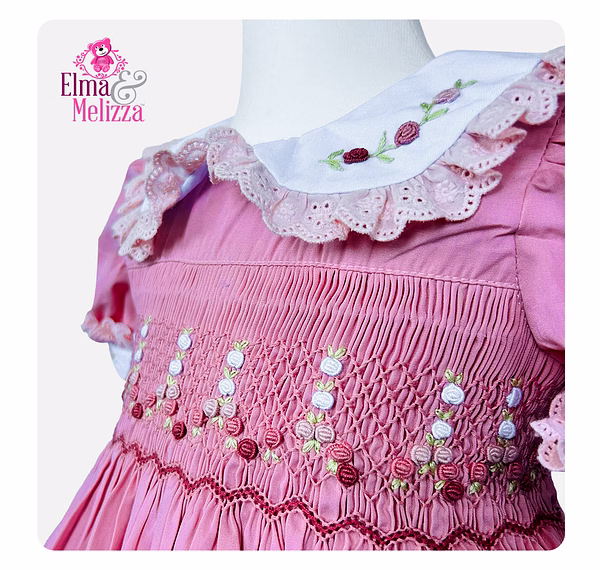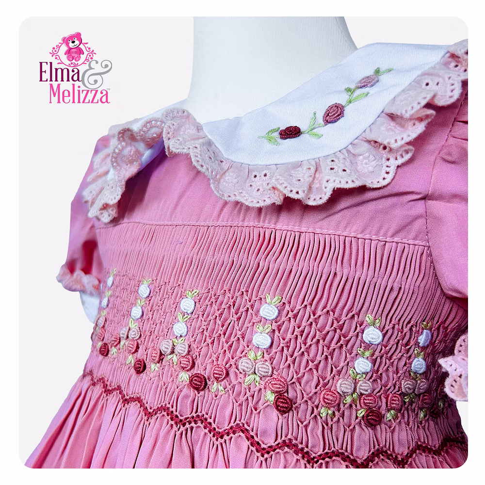 Intricate hand-smocking with pink and red threads, adorned with delicate floral embroidery for a standout design.