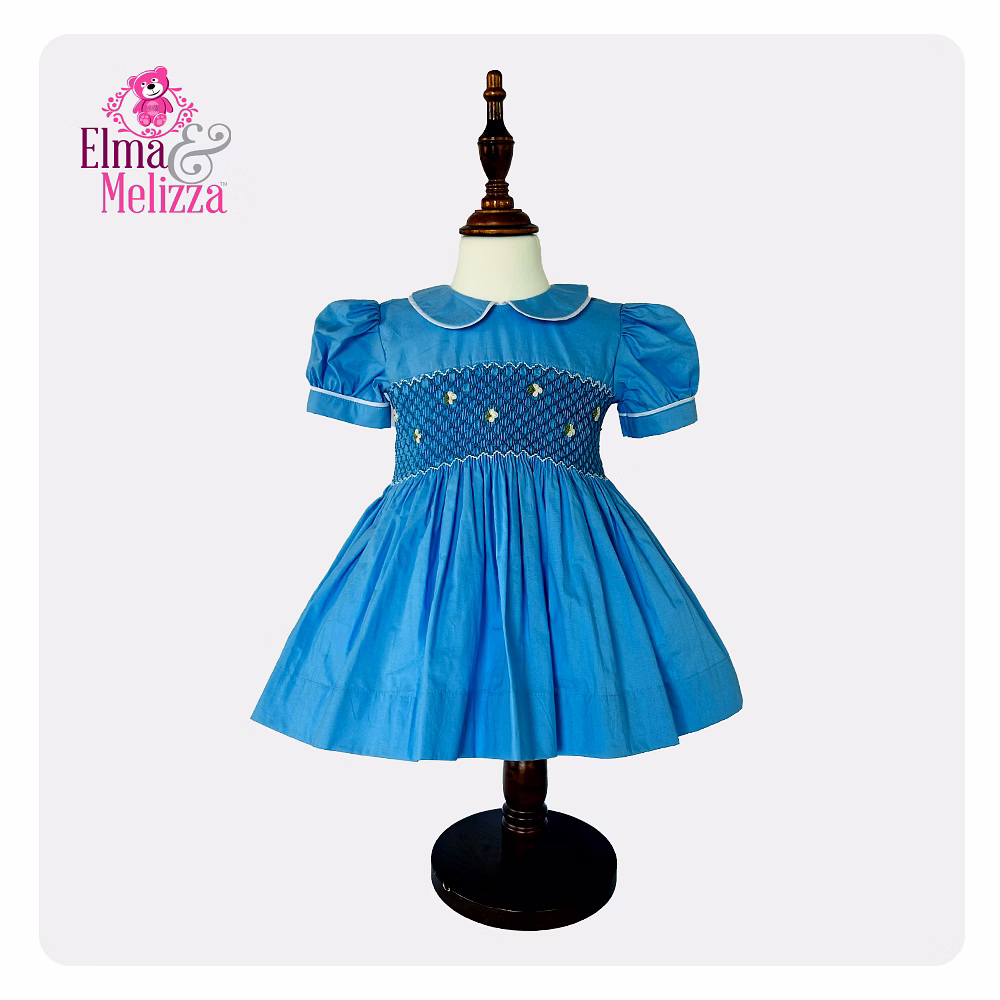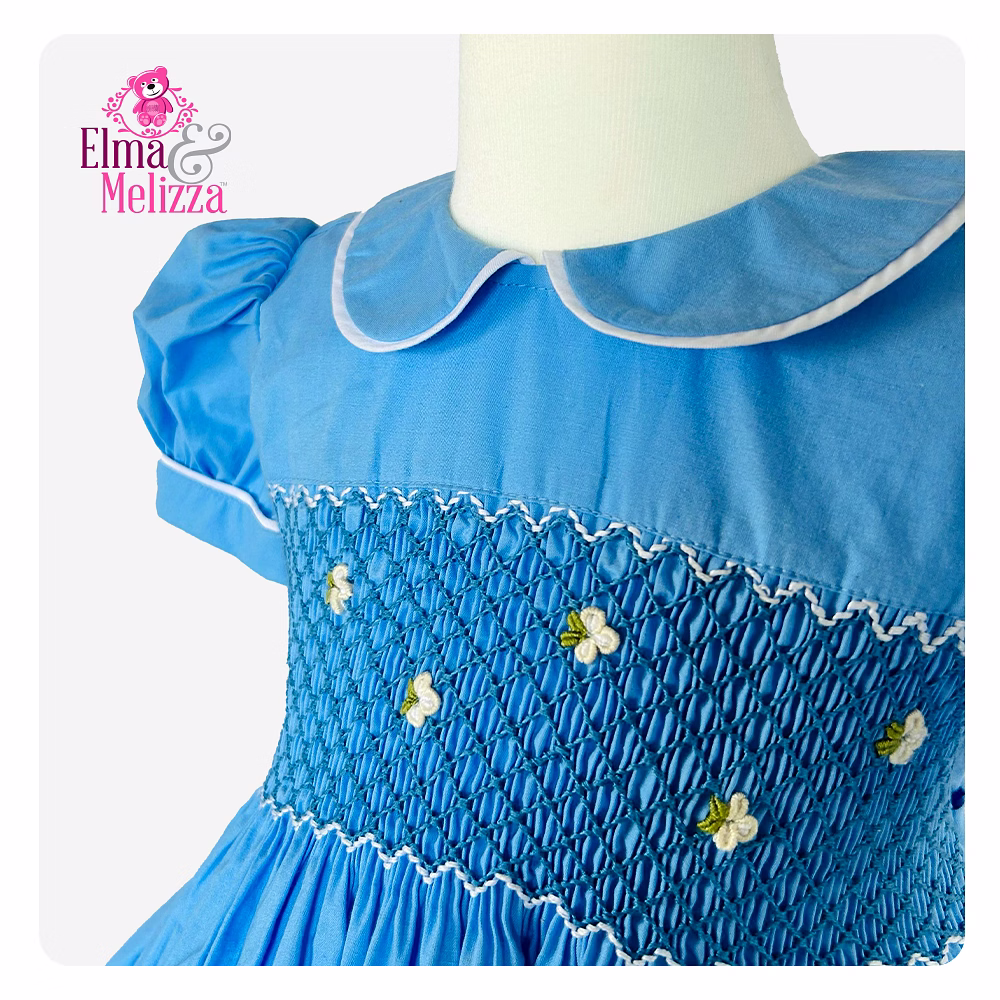 Every stitch tells a story with this lovingly handmade dress. The hand-smocked panel is artfully adorned with delicate white embroidered flowers, adding artisanal texture and gentle elegance. A classic Peter Pan collar trimmed in white frames your little oneโ€™s face with vintage flair, while the puffed sleeves offer a soft, angelic silhouette. Fully lined for comfort and complete with adjustable waist ties, this dress ensures a flattering fit as your child grows, creating not just an outfit, but a keepsake.