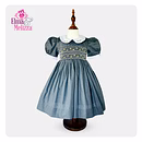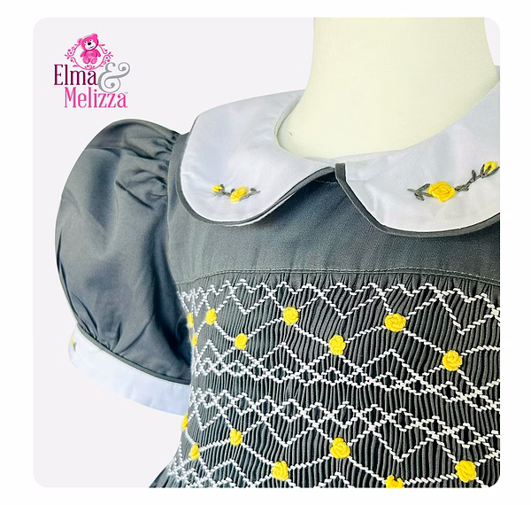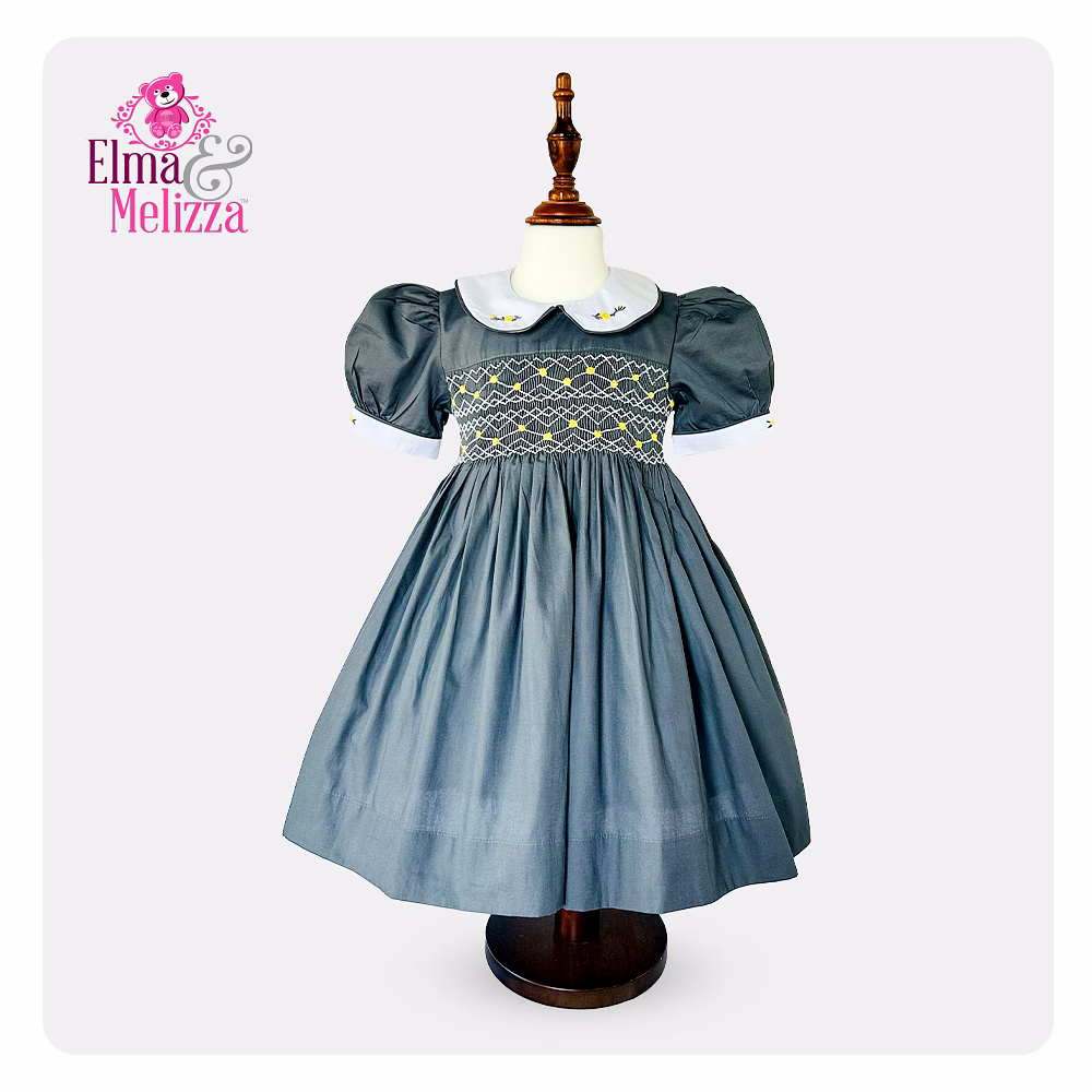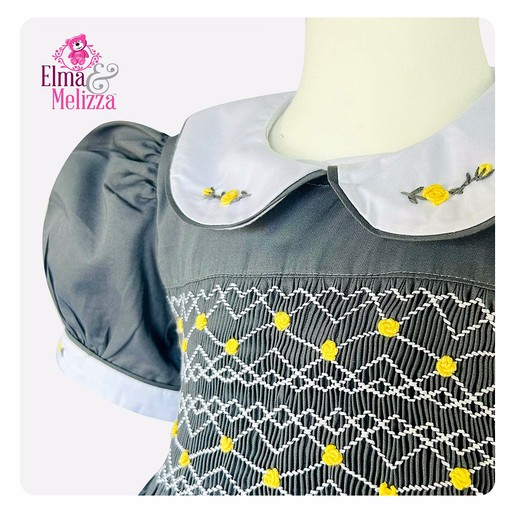 Every detail of this dress speaks of artisanal care and beauty. The hand-smocked chest features fine embroidery in clean white thread, accented with dainty yellow flowers that add a soft, joyful touch. A classic white Peter Pan collar, framed by a dark gray border and detailed with yellow floral embroidery, brings vintage elegance to the design. Complemented by puffed sleeves with white trim and adjustable waist ties for a perfect fit, this dress promises both comfort and classic appeal.