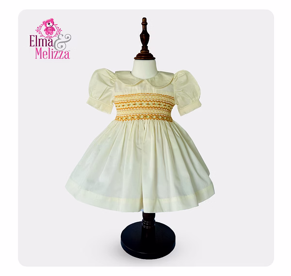 Elevate your little girlโ€™s wardrobe with this Creamy White Hand Smocked Hand Embroidered Baby Girl Dress, the perfect fusion of innocence and elegance. Crafted from soft, breathable cotton, this stunning dress offers unmatched comfort for your baby girl while exuding sophistication with every detail. The pristine creamy white shade sets a graceful tone, while the orange embroidery adds a cheerful burst of colour, perfect for birthdays, weddings, or any photo-worthy moment.