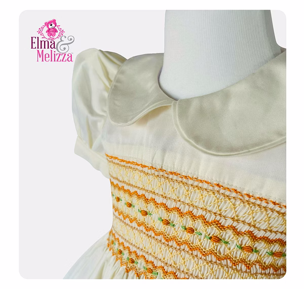 Creamy White Hand Smocked Hand Embroidered Baby Girl Dress with Orange Florals for Birthdays, Weddings & Elegant Family Photoshoots
