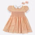 This dress is a work of the heart. The hand-smocked chest is embroidered with delicate orange florals, adding artisanal depth to its refined design. The creamy white Peter Pan collar and puffed sleeves enhance the classic silhouette, offering a timeless look that never goes out of style. Designed with adjustable waist ties and a soft inner lining, this handcrafted piece ensures a secure fit and lasting comfort for active little ones.