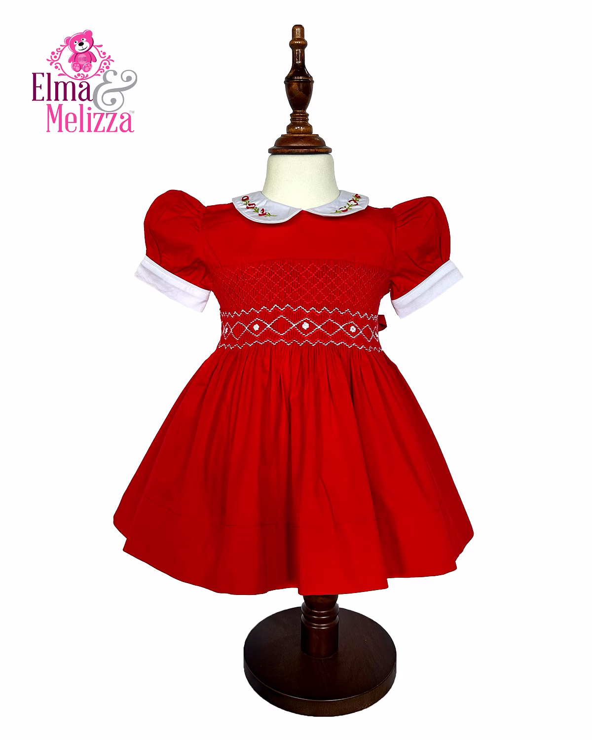 Celebrate traditional craftsmanship with exquisite hand-smocked embroidery across the bodice, featuring delicate white rose motifs that add a sweet, vintage flair. The pure white Peter Pan collar, adorned with subtle rose embroidery, frames your baby's face beautifully, while the charming puffed sleeves edged in white give the dress a soft, elegant finish. This embroidered baby girl dress is a keepsake-worthy piece designed to be cherished for years to come.