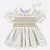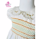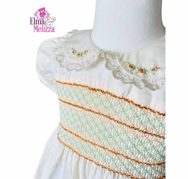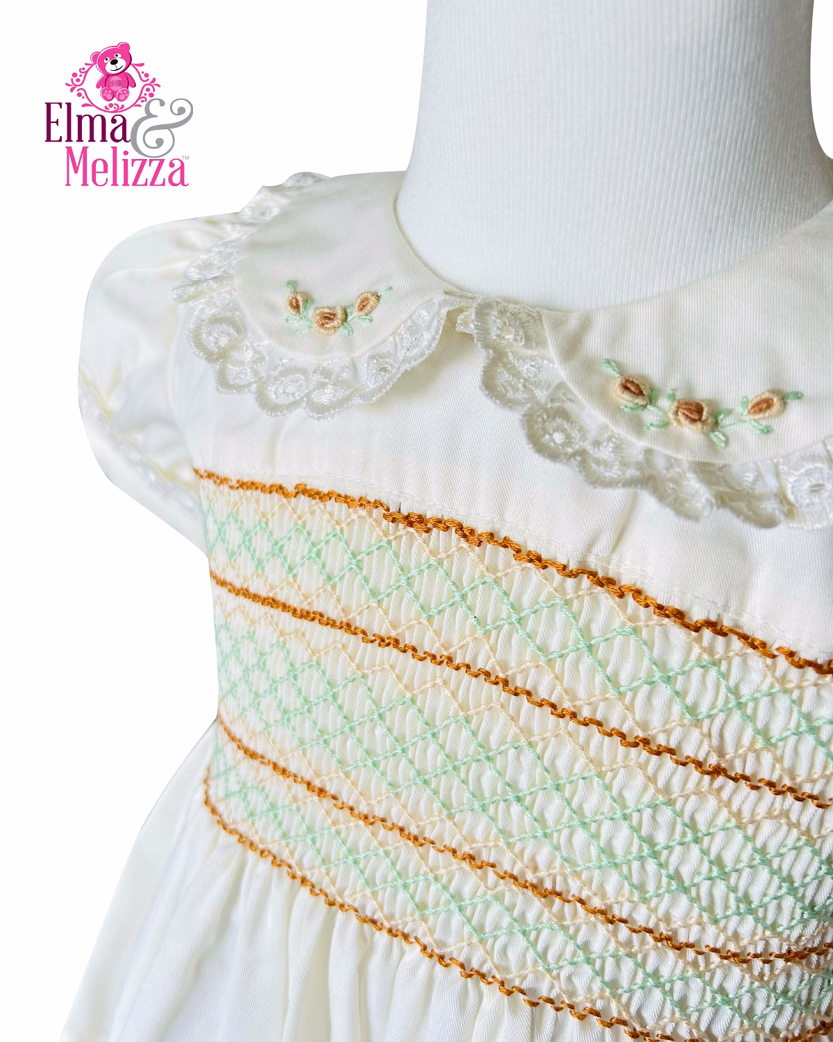 At the heart of this dress lies a masterpiece of hand-smocked artistry, stitched in gentle hues of brown, green, and light yellow, bringing texture and depth to the bodice. The Peter Pan collar adds a vintage touch with lace borders and subtle floral embroidery, while the puffed sleeves with matching lace trim enhance its soft, classic charm. Every detail is carefully considered for a handcrafted finish that feels luxurious and one-of-a-kind.