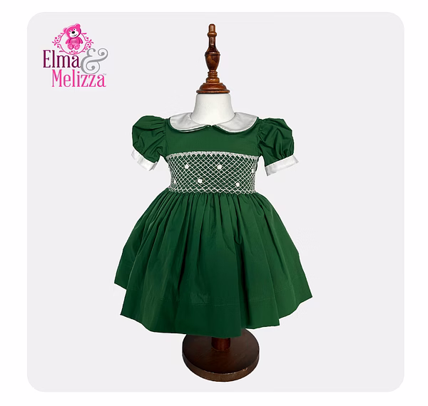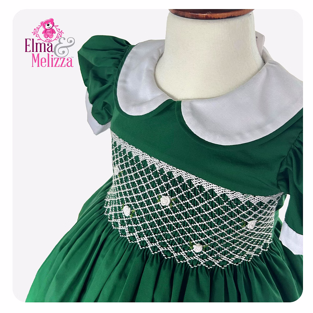 Accentuated with intricate hand-smocked white embroidery, the dress's bodice showcases stunning white rose motifs that add charm and sophistication. A classic white Peter Pan collar complements the rich forest green base, bringing a vintage-inspired flair that enhances your baby girl's natural sweetness and makes her shine during every special occasion.