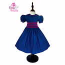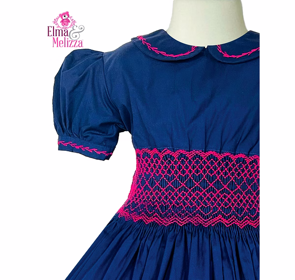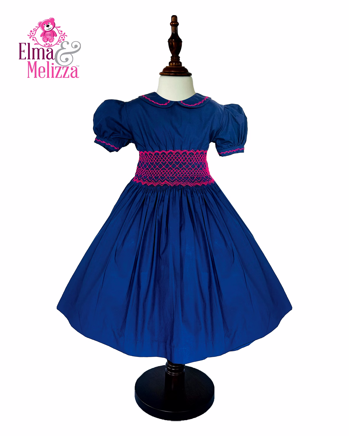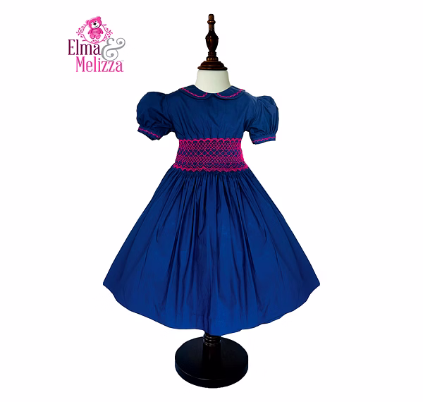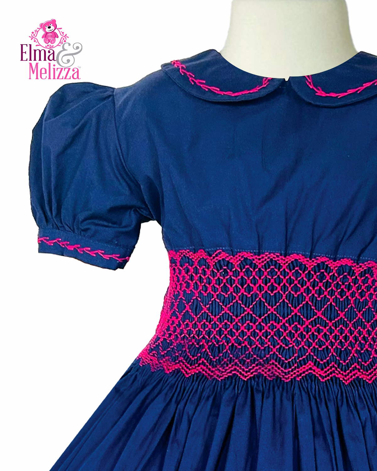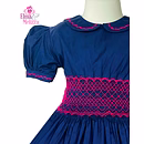 The intricately hand-smocked chest, delicately embroidered in dark pink thread, offers a sophisticated contrast against the deep blue fabric. This artisanal touch adds depth, elegance, and a dash of colour, elevating the dress to heirloom status. The Peter Pan collar and puffed sleeves are tastefully embroidered with matching pink lines, blending simplicity with thoughtful accents that draw the eye and warm the heart.