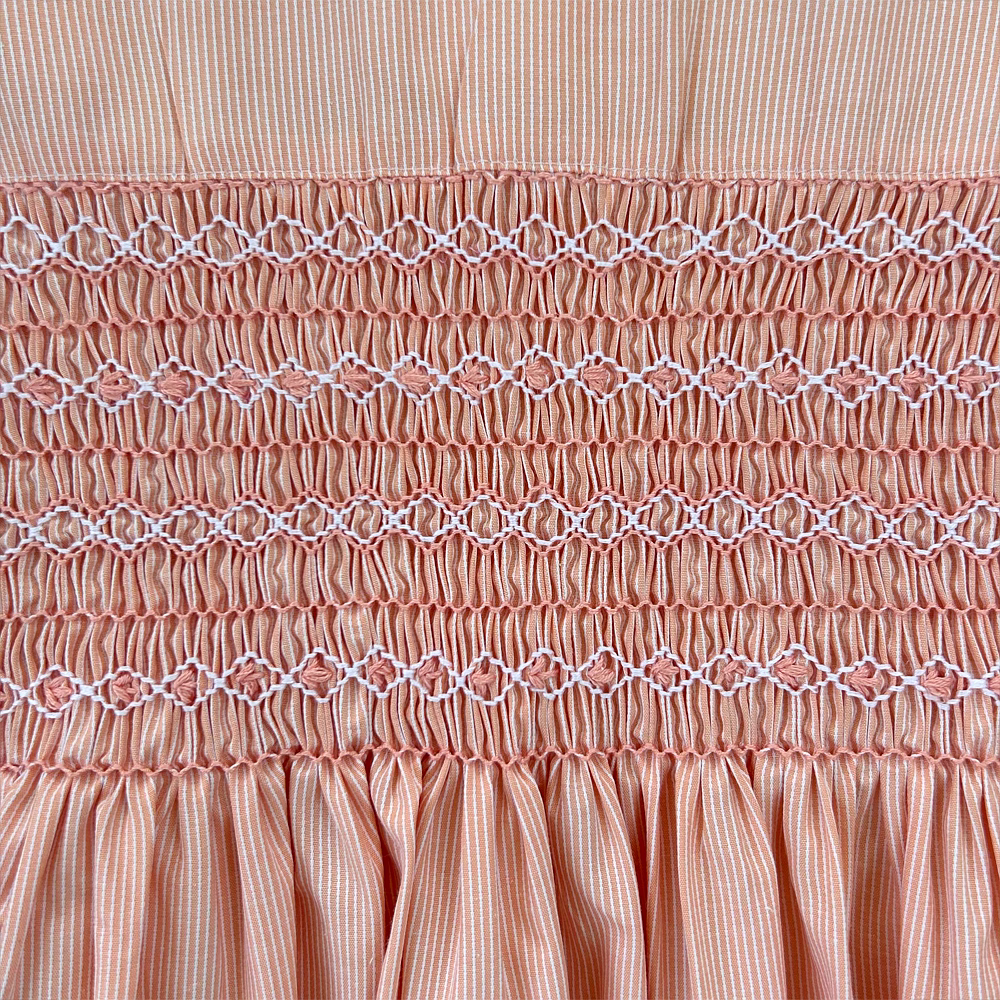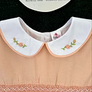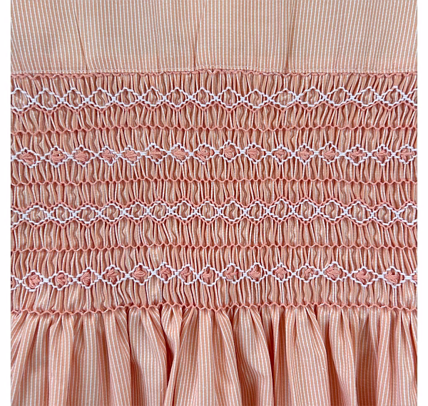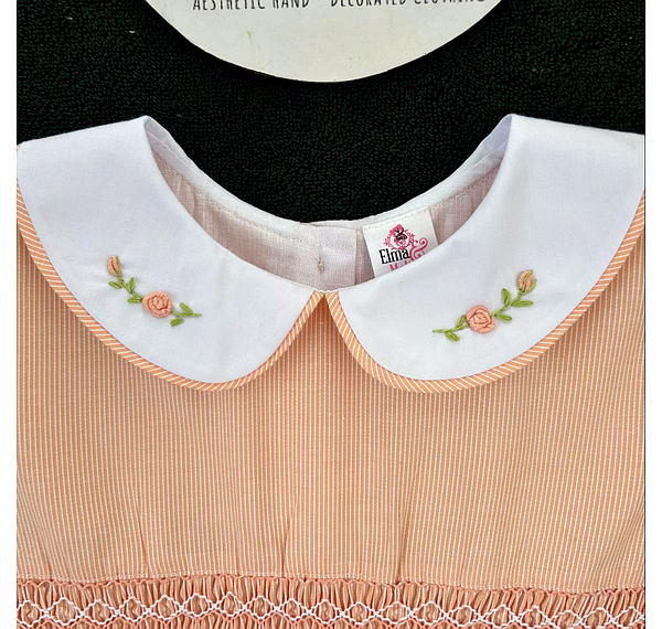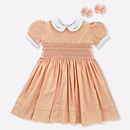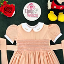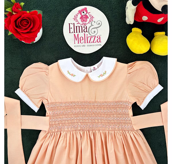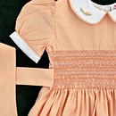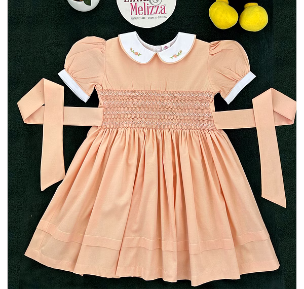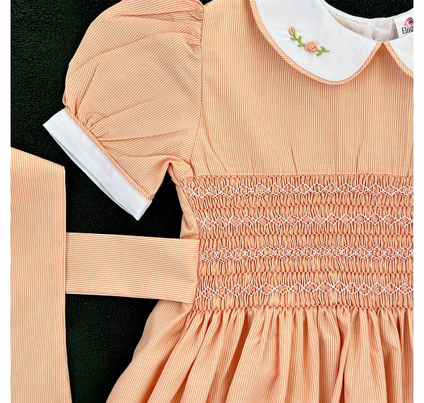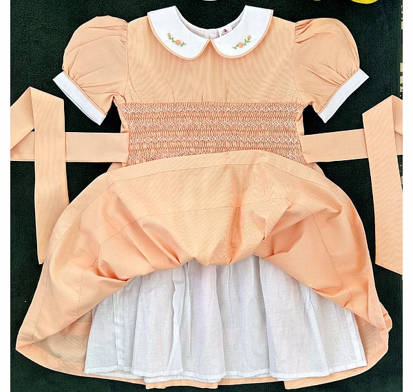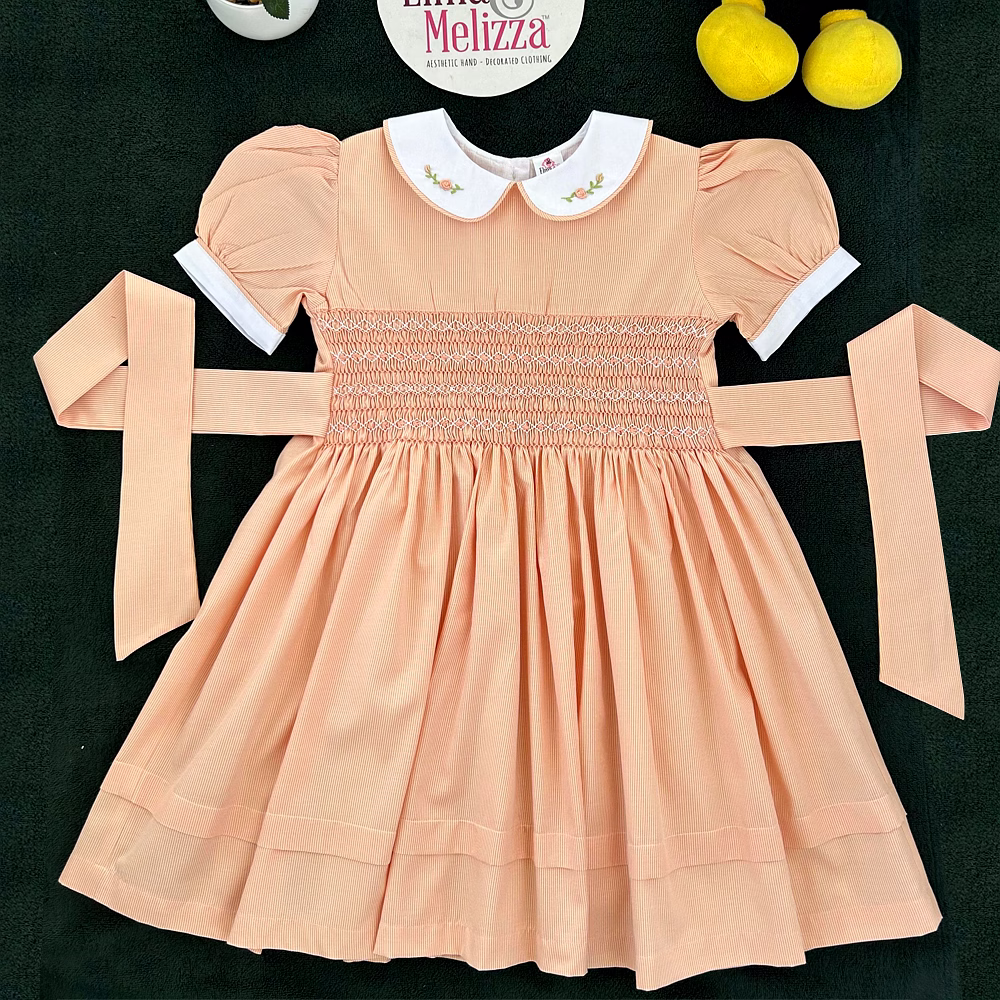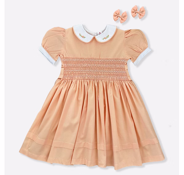 Design Features: Hand-smocked and hand-embroidered.Elegantly designed with a white Peter Pan collar with flower embroidery, puffed sleeves with a white sleeve band, and a simple light orange and white embroidery design.