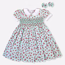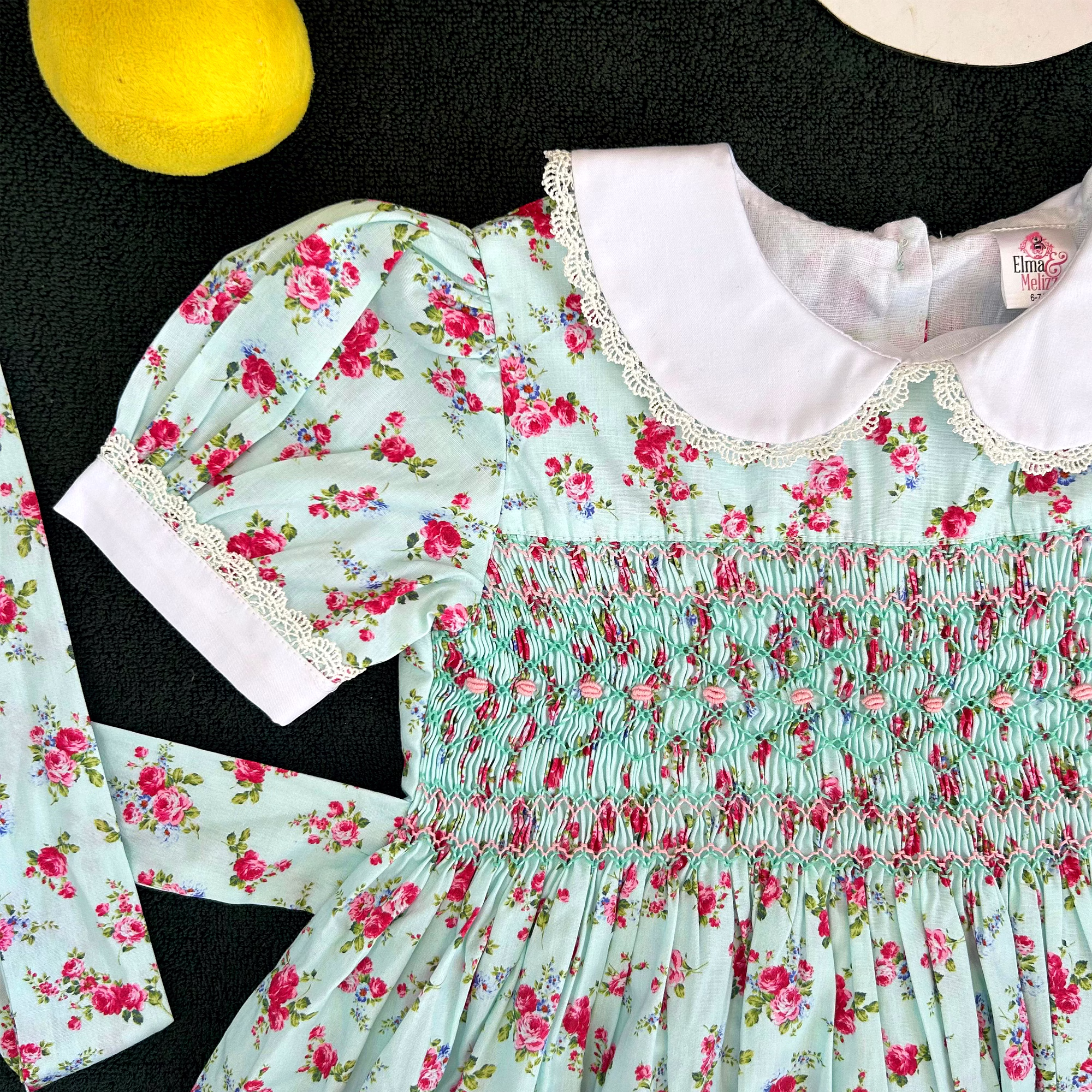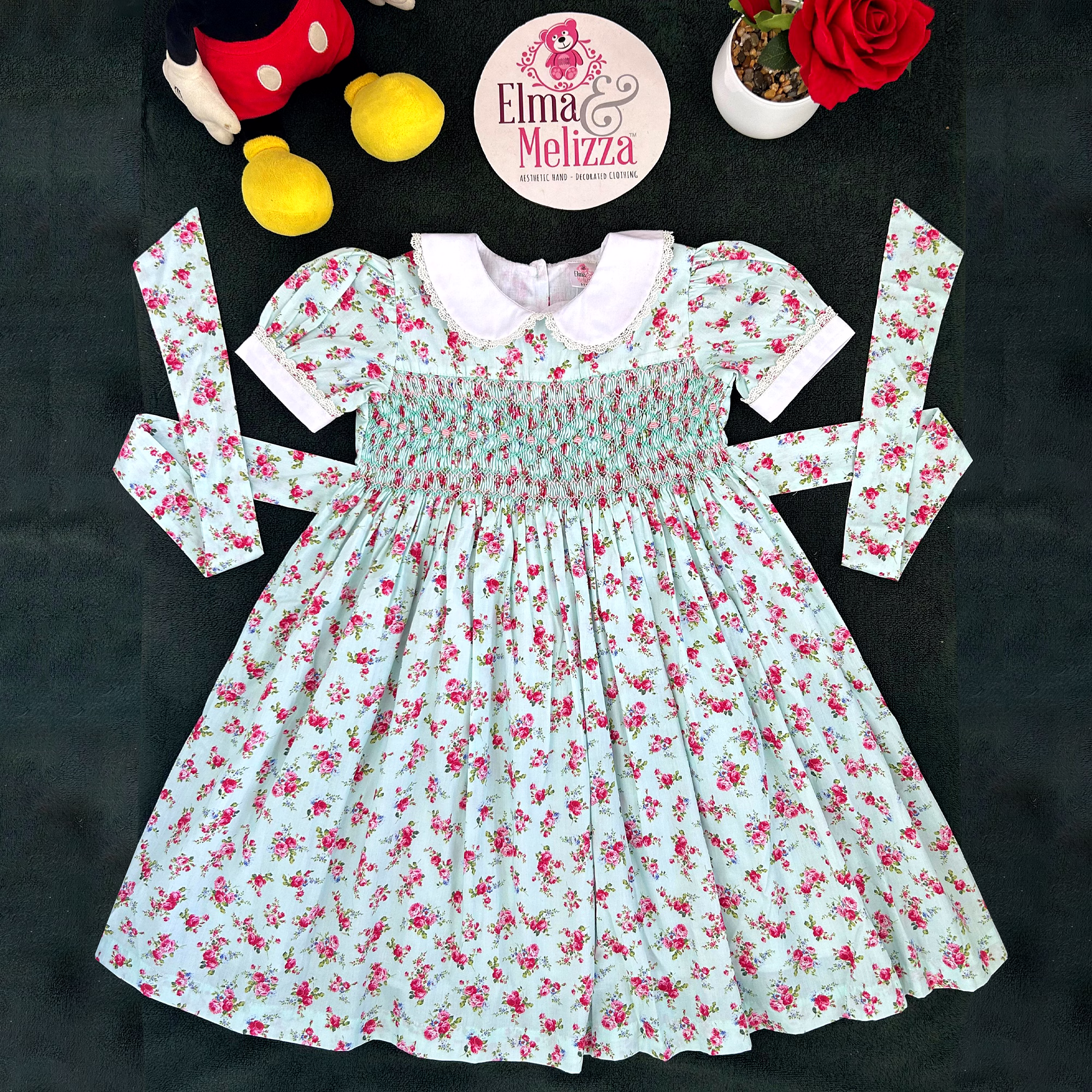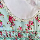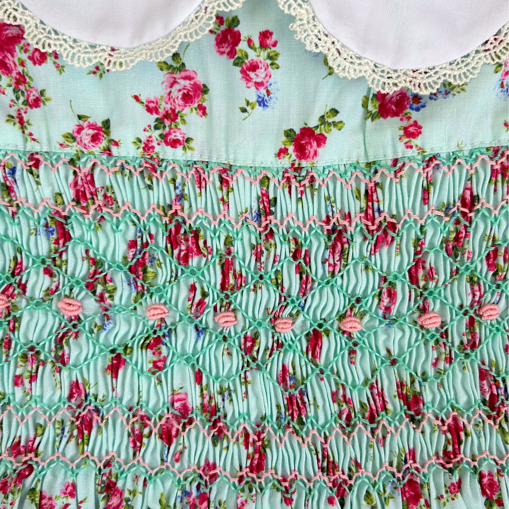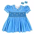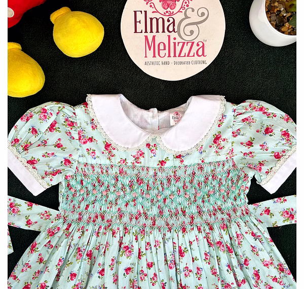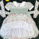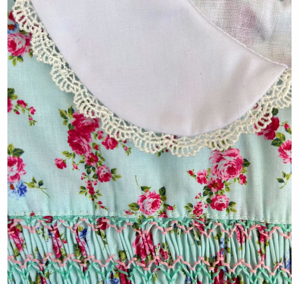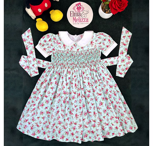Design Features: Hand-smocked and hand-embroidered.Elegantly designed with a white Peter Pan collar, puffed sleeves piped with matching white lace. Charm, simple baby pink and light blue embroidery design.