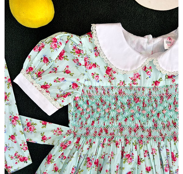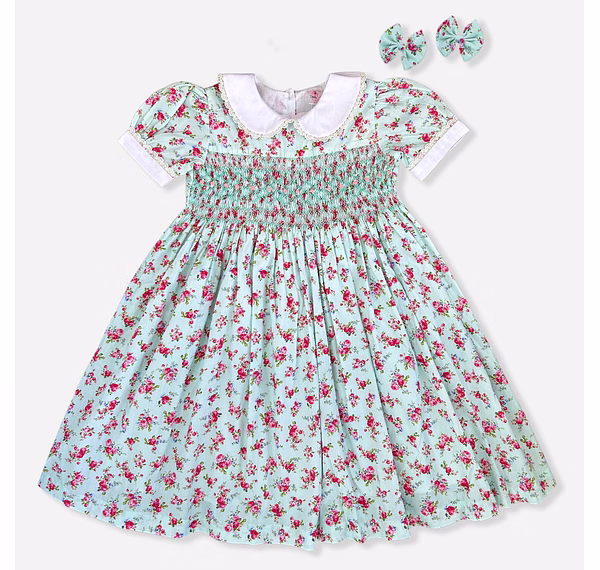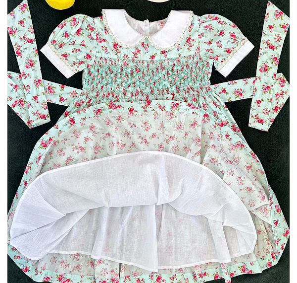 Dress your baby girl in a look that speaks volumes of charm and grace. This light blue floral baby dress is a masterpiece of traditional hand smocking and delicate embroidery, offering a vintage-inspired silhouette with modern comfort. The intricate pink and green embroidered flowers over soft cotton create a timeless style that stands out at weddings, birthdays, and holiday photoshoots. Every detail—from the white Peter Pan collar to the puffed sleeves—radiates elegance that turns memories into keepsakes.