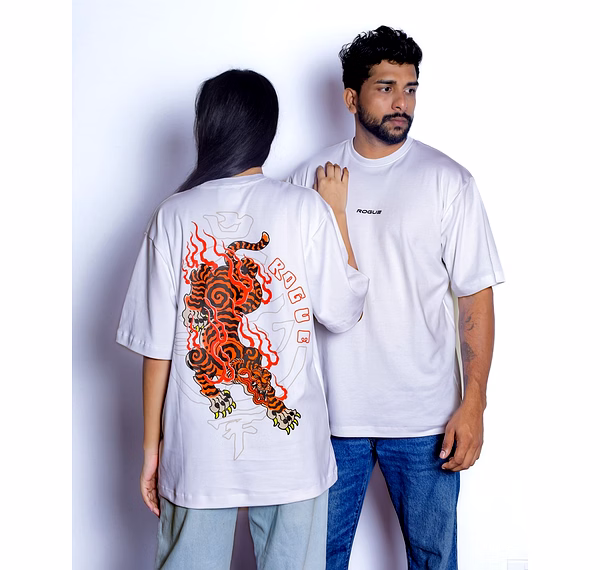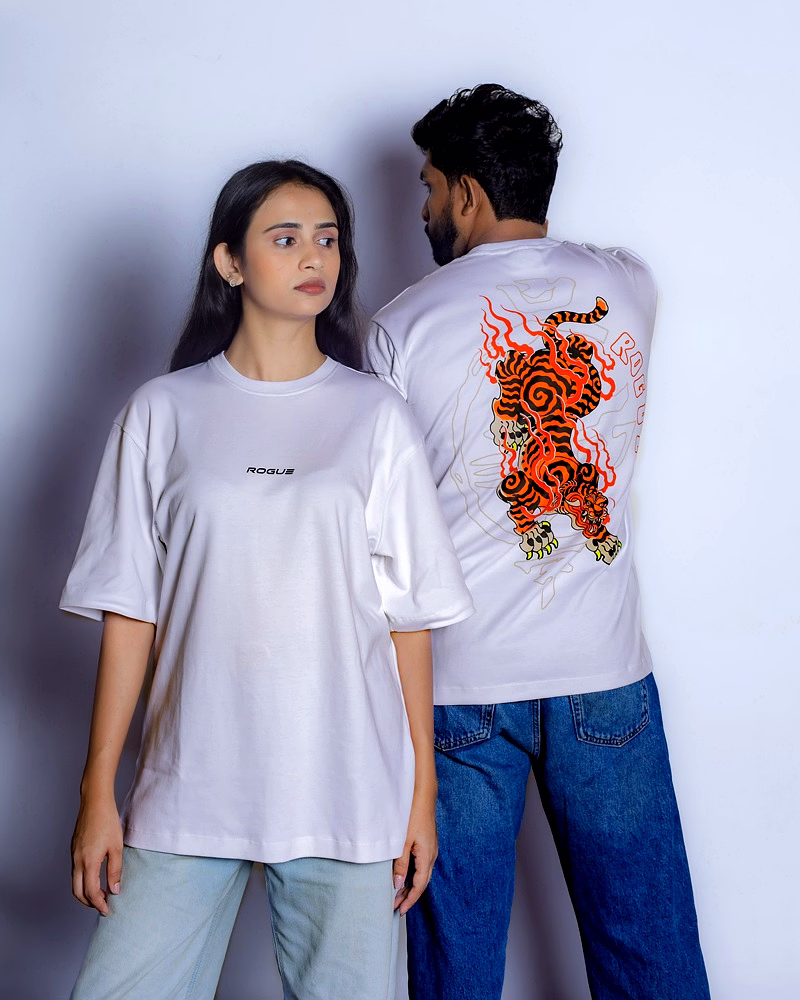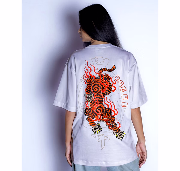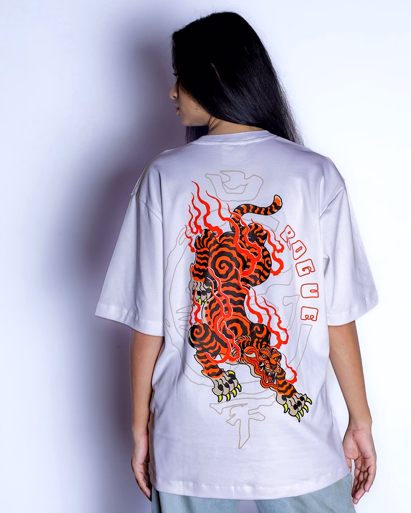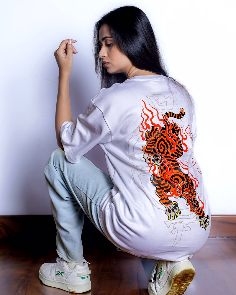 Unleash your fearless energy with the Blazing Tiger Oversized Unisex Tee. This isn't just a shirt—it's a canvas for your untamed spirit. Against a crisp white background, a magnificent tiger roars to life, captured in bold, Japanese-inspired artistry. This striking design is a symbol of strength and individuality, crafted for those who aren't afraid to stand out.