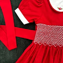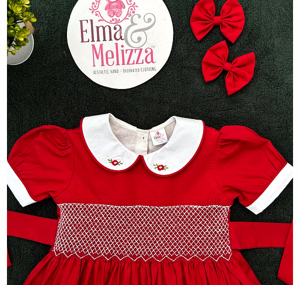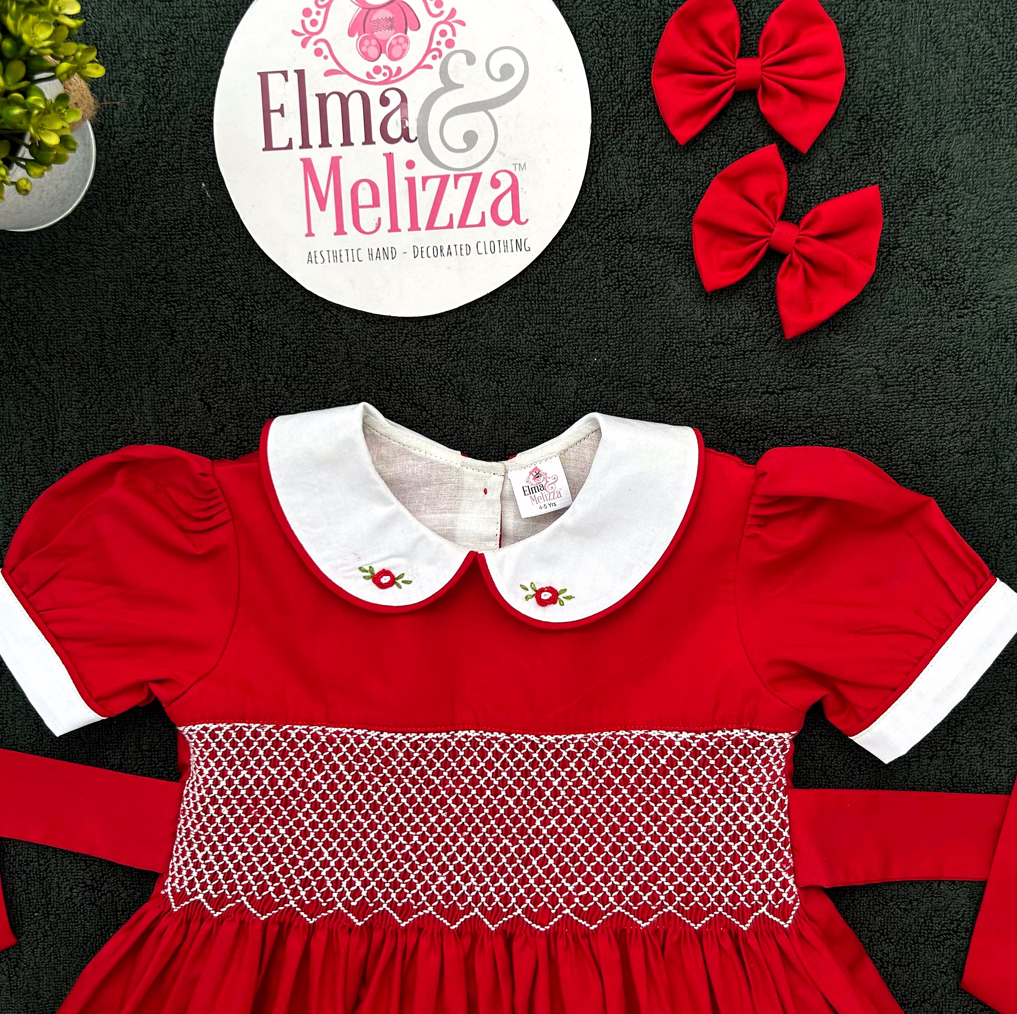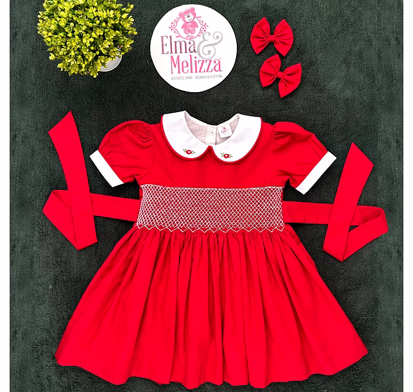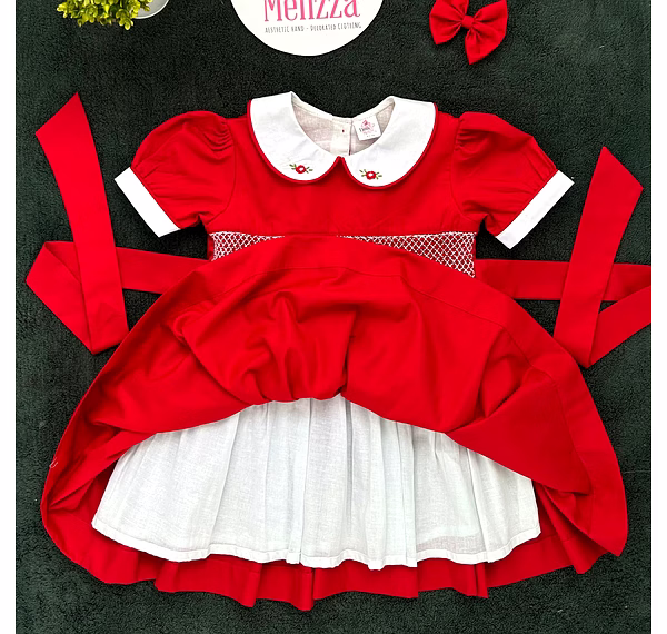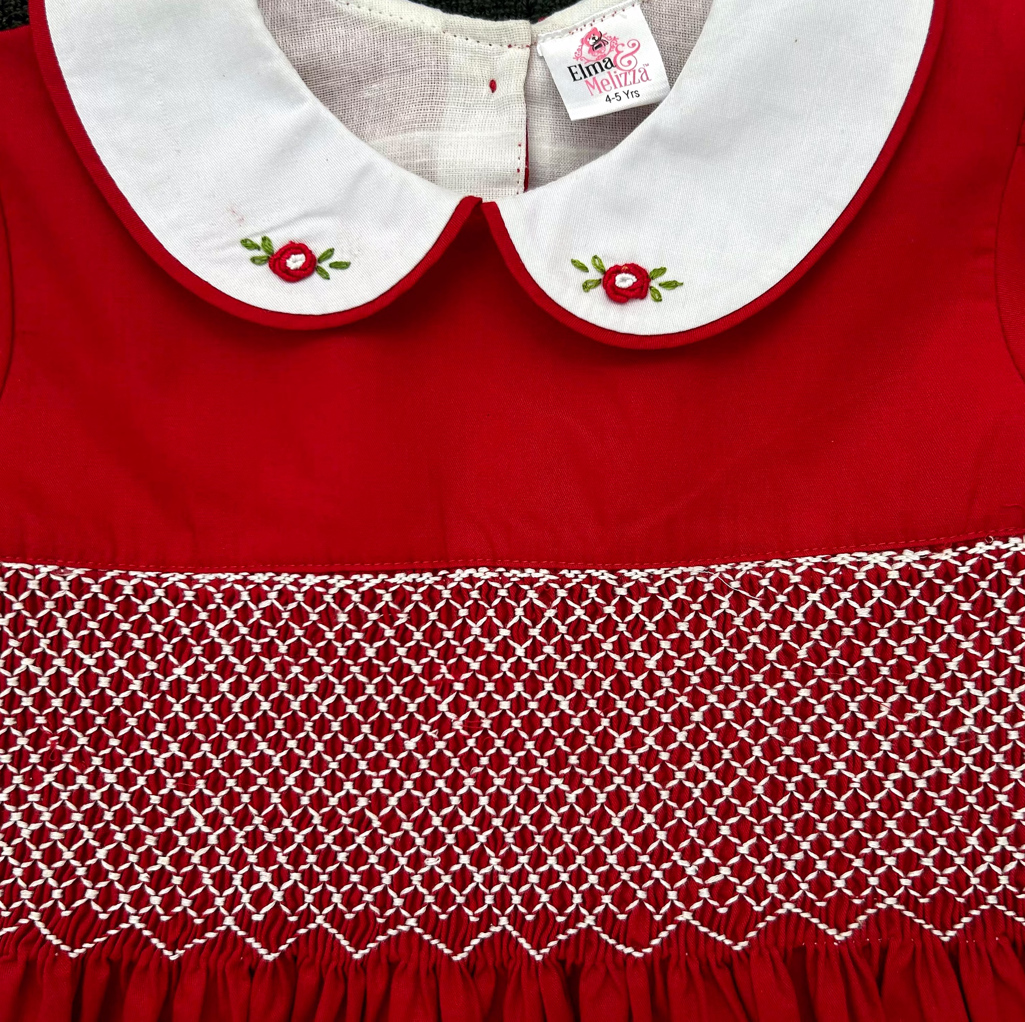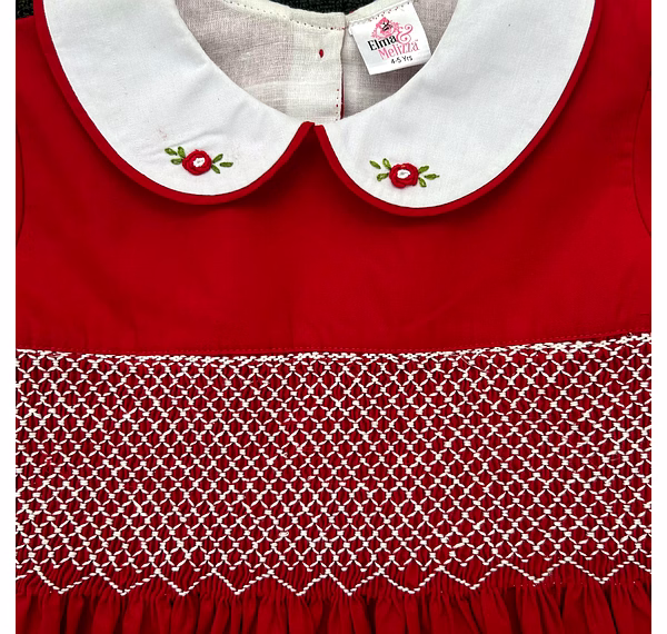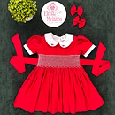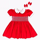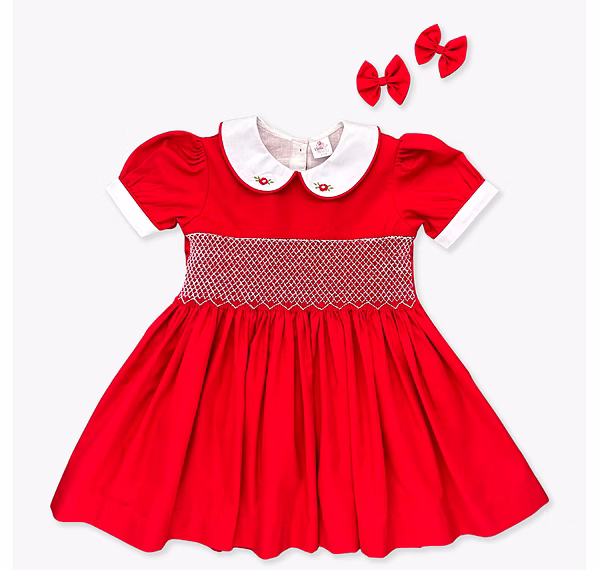 Design Features: Hand-smocked and hand-embroidered.Elegantly designed with a white Peter Pan collar, puffed sleeves piped with matching white lace. Charm, simple white embroidery design.