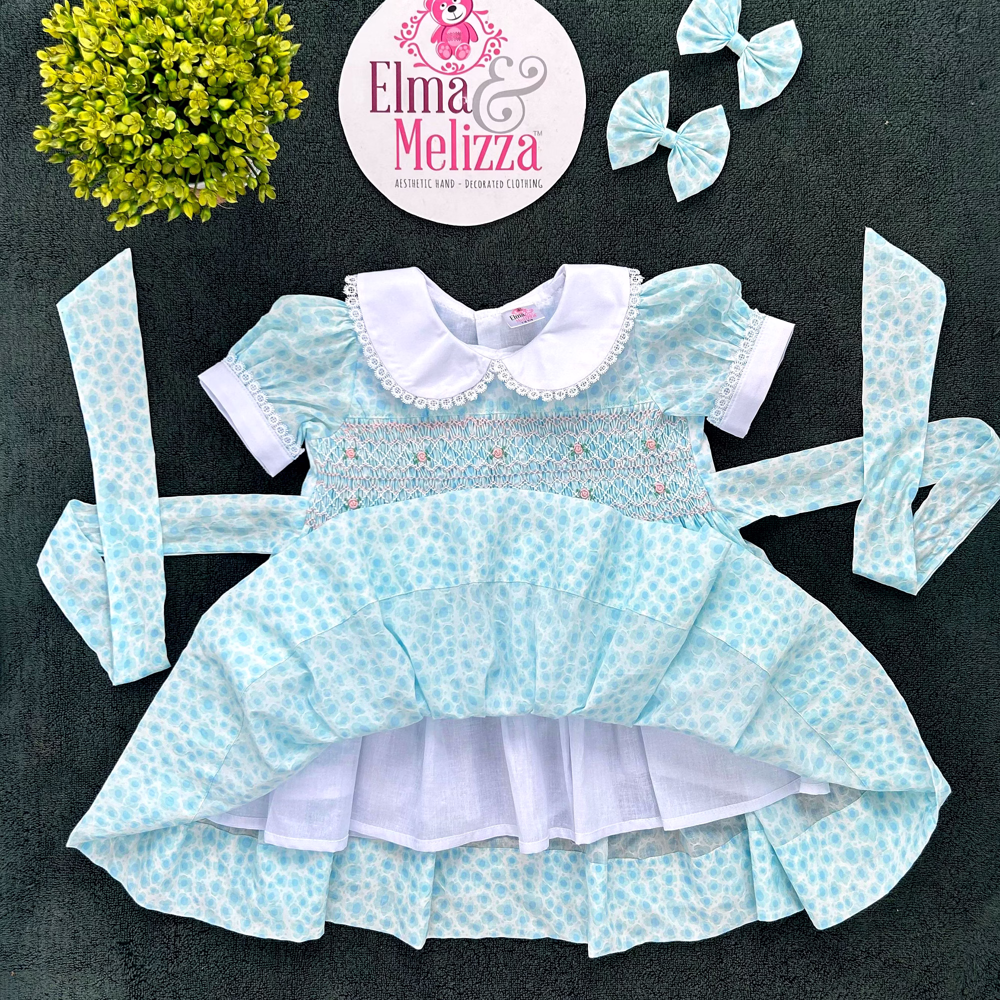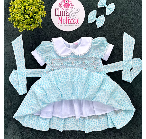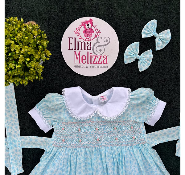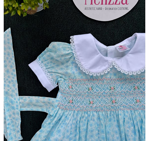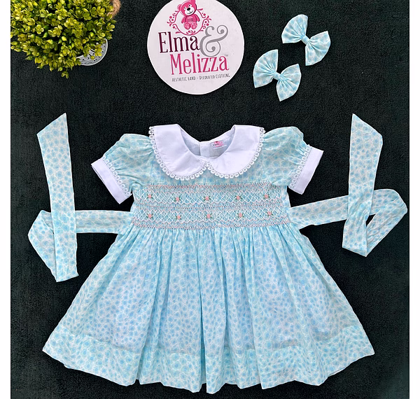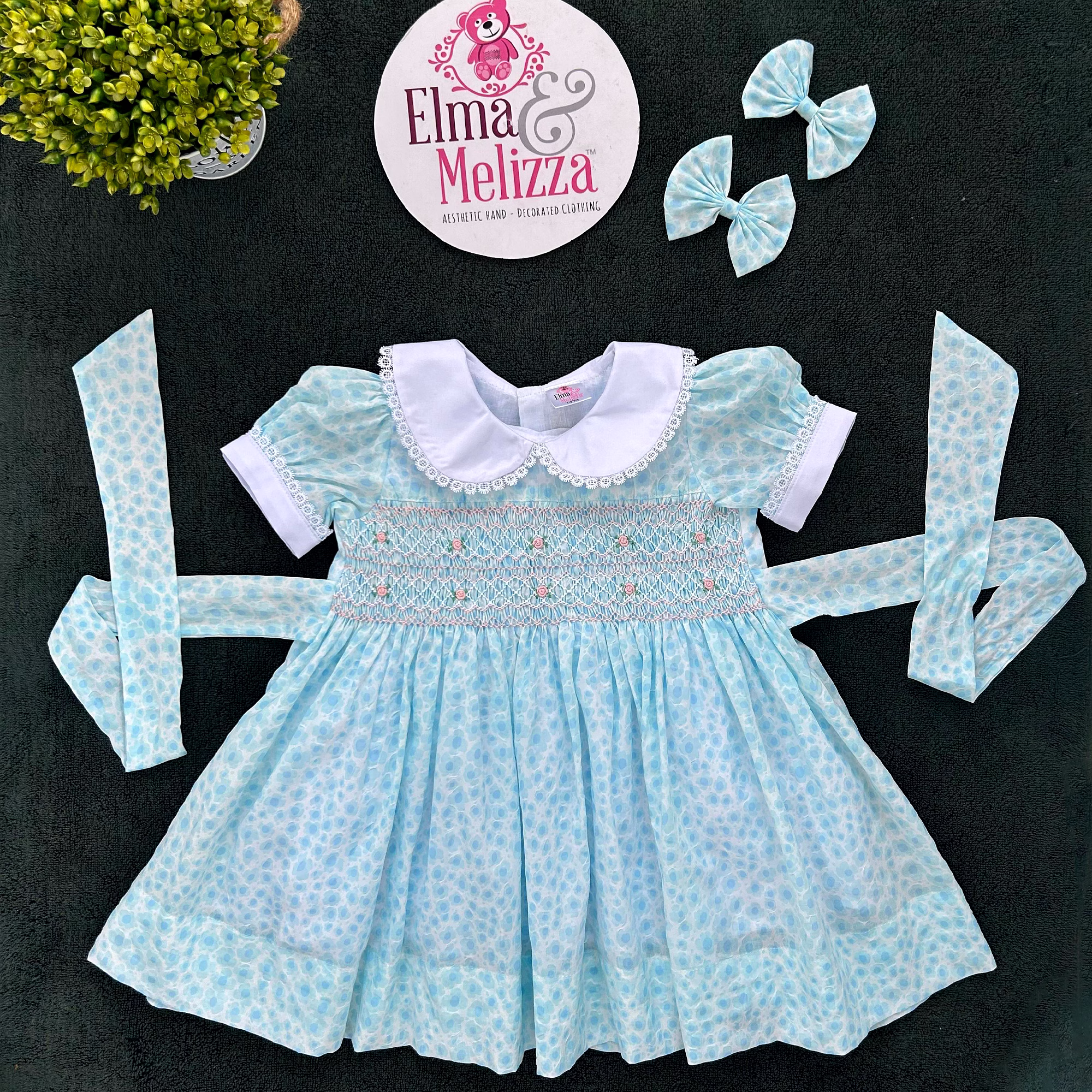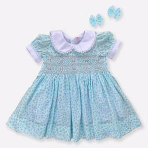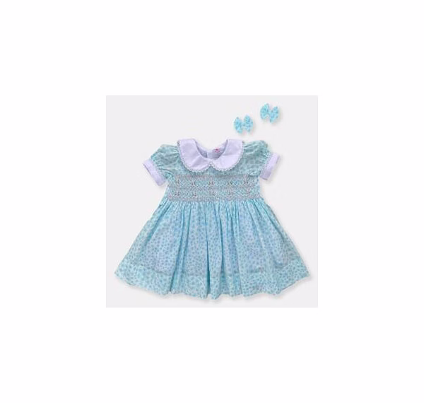 Design Features: Hand-smocked and hand-embroidered.Elegantly designed with a white Peter Pan collar, puffed sleeves piped with matching white lace. Charm, simple baby pink and white embroidery design.