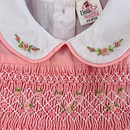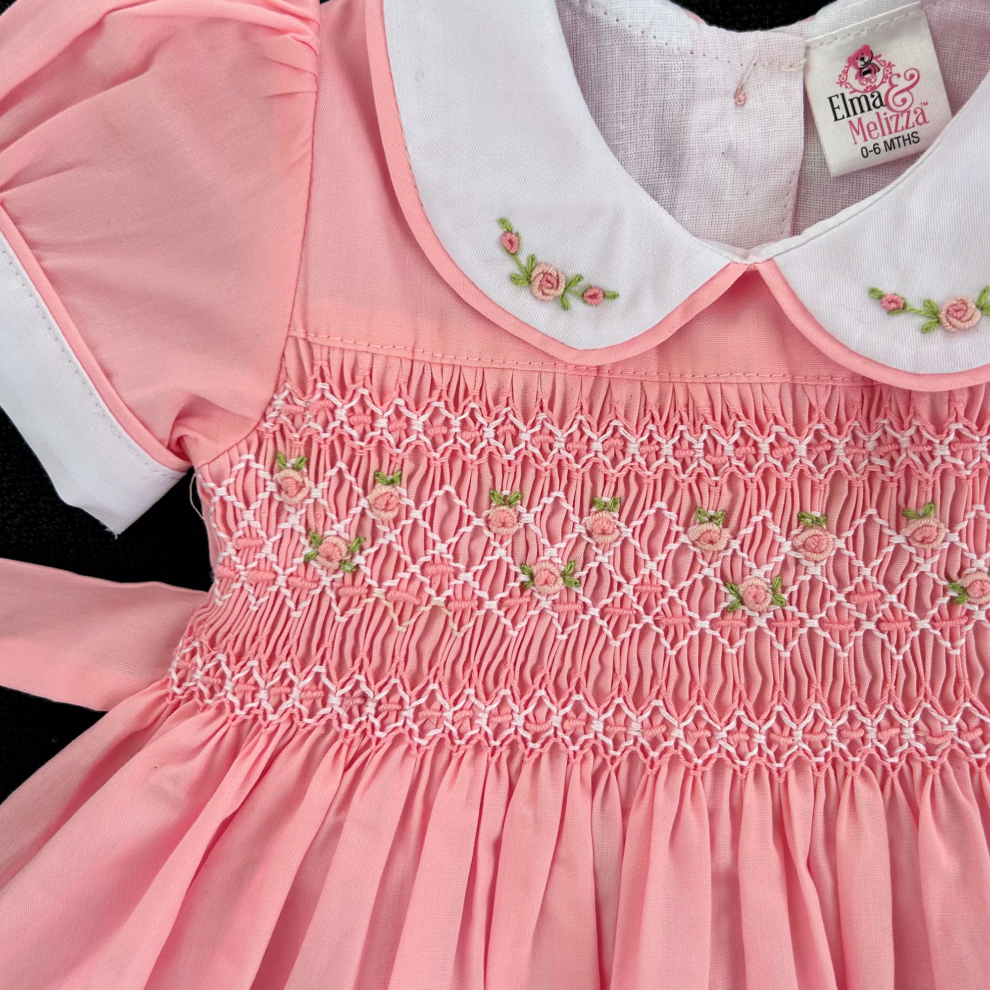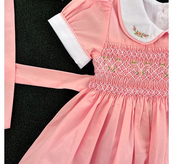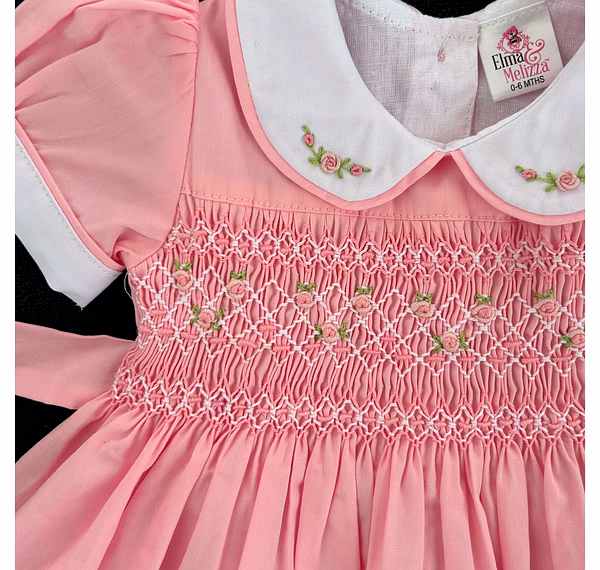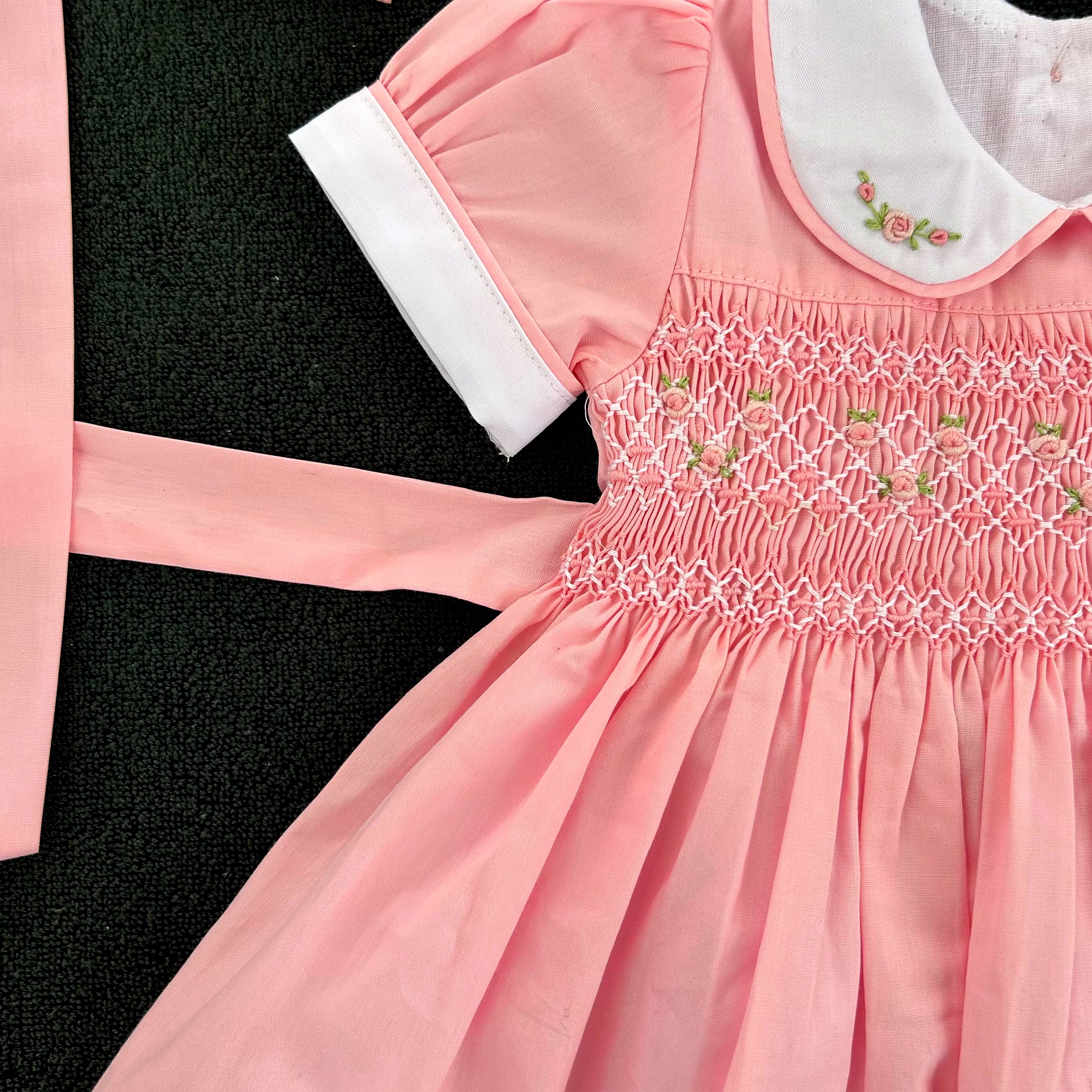 Design Features: Hand-smocked and hand-embroidered.Elegantly designed with a white Peter Pan collar, puffed sleeves with a white sleeve band. Charm, simple pink and white embroidery design.