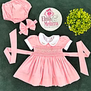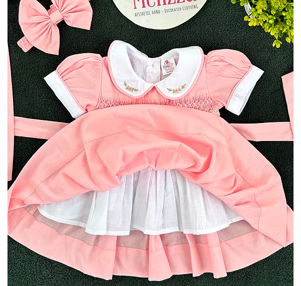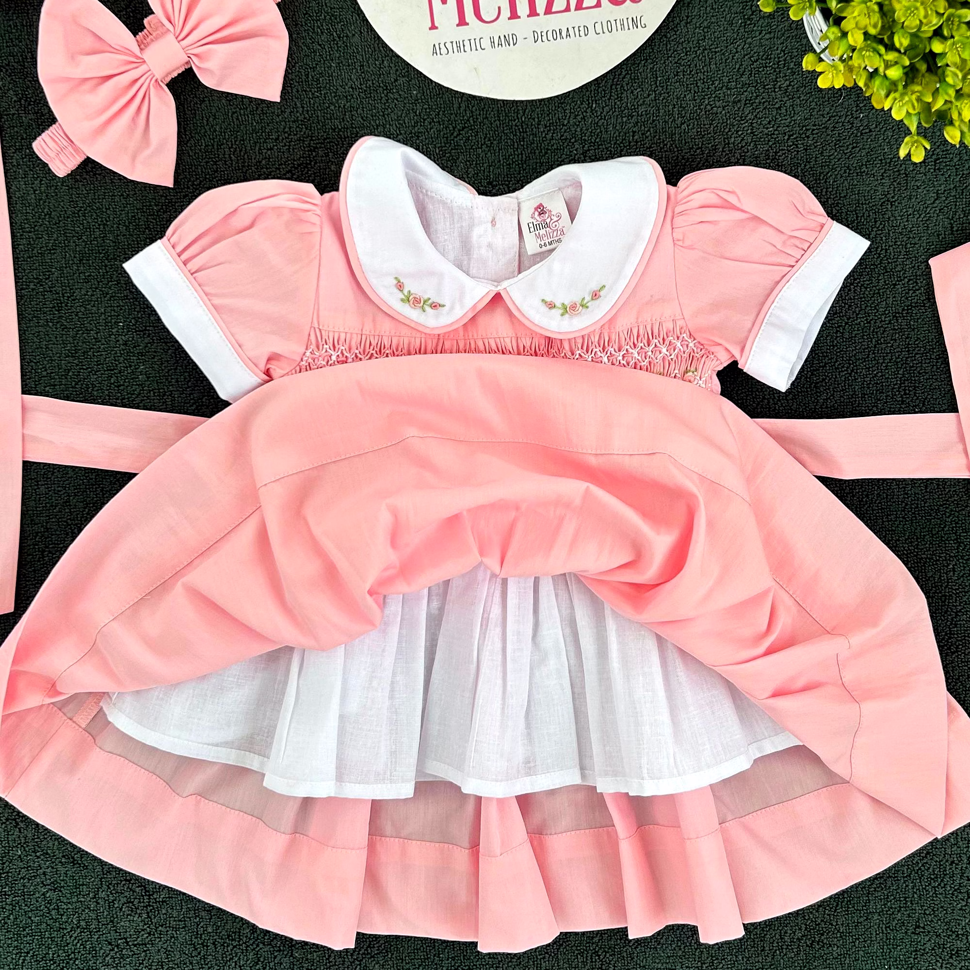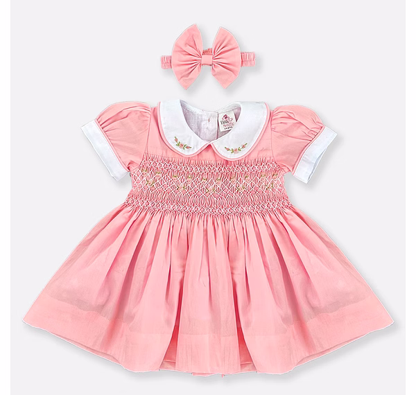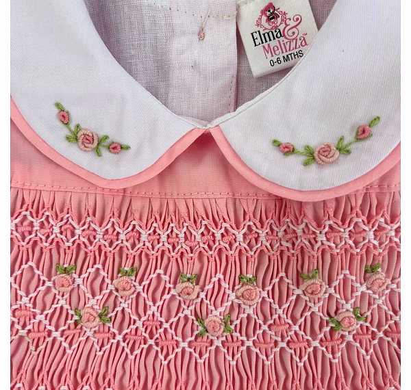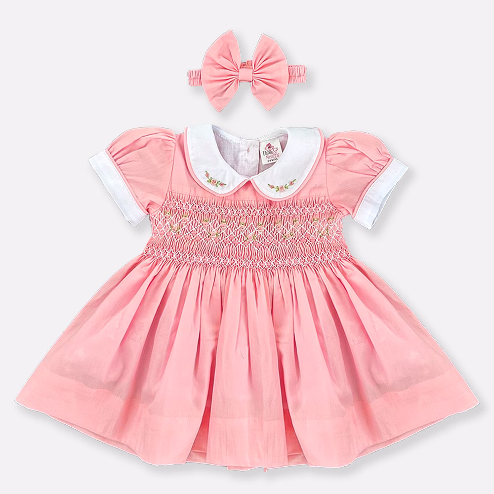 Design Features: Hand-smocked and hand-embroidered.Elegantly designed with a white Peter Pan collar, puffed sleeves with a white sleeve band. Charm, simple pink and white embroidery design.
