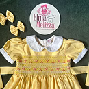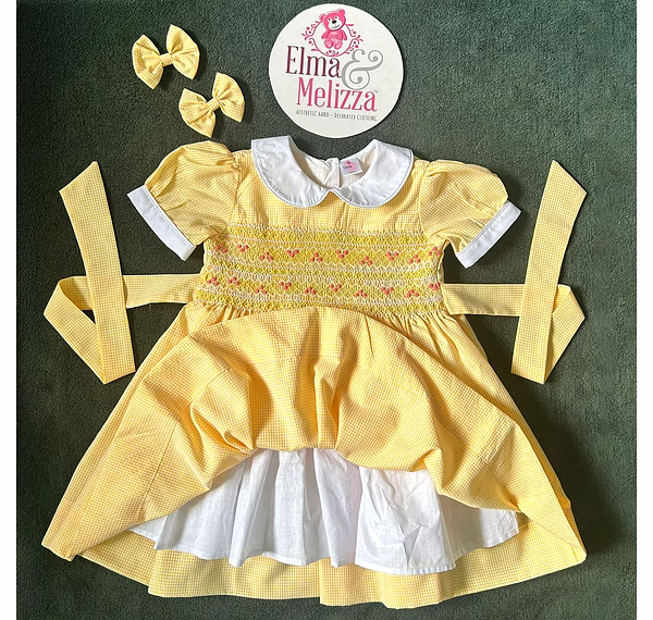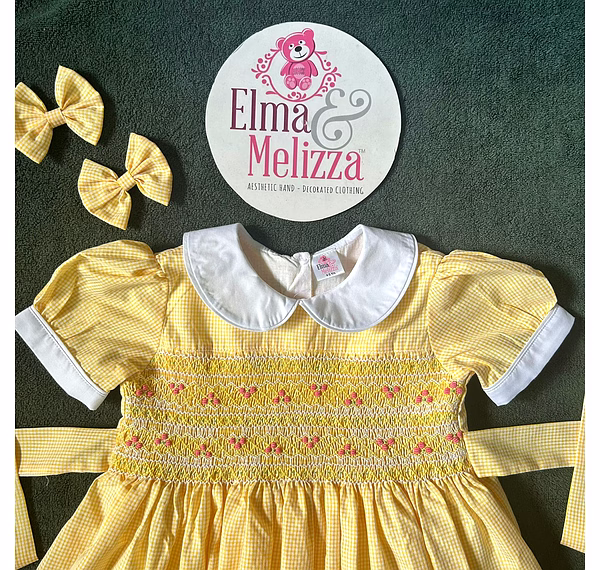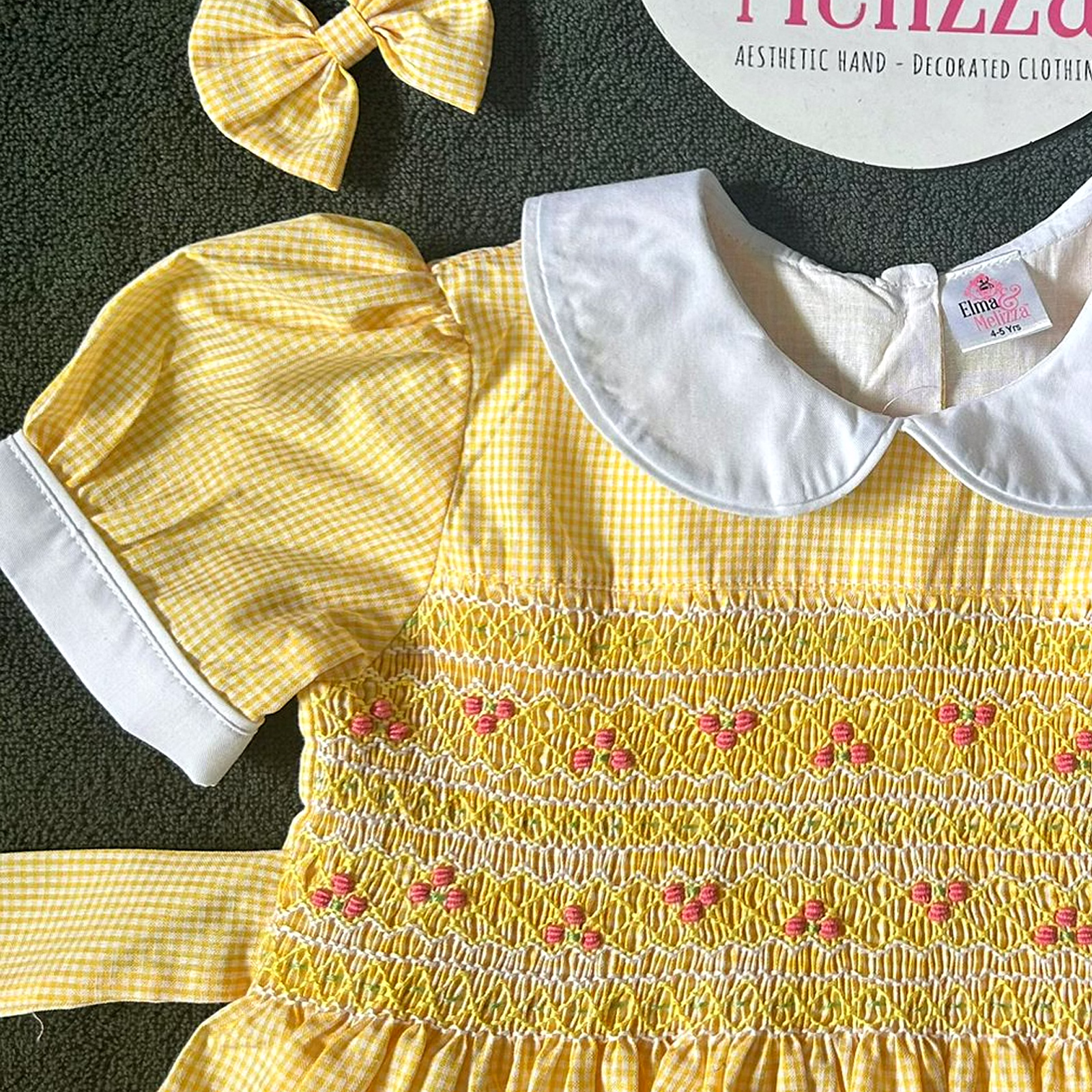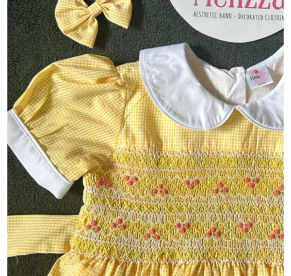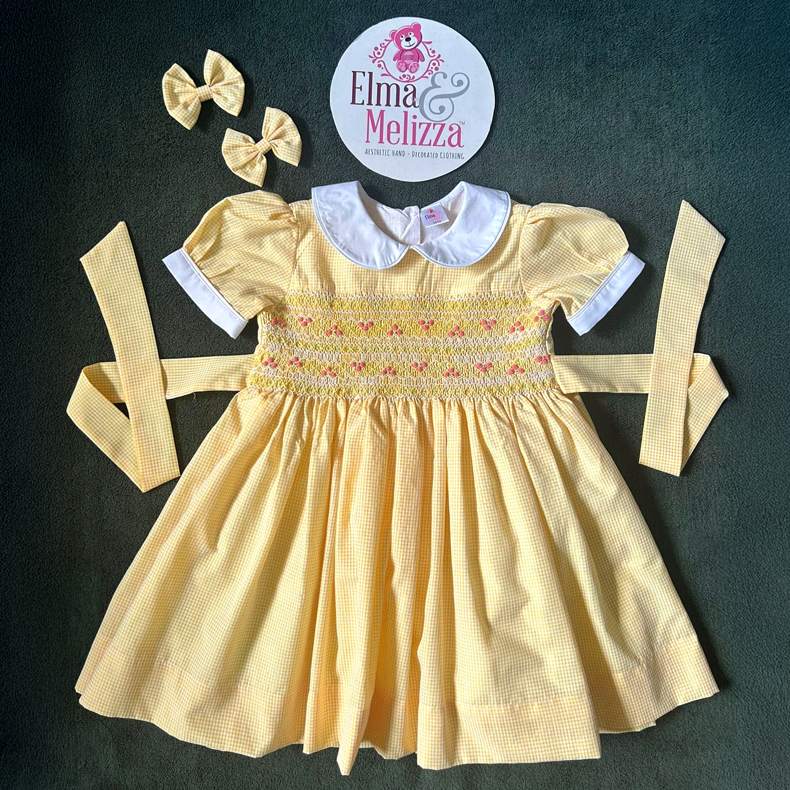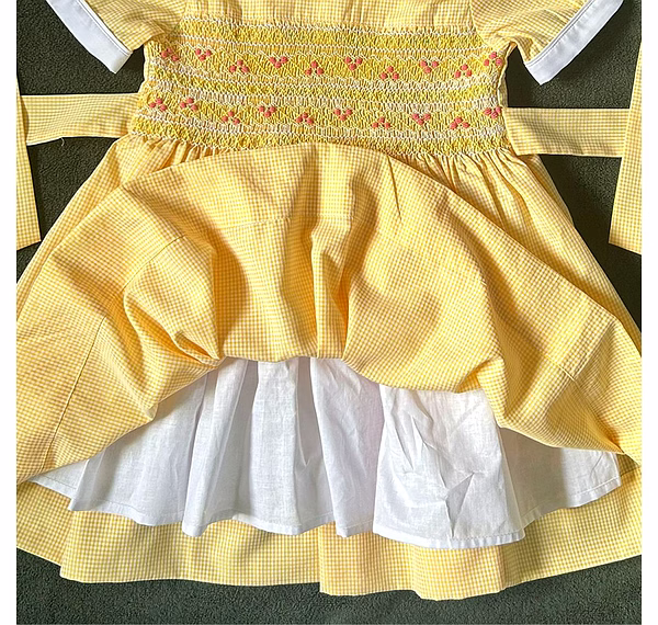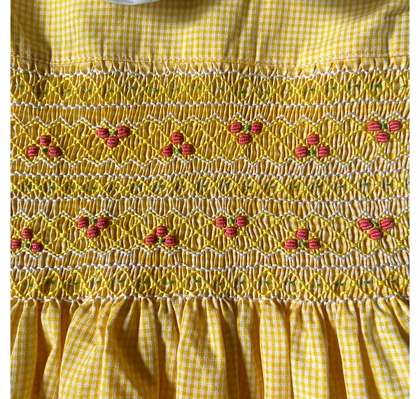 Design Features: Hand-smocked and hand-embroidered. Elegantly designed with a white Peter Pan collar and puffed sleeves. Charm, simple red and white embroidery design.