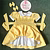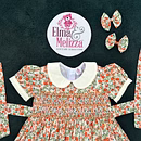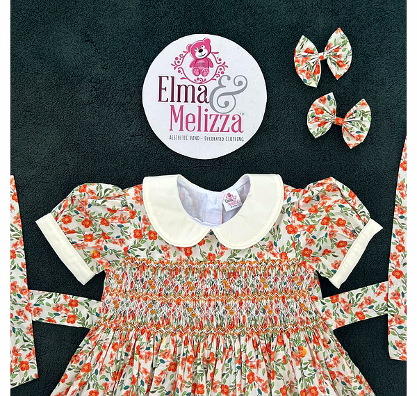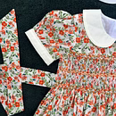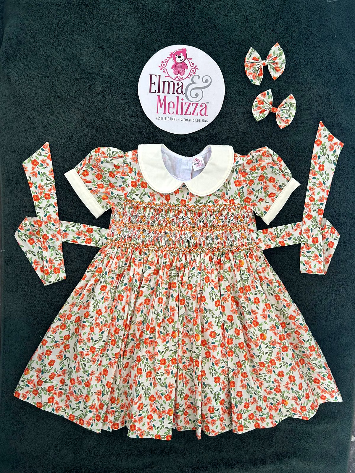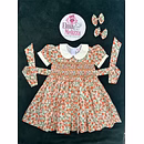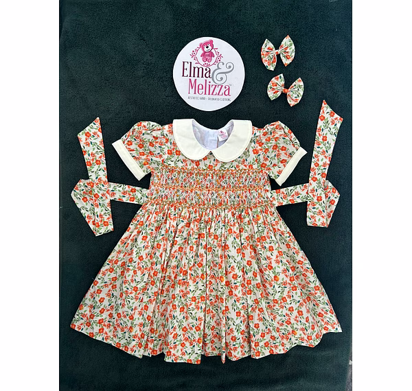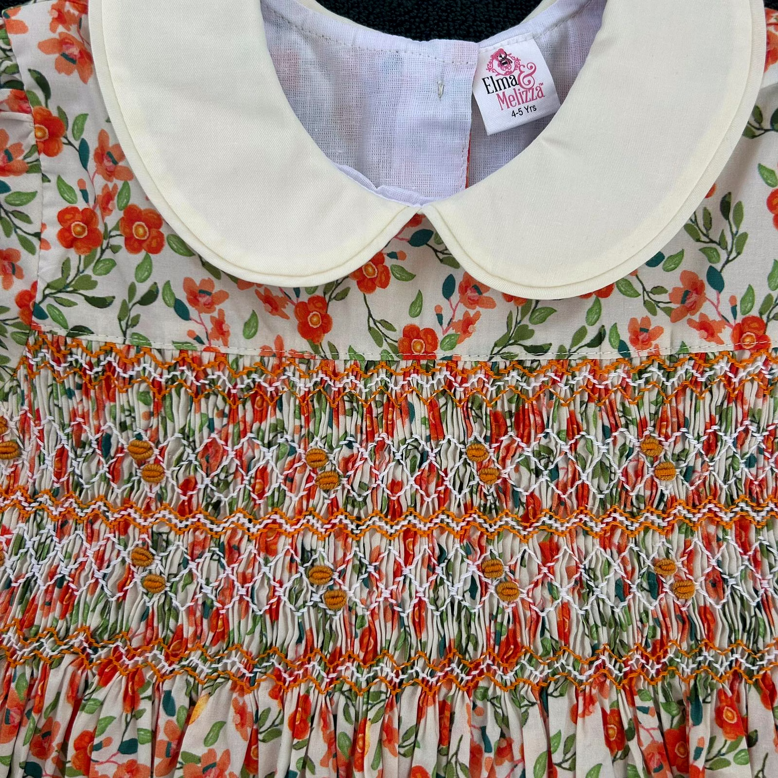 Orange Floral Smocked Peter Pan Collar Dress with Bow Headband, Puff Sleeve Cotton Fit & Flare Vintage Party Dress for Kids