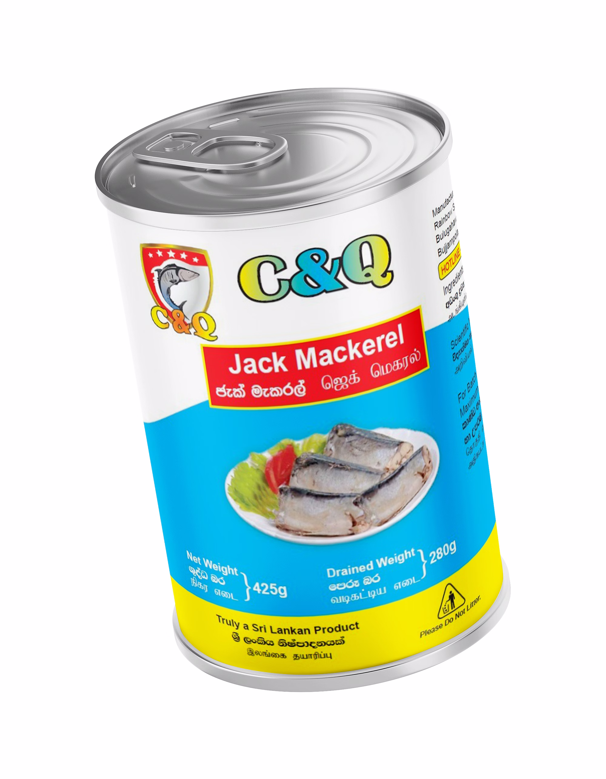 Enjoy the rich, savory taste of the ocean with C&Q Canned Jack Mackerel (425g), made from Indian Scad (Decapterus russelli)—a premium-quality, wild-caught fish. Packed in clean brine (water and salt), this ready-to-use product is an excellent source of protein and healthy Omega-3 fatty acids, making it perfect for everyday cooking or emergency pantry storage.
