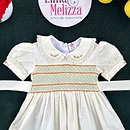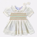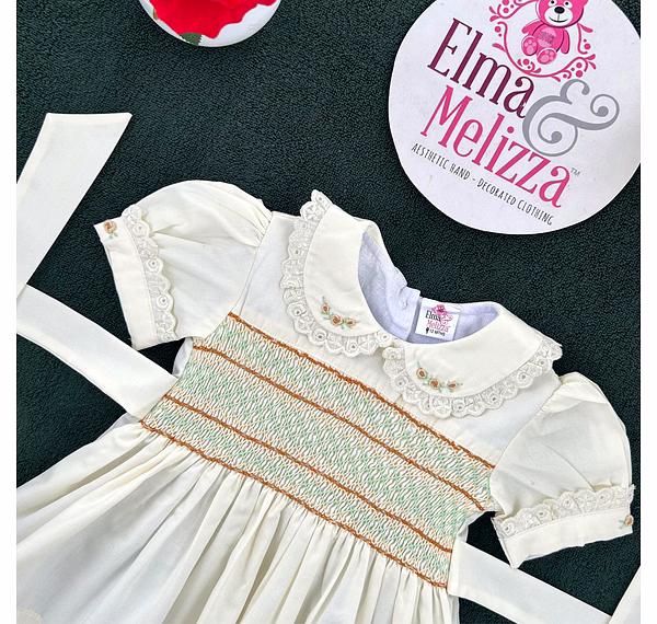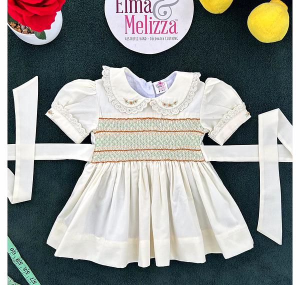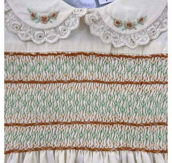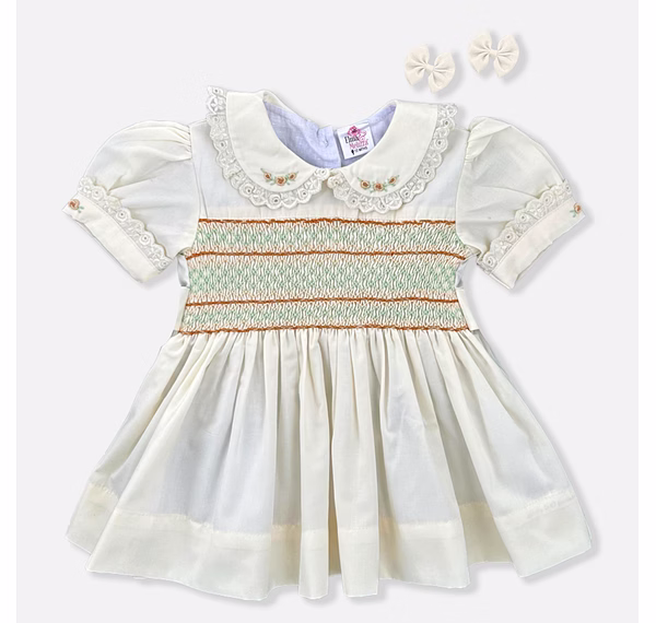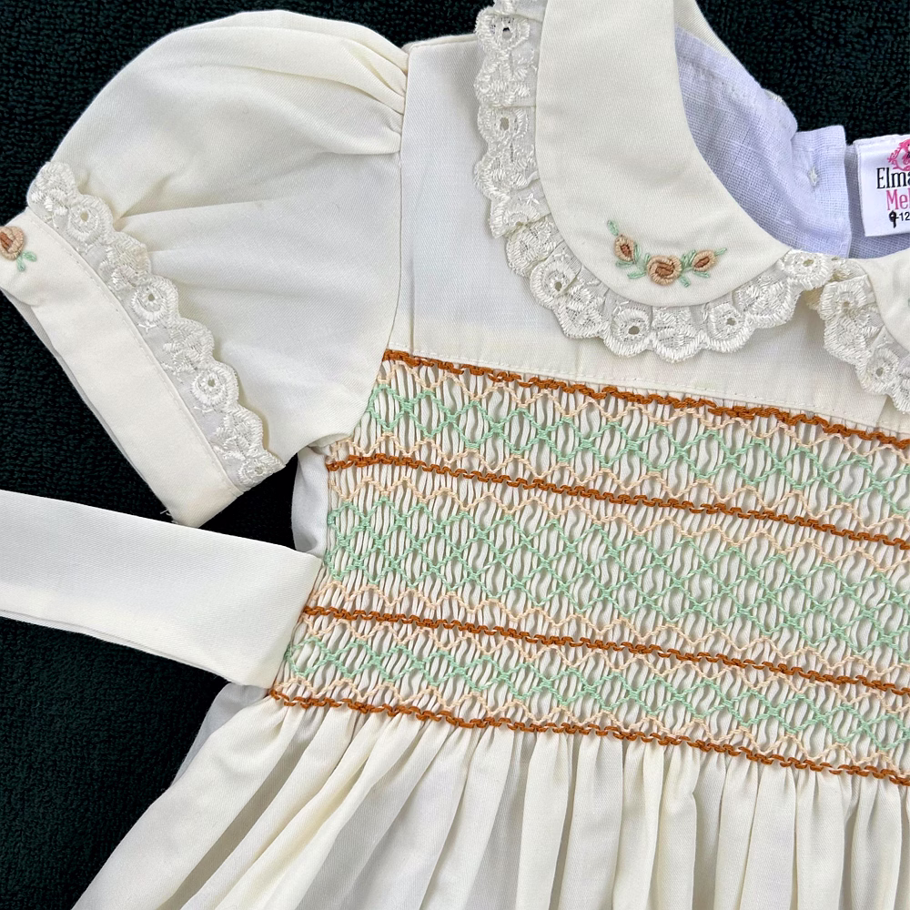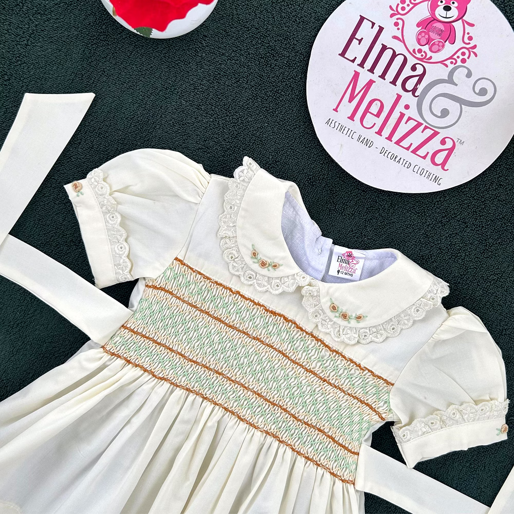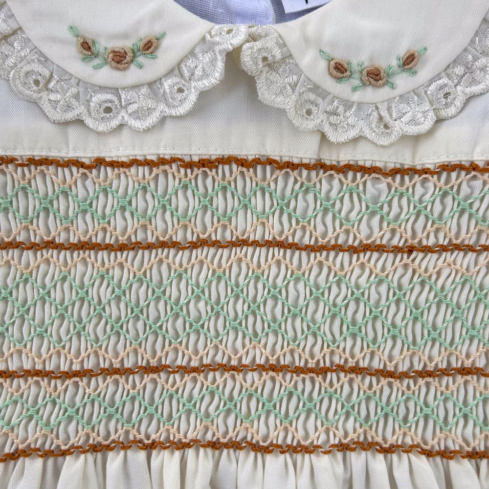 Design Features: Hand-smocked and hand-embroidered.Elegantly designed white Peter Pan collar with lace border, puffed sleeves piped with matching white lace. Charm, simple brown and light green embroidery design.