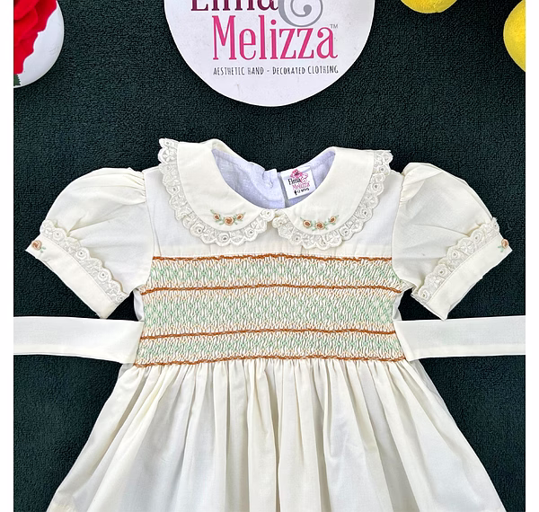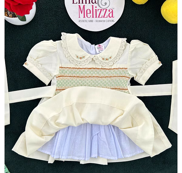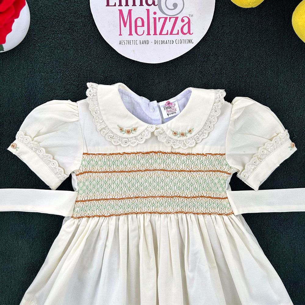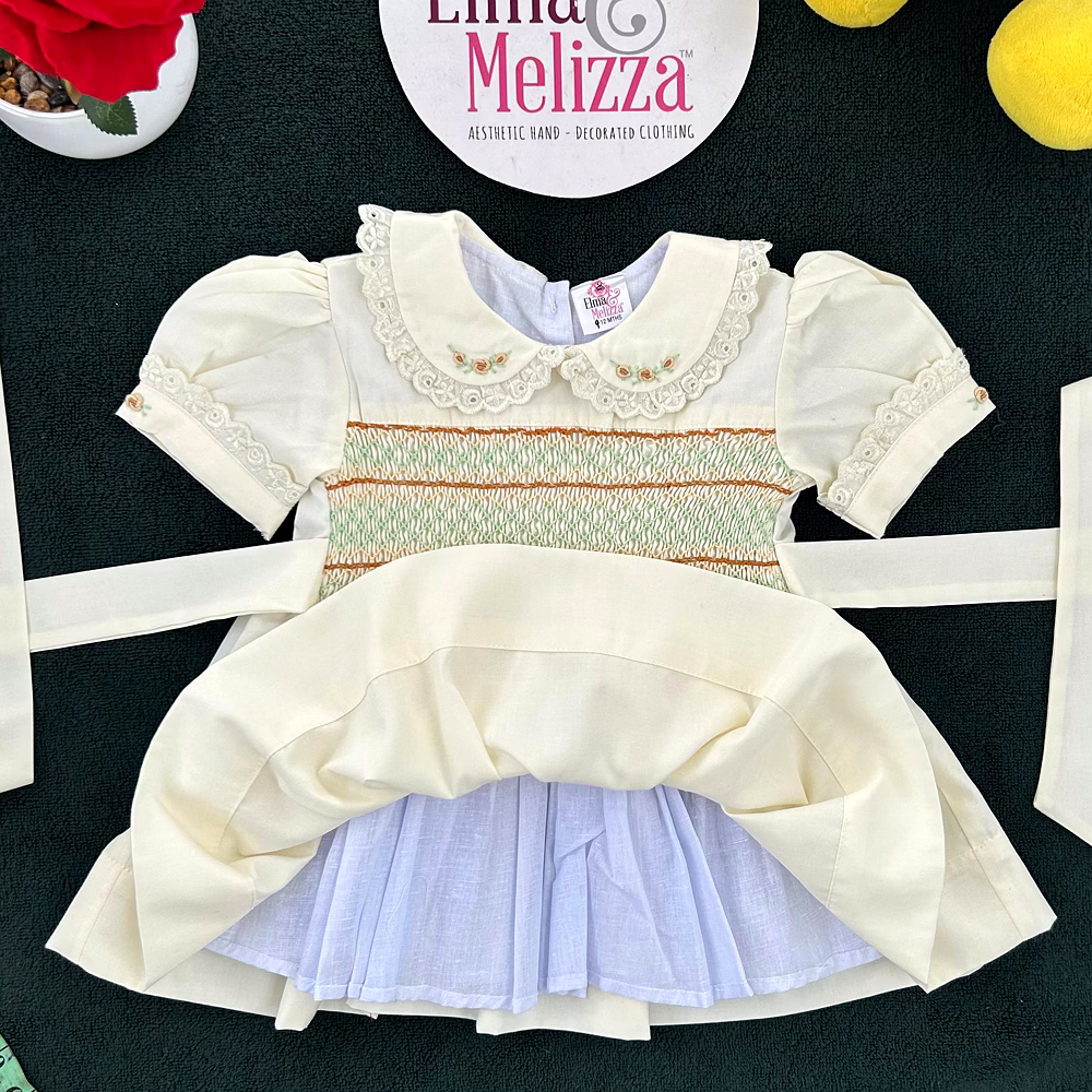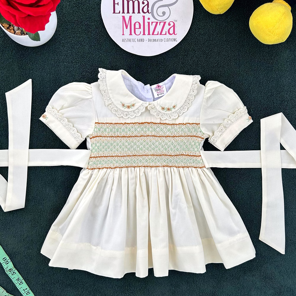 At the heart of this dress lies a masterpiece of hand-smocked artistry, stitched in gentle hues of brown, green, and light yellow, bringing texture and depth to the bodice. The Peter Pan collar adds a vintage touch with lace borders and subtle floral embroidery, while the puffed sleeves with matching lace trim enhance its soft, classic charm. Every detail is carefully considered for a handcrafted finish that feels luxurious and one-of-a-kind.
