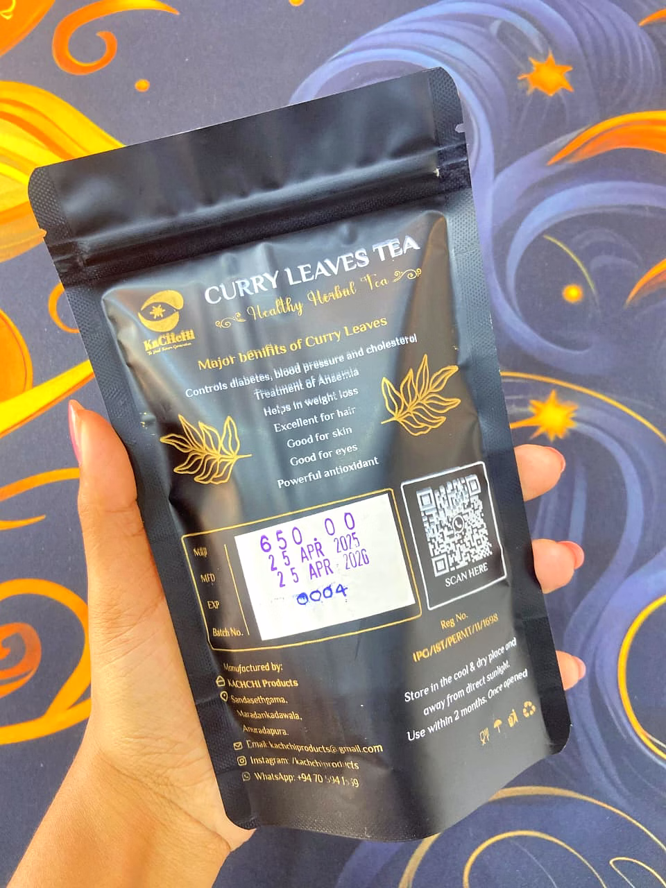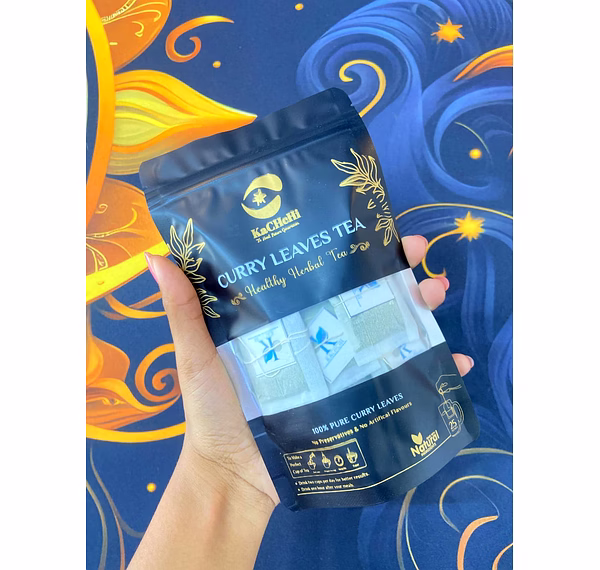 KACHCHI Curry Leaves Tea is a refreshing herbal tea made from carefully selected natural curry leaves. Each pack contains 25 convenient tea bags, allowing you to easily enjoy a nourishing cup anytime. Naturally rich in antioxidants and traditional herbal goodness. No added sugar, artificial colors, or preservatives.