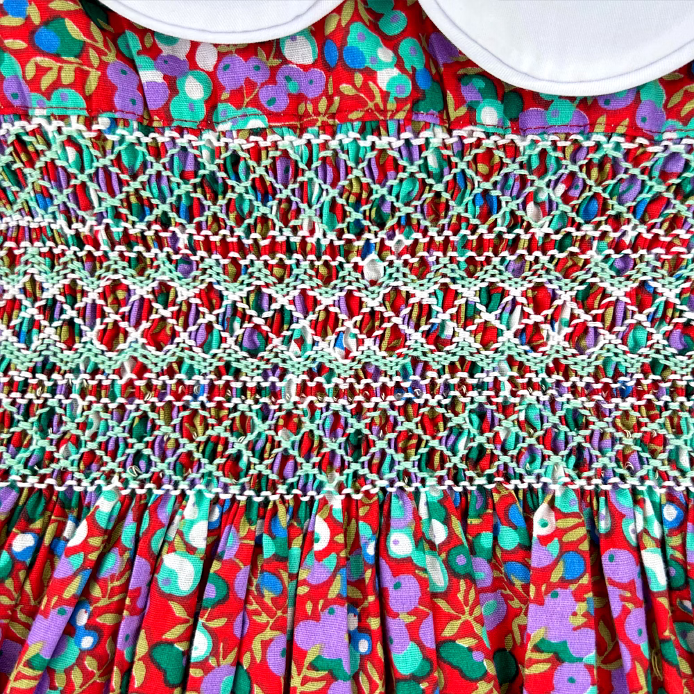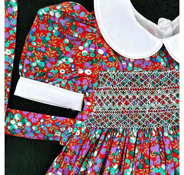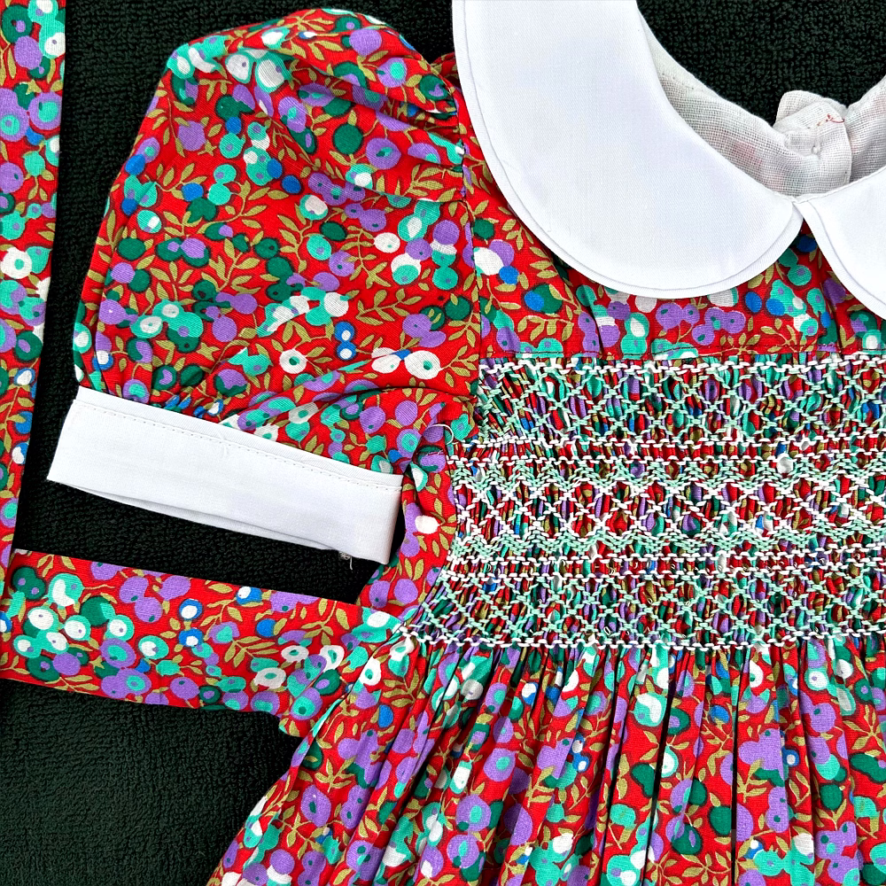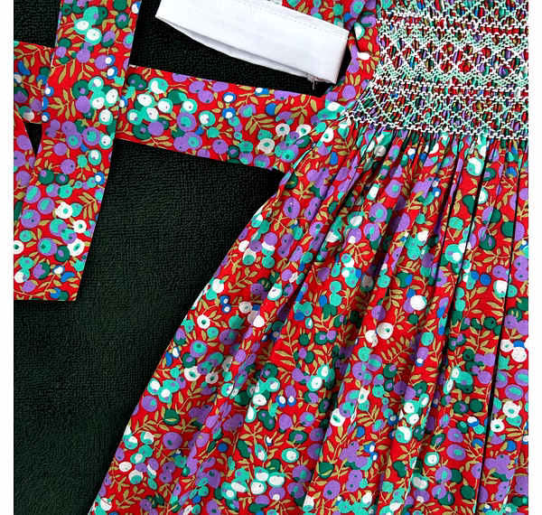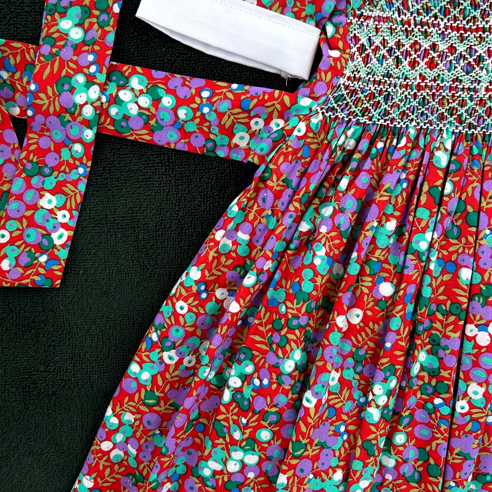 Adorned with delicate hand-smocking in white and green, the chest panel adds a handcrafted touch of vintage beauty. The rich, dark red cotton fabric is decorated with sweet purple and green fruit prints, making it as joyful as it is elegant. This dress merges timeless style with playful energy, perfect for the modern little girl with classic taste.