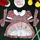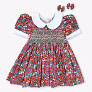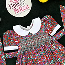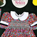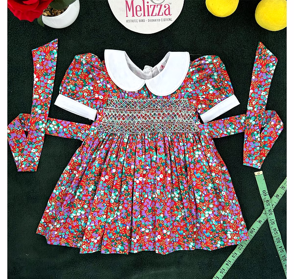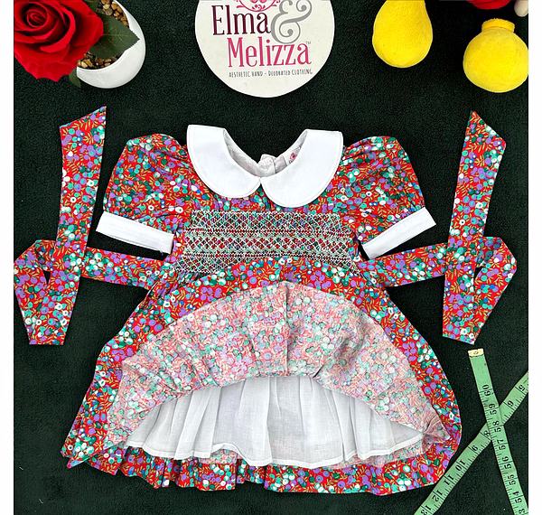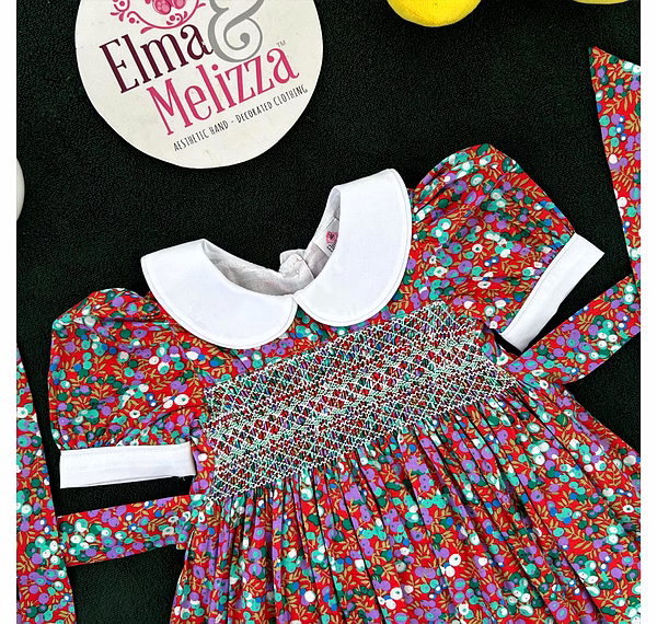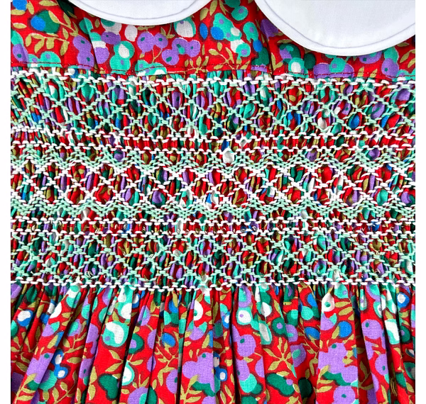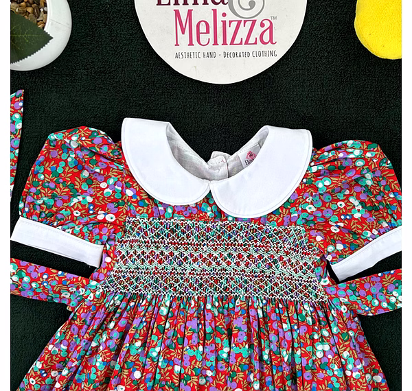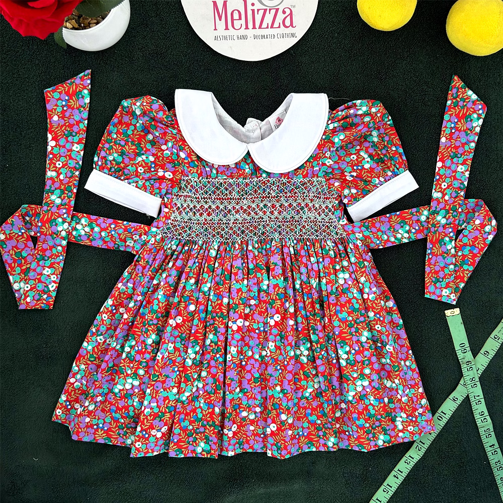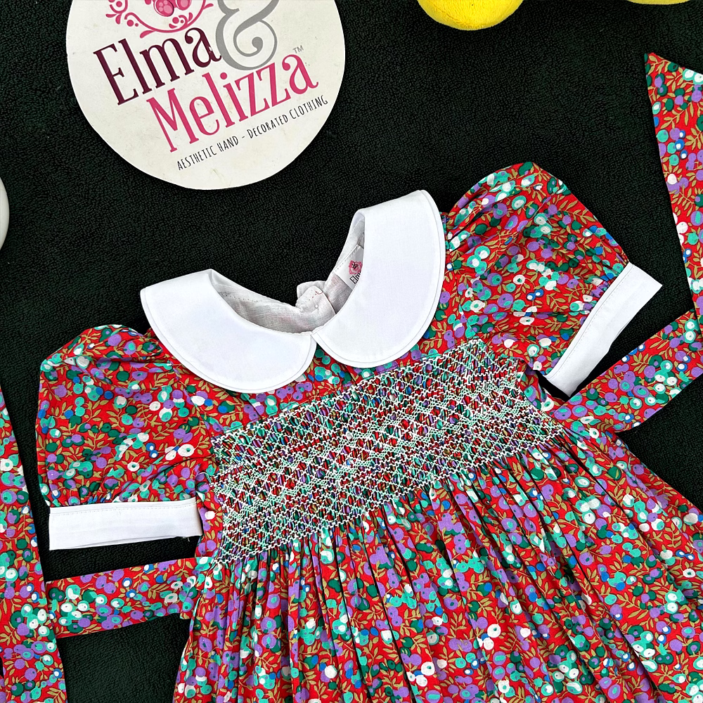 Adorned with delicate hand-smocking in white and green, the chest panel adds a handcrafted touch of vintage beauty. The rich, dark red cotton fabric is decorated with sweet purple and green fruit prints, making it as joyful as it is elegant. This dress merges timeless style with playful energy, perfect for the modern little girl with classic taste.