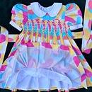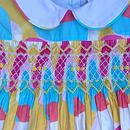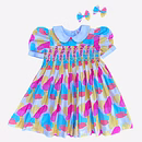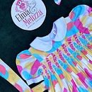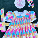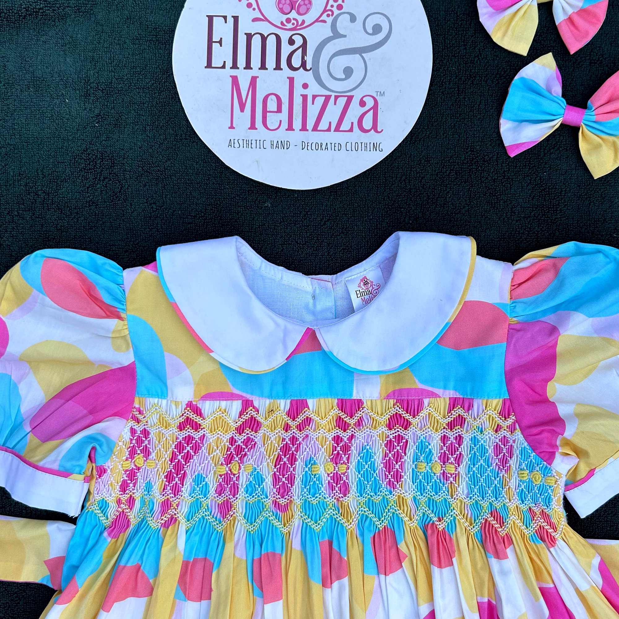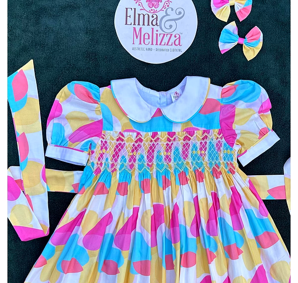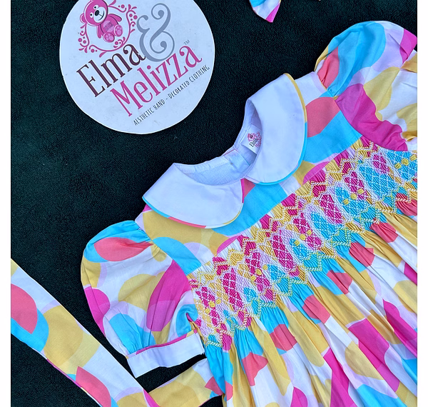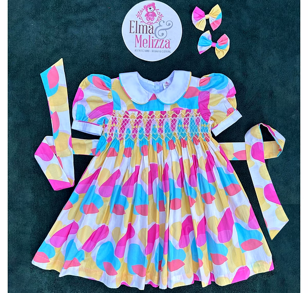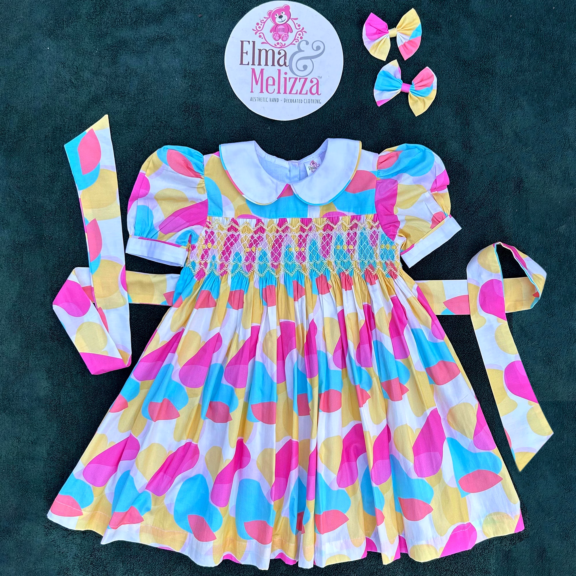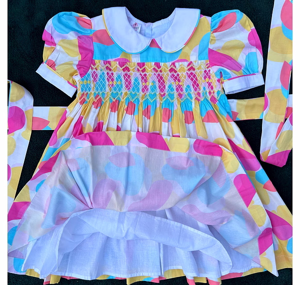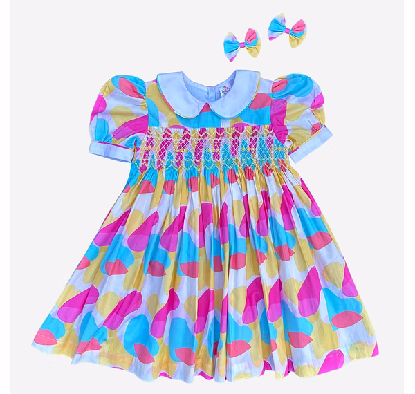Delightfully designed with a playful blend of multicoloured shapes on a white cotton base, this hand-smocked baby girl dress is a masterpiece of both style and comfort. The soft, breathable cotton ensures day-long coziness, while the vibrant print and delicate yellow rose embroidery make this dress a charming choice for your little girl’s wardrobe. Whether she’s the guest of honour or a star in family portraits, this dress ensures she always looks picture-perfect.