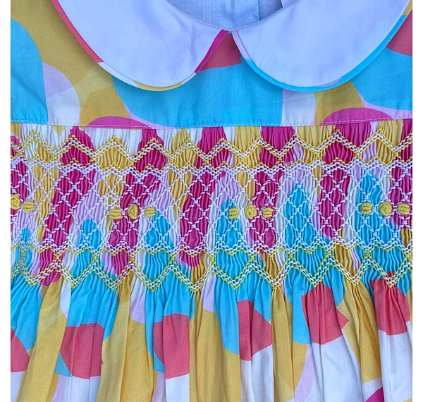 Design Features: Hand-smocked and hand-embroidered.Elegantly designed with a white Peter Pan collar and puffed sleeves with a white sleeve band. Charm with a simple yellow-and-white embroidery design.