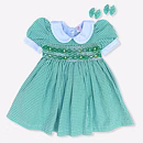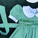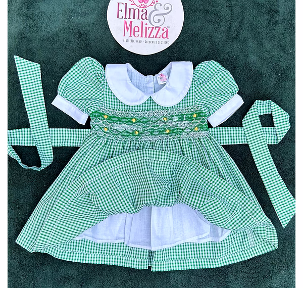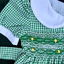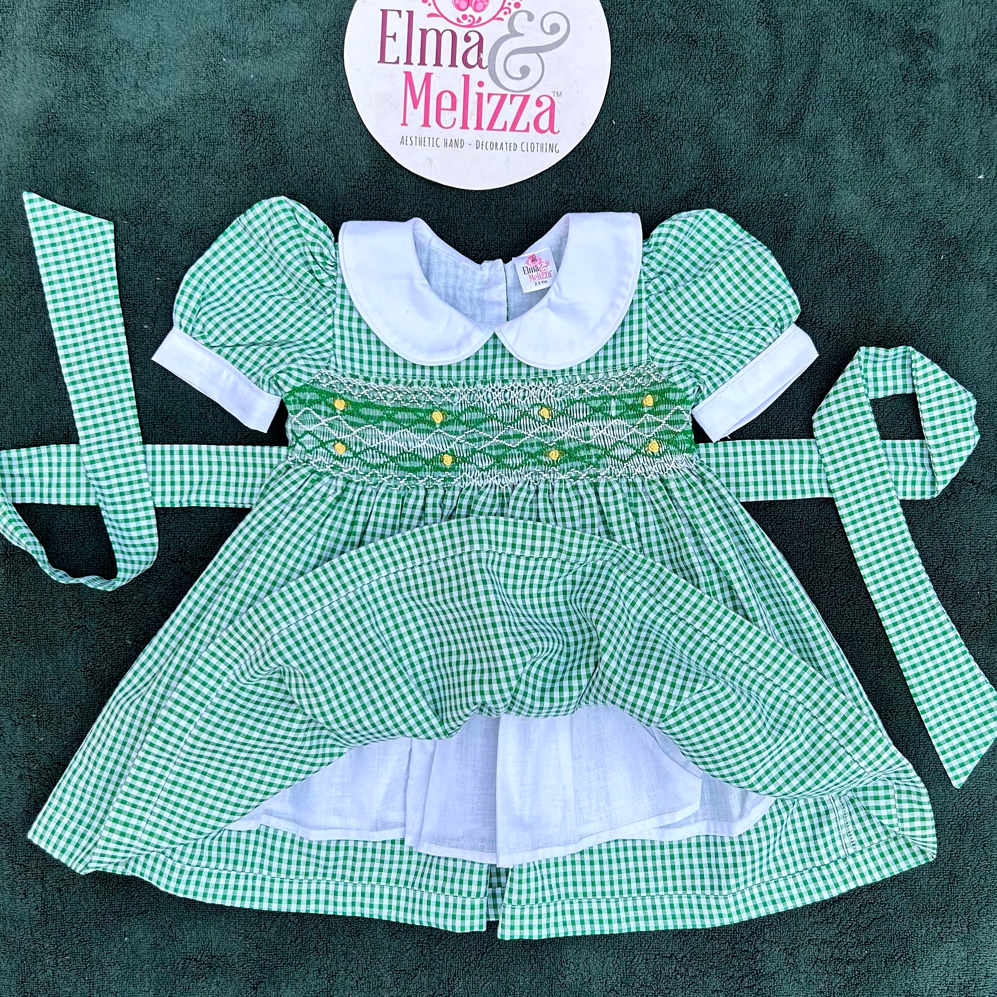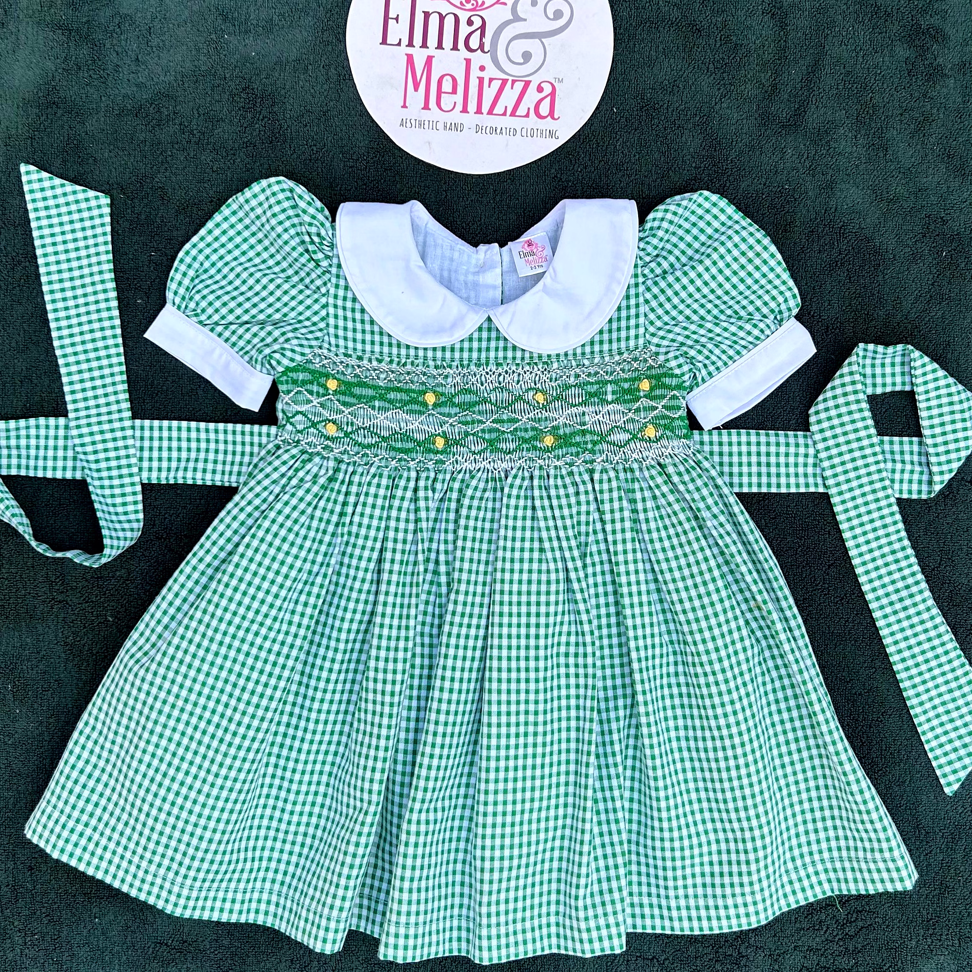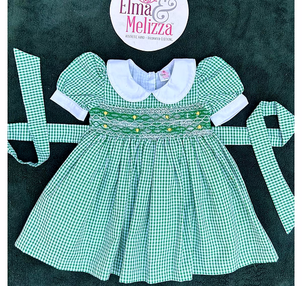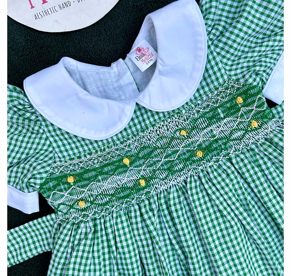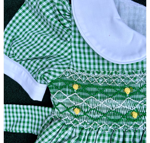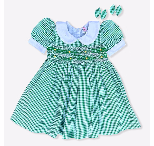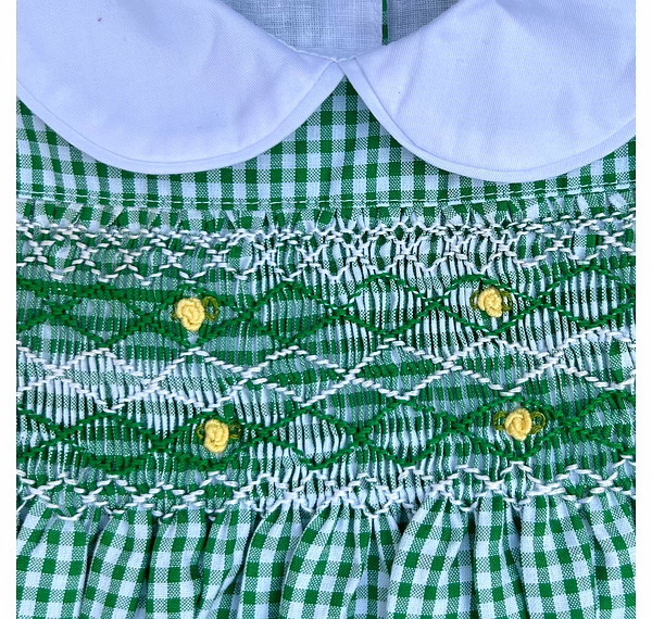 Design Features: Hand-smocked and hand-embroidered.Elegantly designed with a white Peter Pan collar and puffed sleeves with a white sleeve band. Charm, simple green and white embroidery design with yellow colour flowers