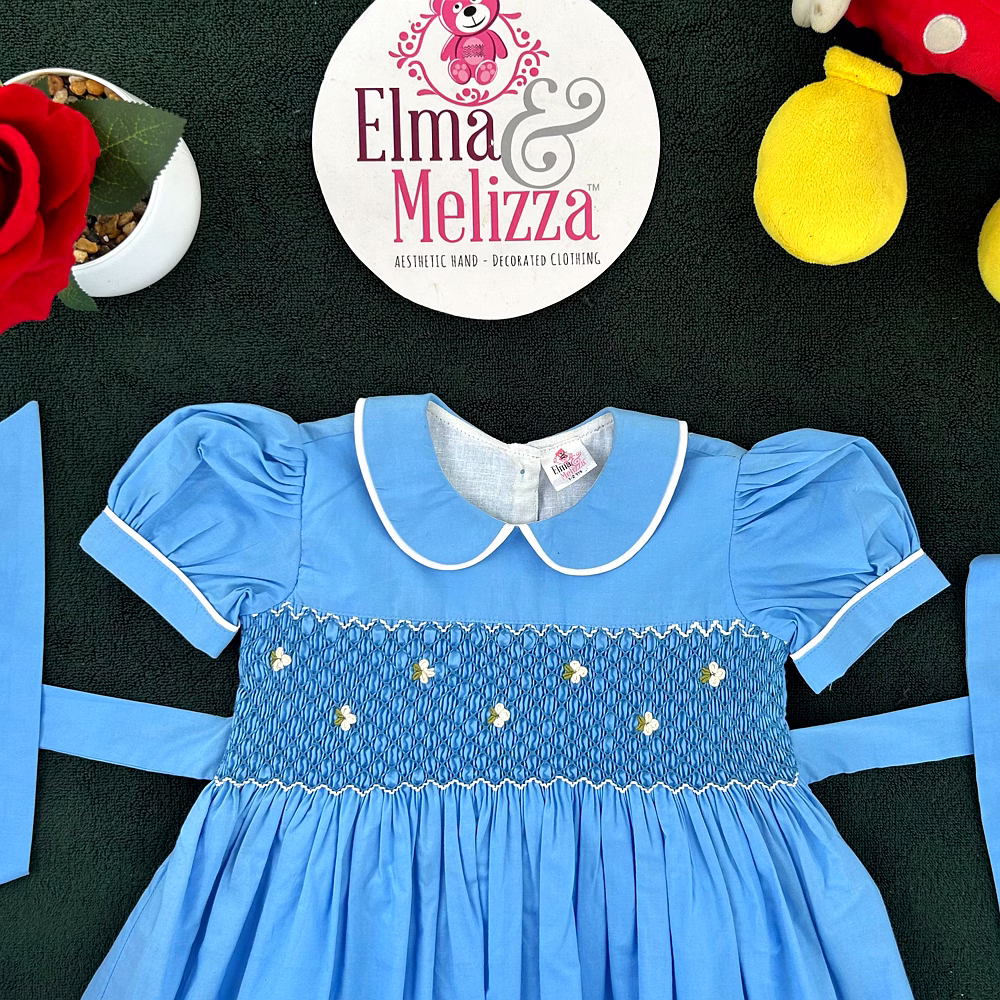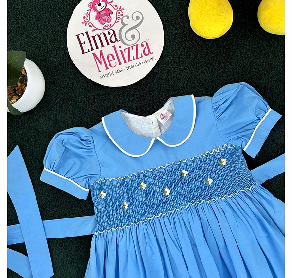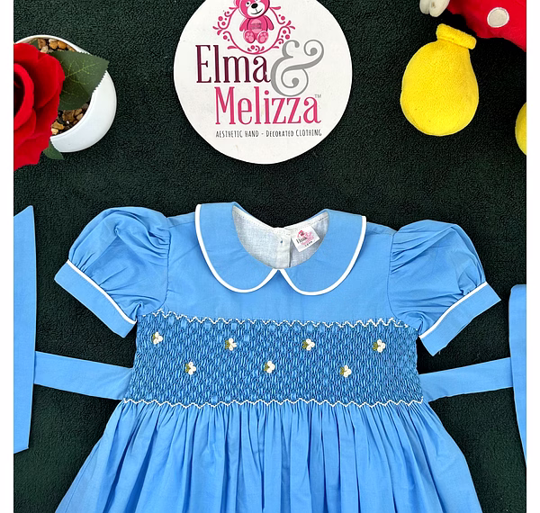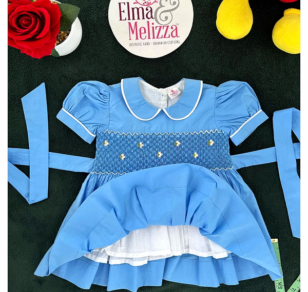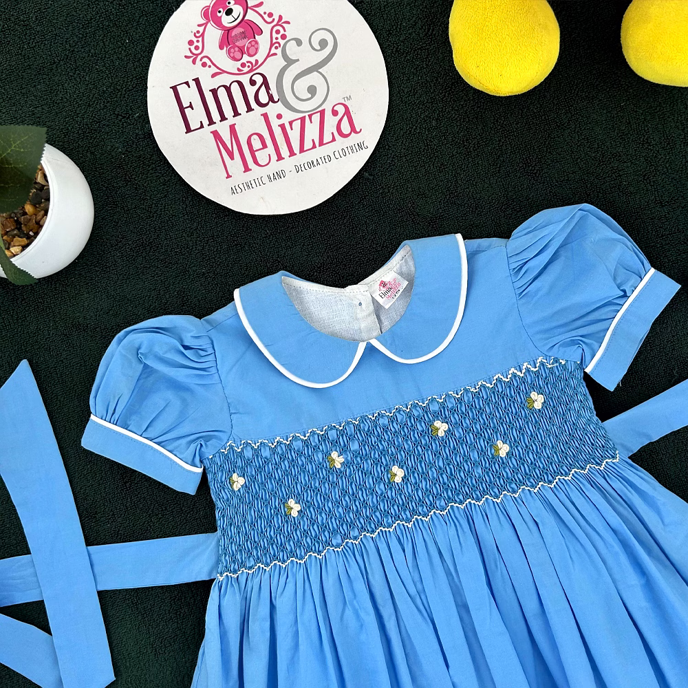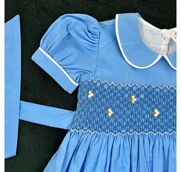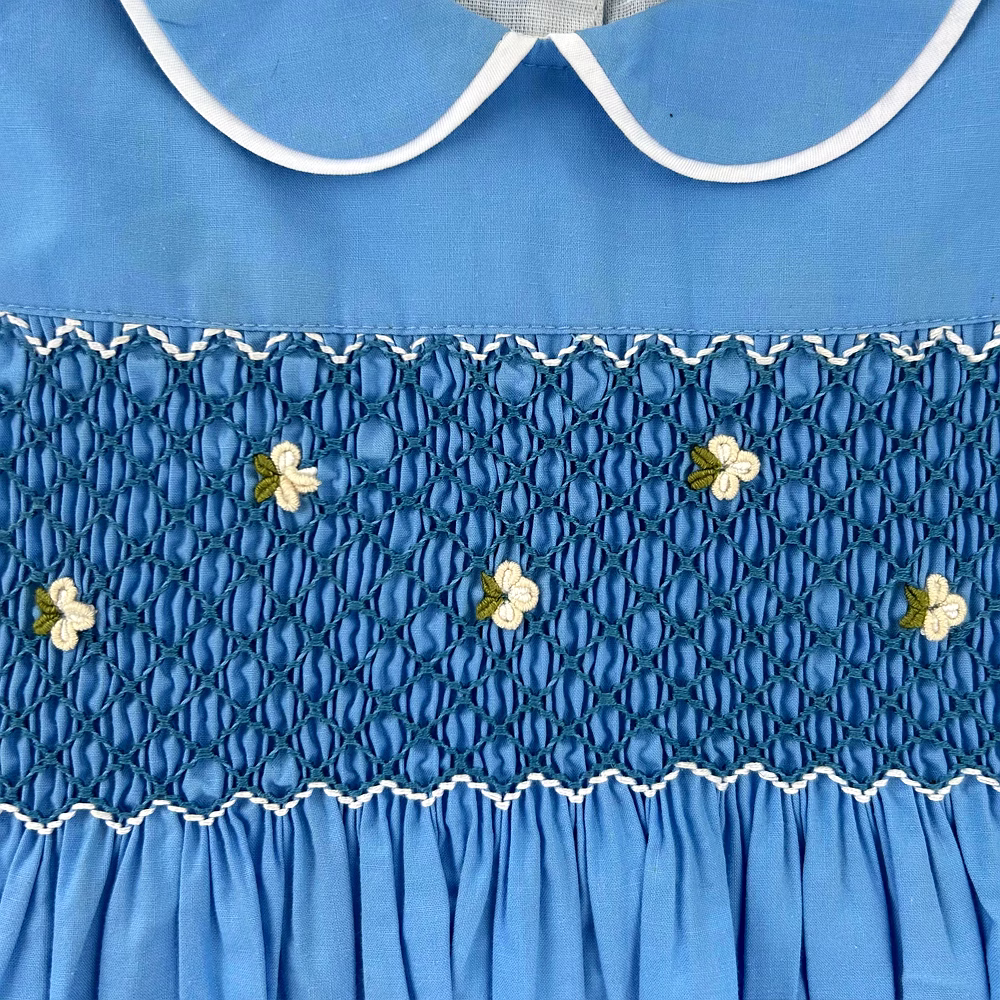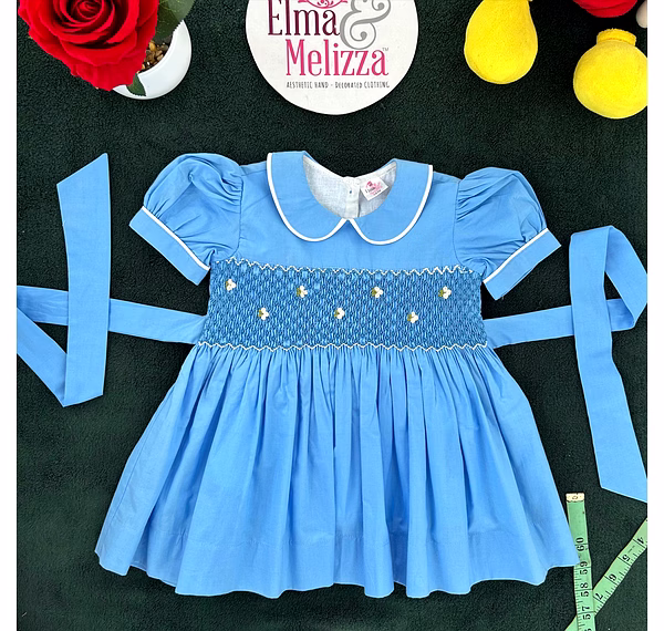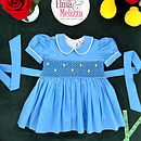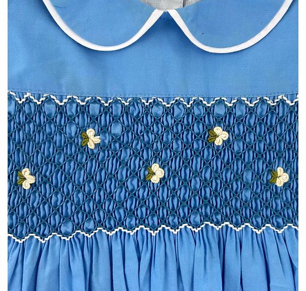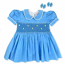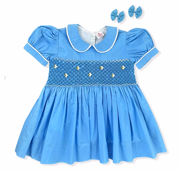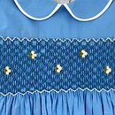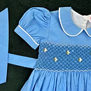 Design Features: Hand-smocked and hand-embroidered.Elegantly designed with a Peter Pan collar and puffed sleeves. Charm, simple blue-and-white embroidery design.