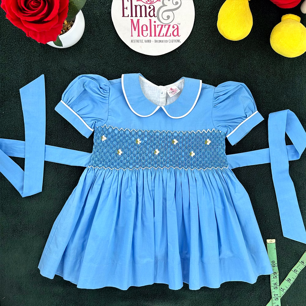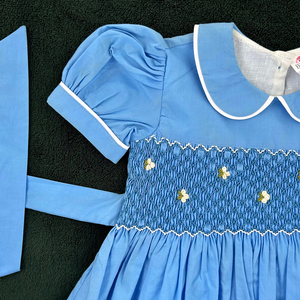 Every stitch tells a story with this lovingly handmade dress. The hand-smocked panel is artfully adorned with delicate white embroidered flowers, adding artisanal texture and gentle elegance. A classic Peter Pan collar trimmed in white frames your little one’s face with vintage flair, while the puffed sleeves offer a soft, angelic silhouette. Fully lined for comfort and complete with adjustable waist ties, this dress ensures a flattering fit as your child grows, creating not just an outfit, but a keepsake.