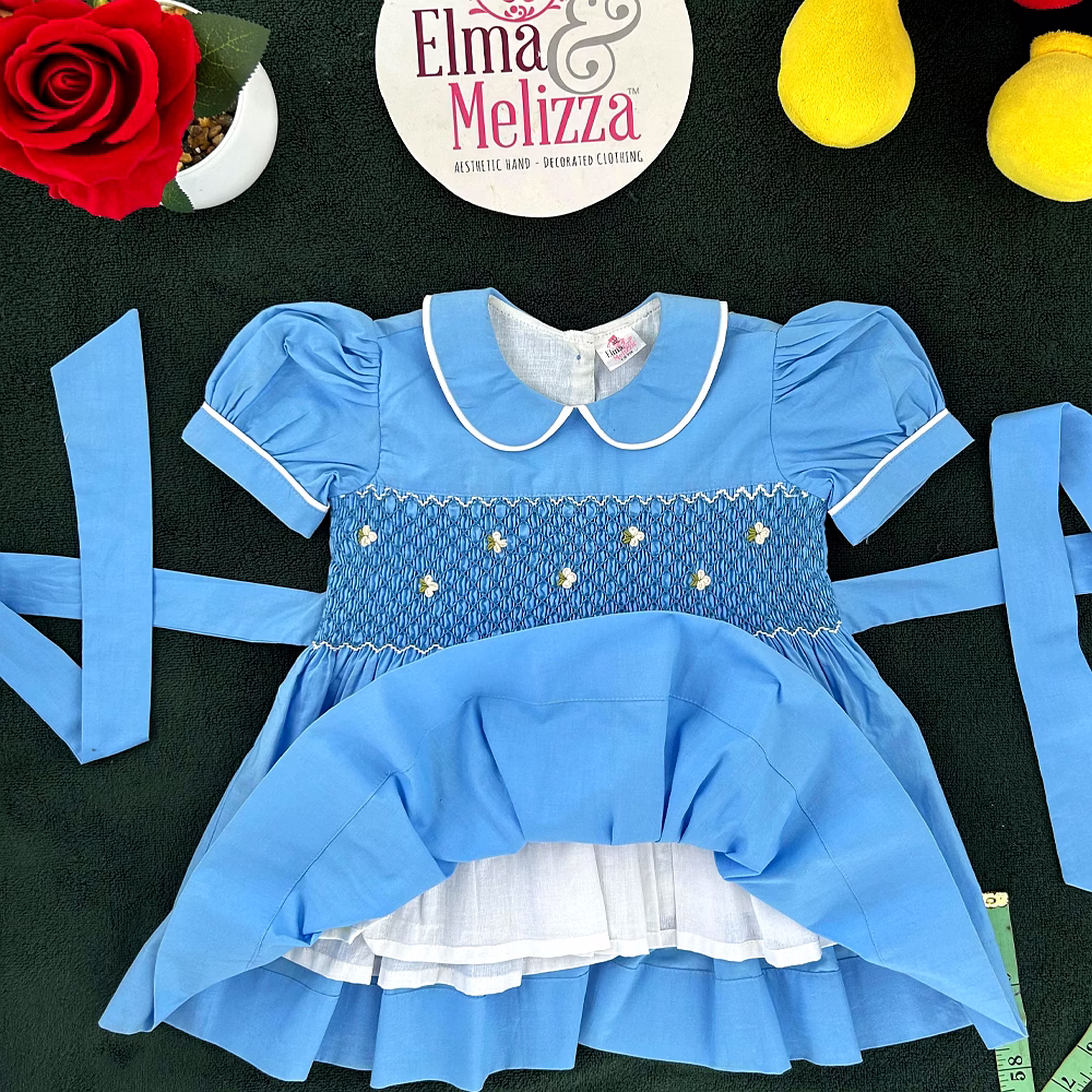 Introduce elegance to your baby girl's wardrobe with this Maya Blue Hand Smocked Hand Embroidered Baby Girl Dress. Crafted from premium breathable cotton, this timeless piece balances soft texture and sophisticated design for maximum comfort and style. The striking maya blue hue serves as a serene canvas, allowing the crisp white hand embroidery to shine through. Ideal for birthdays, weddings, holiday portraits, and other memorable gatherings, this dress is the perfect combination of refinement and charm.