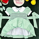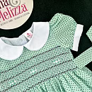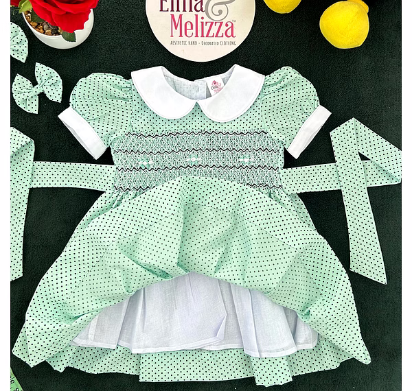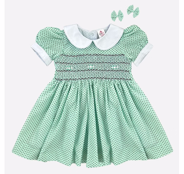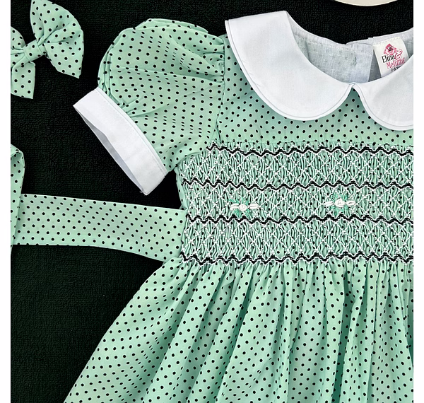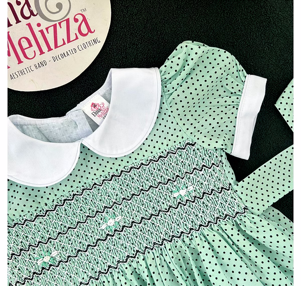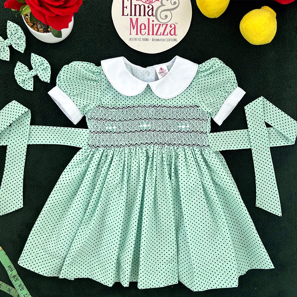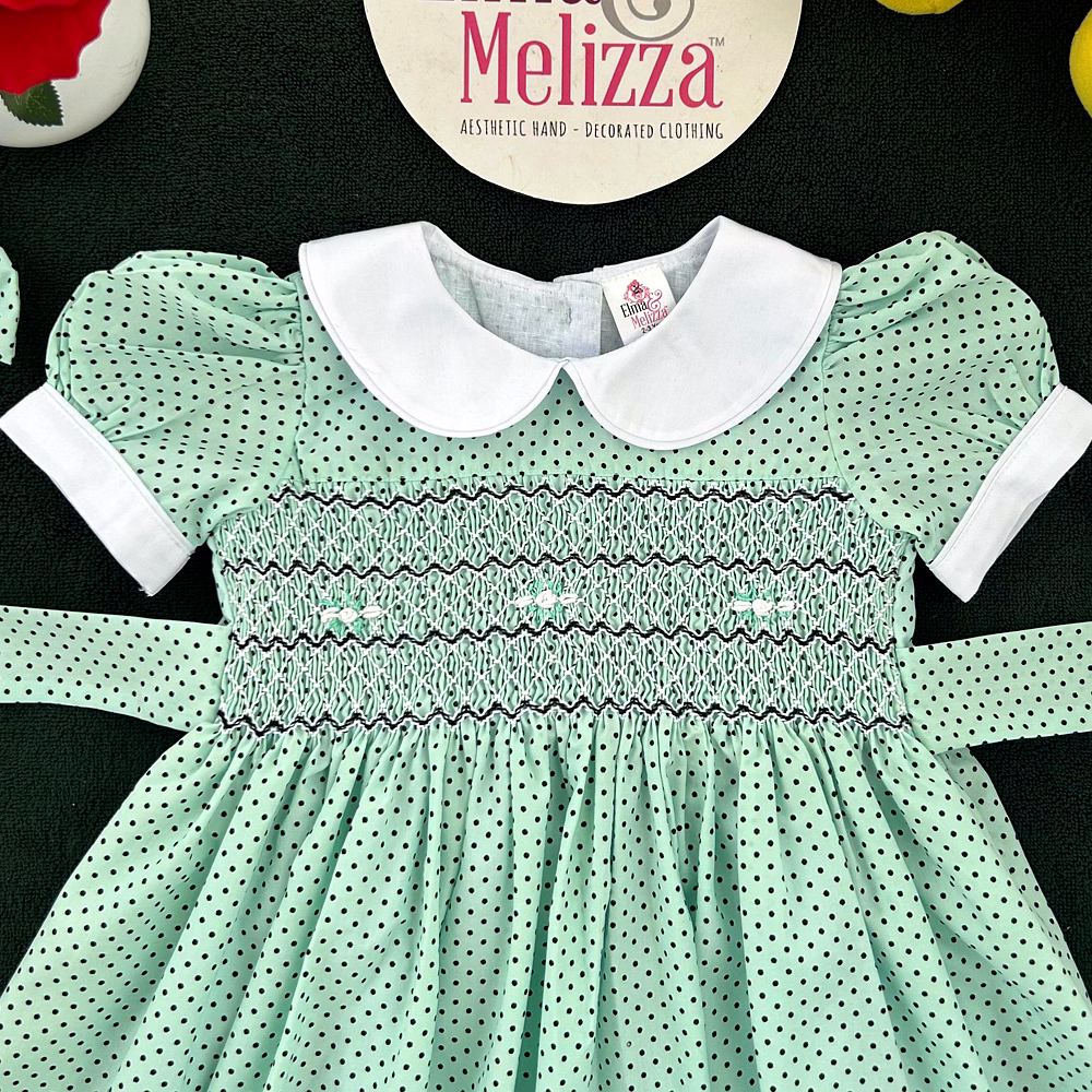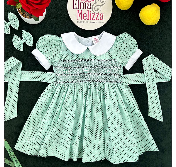 Celebrate your baby girl’s most precious moments in this Seafoam Green Hand-Smocked Baby Girl Dress with Black Polka Dots and White Roses. Designed to combine soft sophistication with joyful innocence, this handcrafted piece radiates timeless beauty. The enchanting hue, paired with delicate embroidery and smocking, makes it the perfect choice for birthdays, family photoshoots, and special celebrations. Every detail speaks of thoughtful craftsmanship and elevated style.