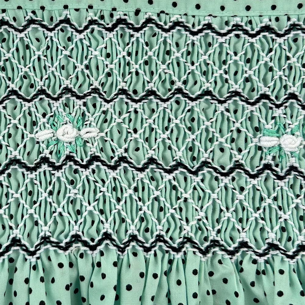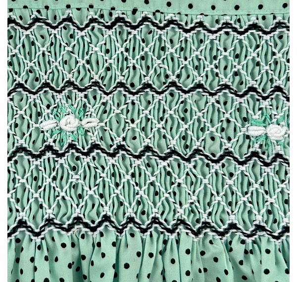 Design Features: Hand-smocked and hand-embroidered.Elegantly designed with a white Peter Pan collar and puffed sleeves. Charm, simple black and white embroidery design.