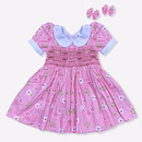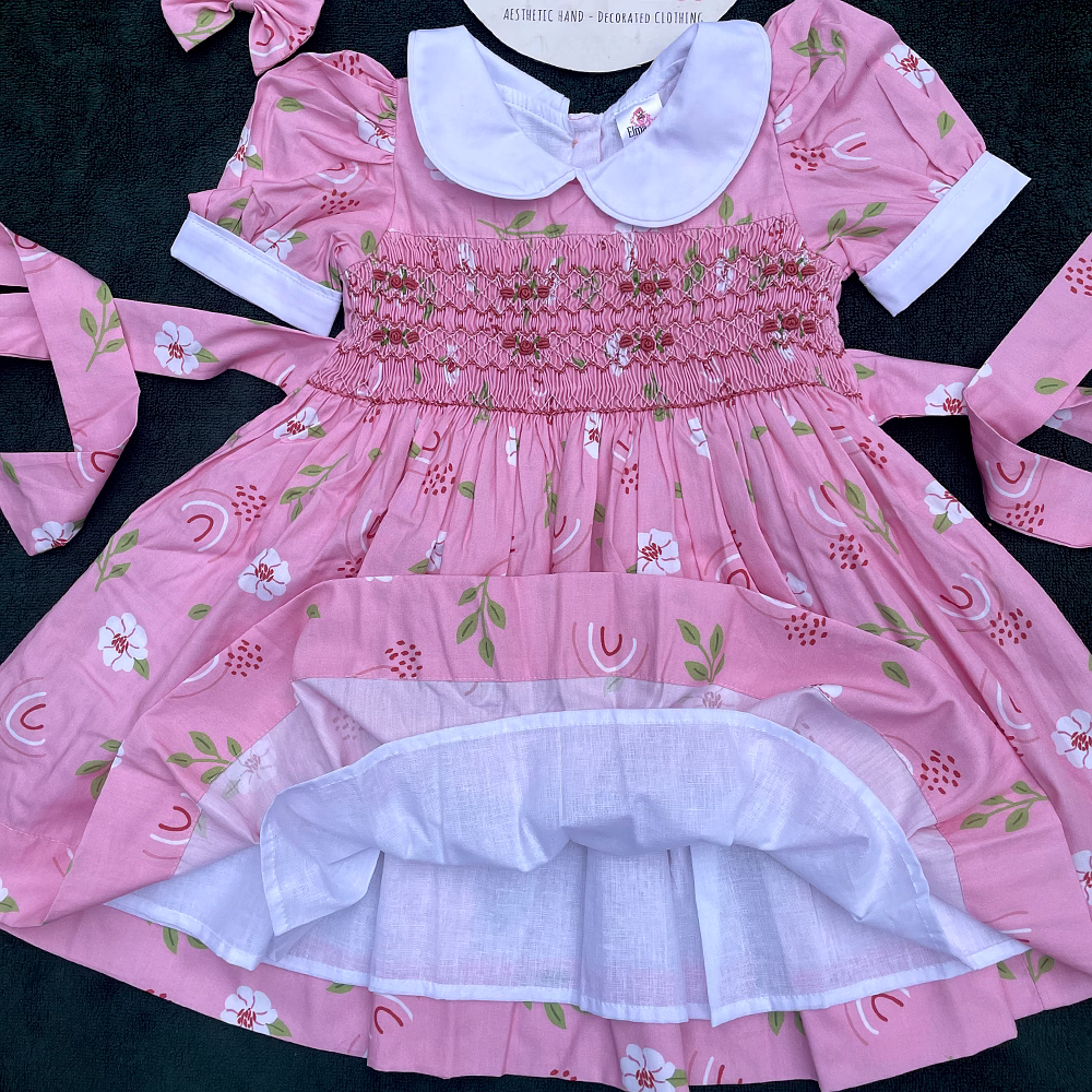 With exquisite hand embroidery and smocking in soft pink hues, this dress is lovingly stitched to perfection. The front is gently gathered with precise smocking, giving the dress volume and shape while adding a subtle texture. The Peter Pan collar in crisp white, combined with vintage-inspired puffed sleeves trimmed in white, completes a look that is classic yet playful, perfect for your little girl’s first parties and forever memories.