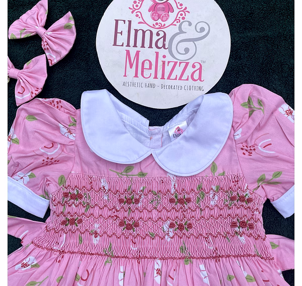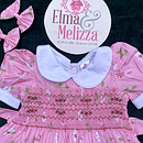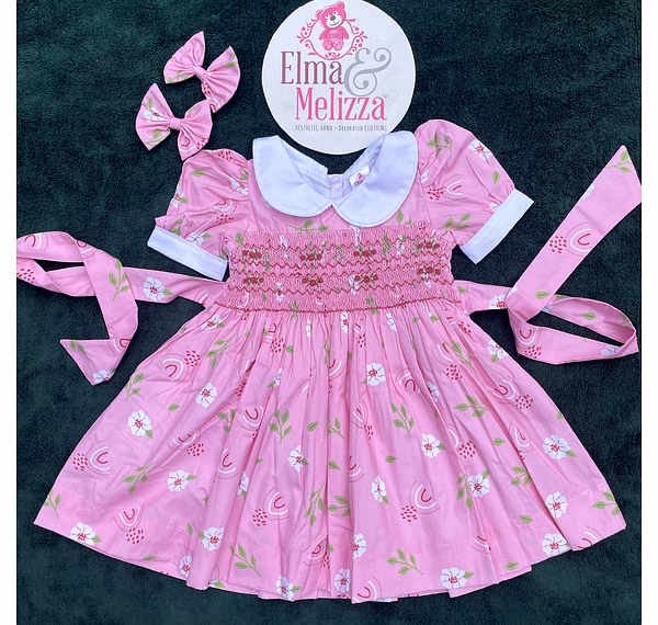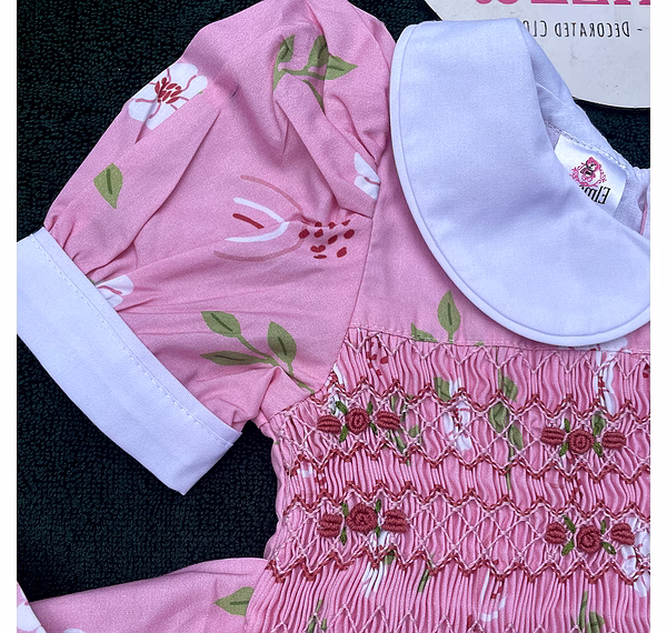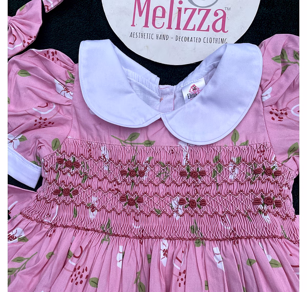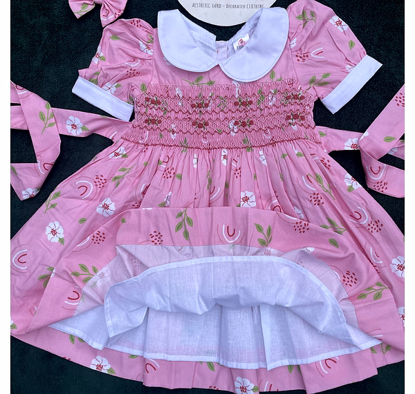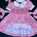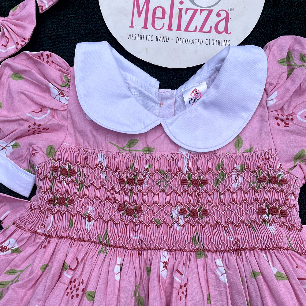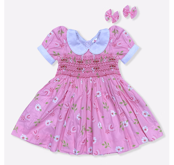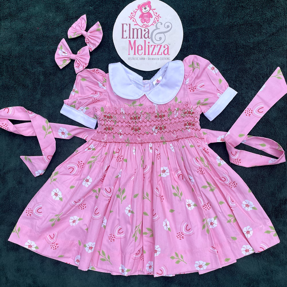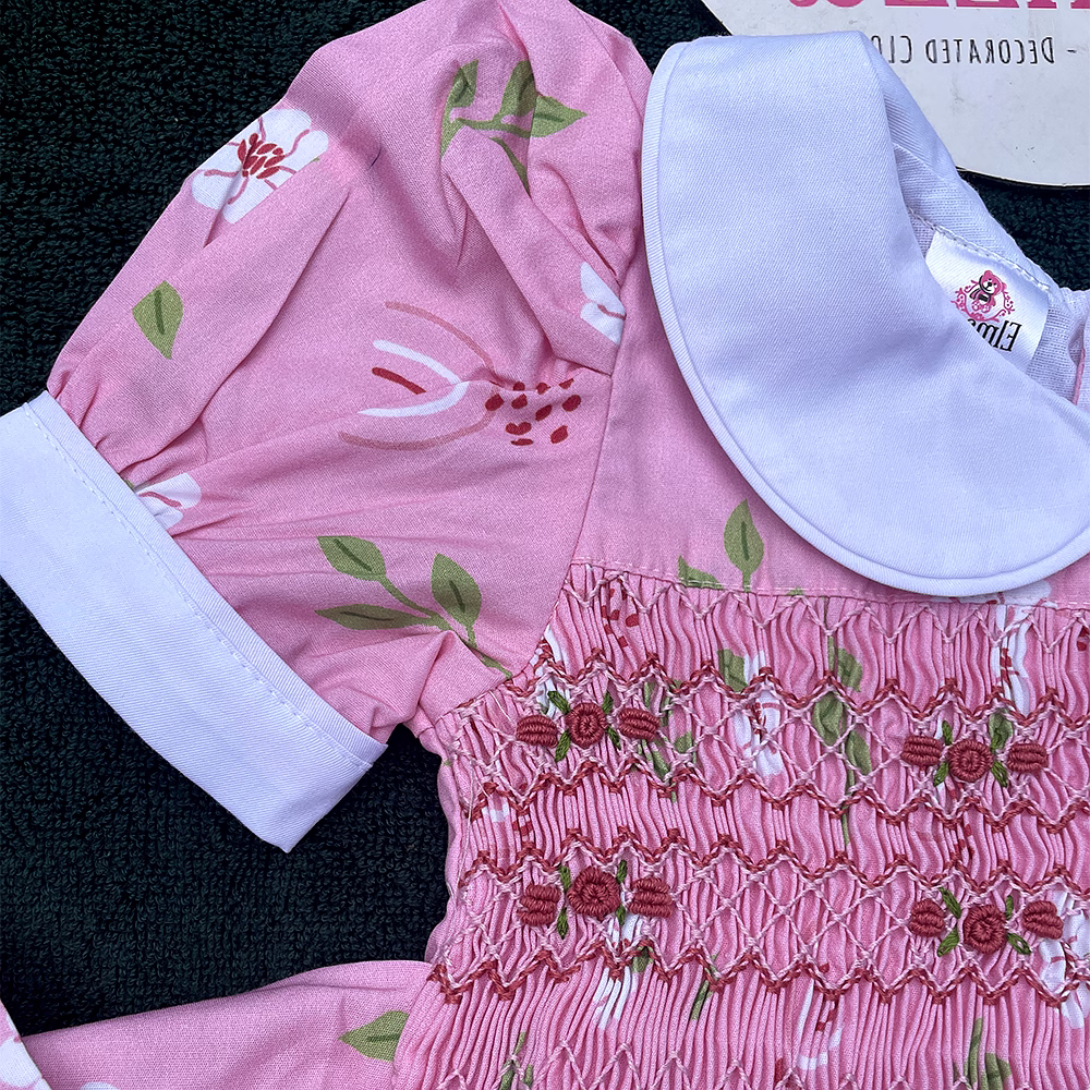 Design Features: Hand-smocked and hand-embroidered.Elegantly designed with a white Peter Pan collar and puffed sleeves with a white sleeve band. Charm, simple pink colour embroidery design.
