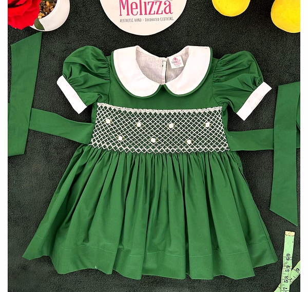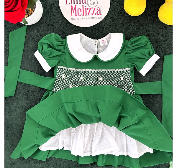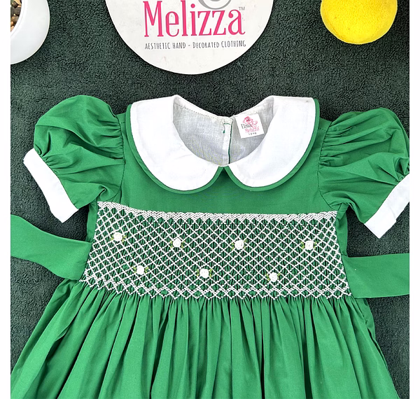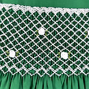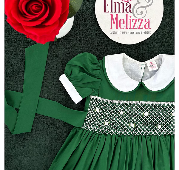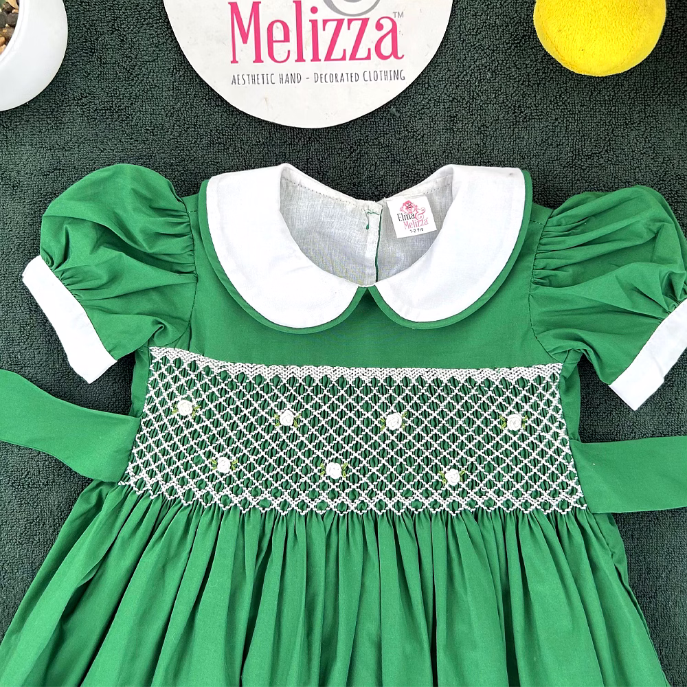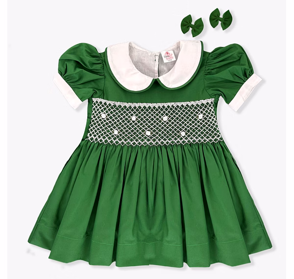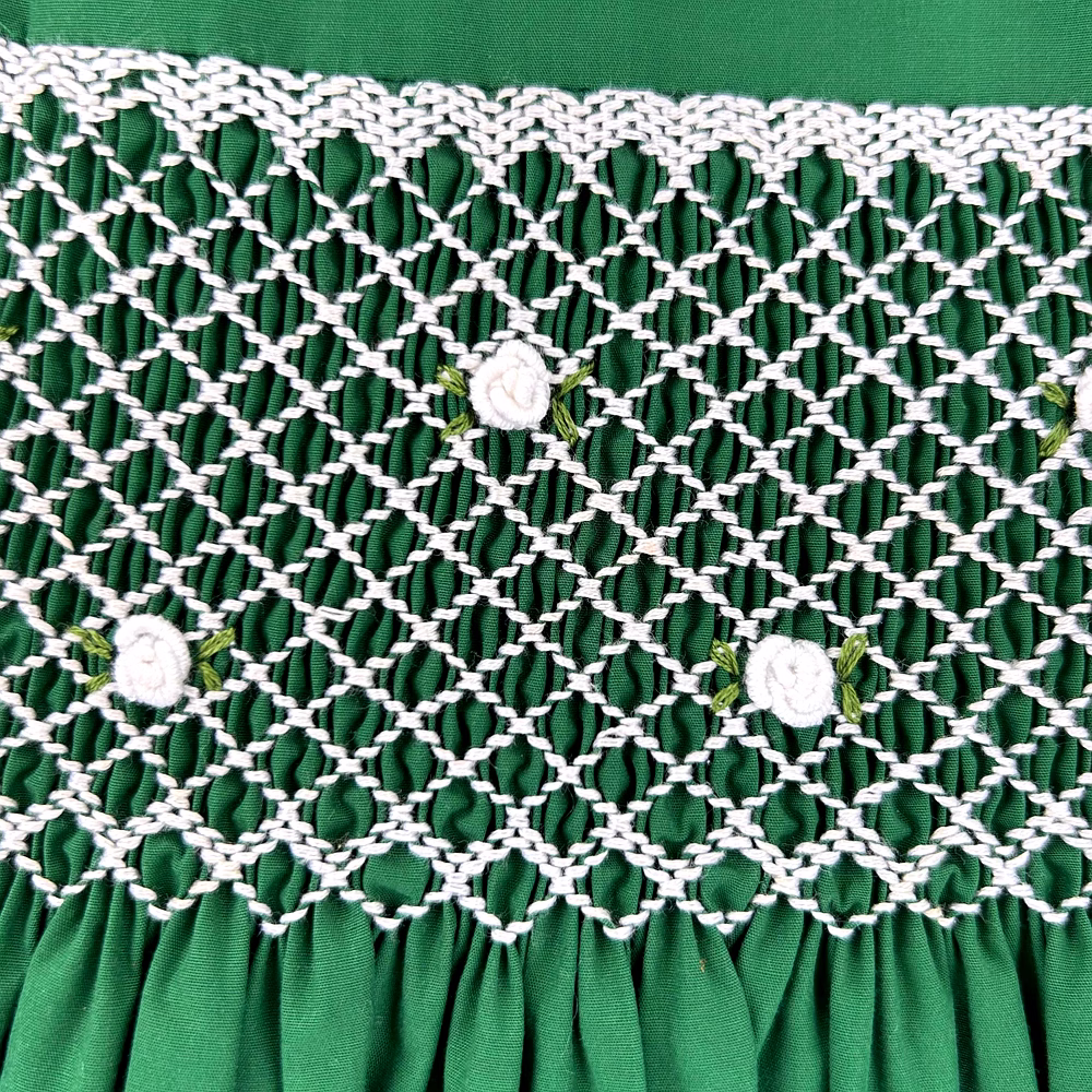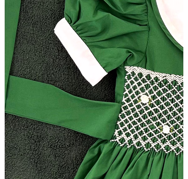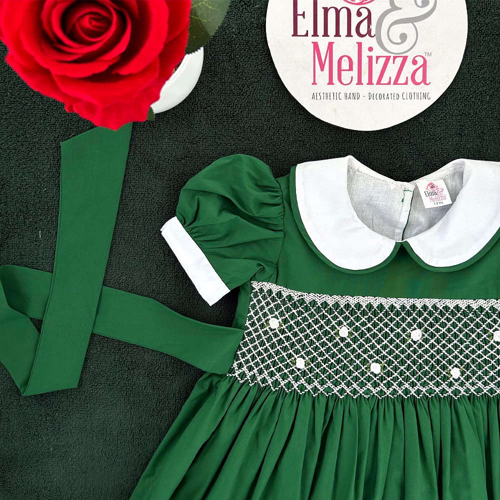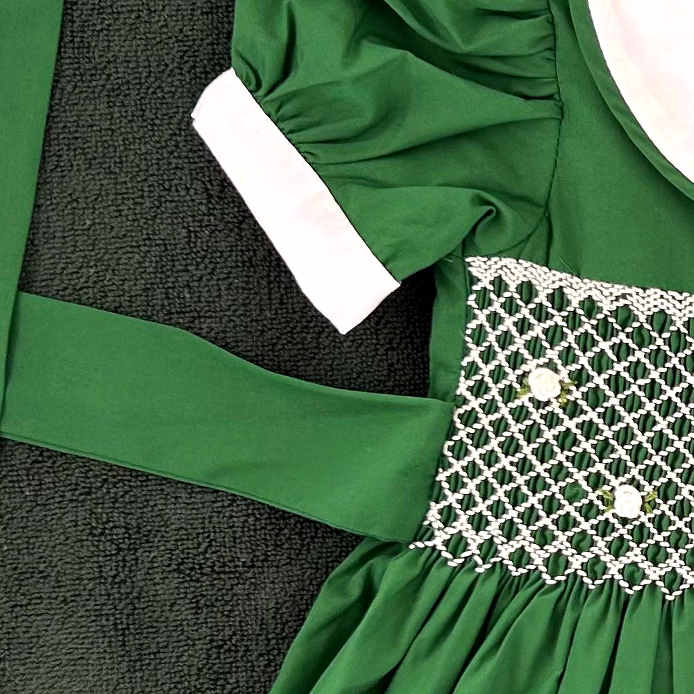 Accentuated with intricate hand-smocked white embroidery, the dress's bodice showcases stunning white rose motifs that add charm and sophistication. A classic white Peter Pan collar complements the rich forest green base, bringing a vintage-inspired flair that enhances your baby girl's natural sweetness and makes her shine during every special occasion.