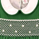 Design Features: Hand-smocked and hand-embroidered.Elegantly designed with a white Peter Pan collar, puffed sleeves with a white sleeve band. Charm, simple white embroidered flower design.