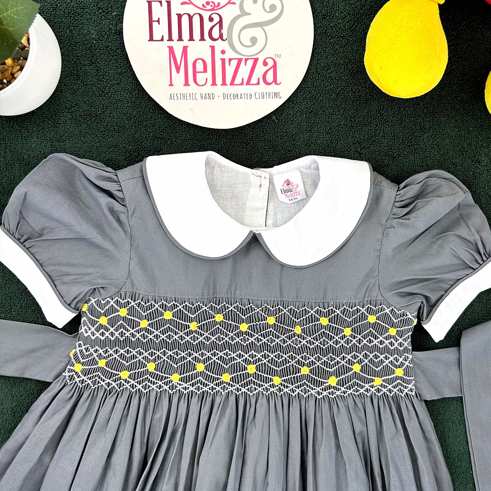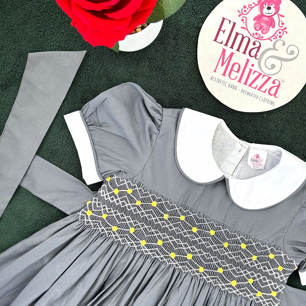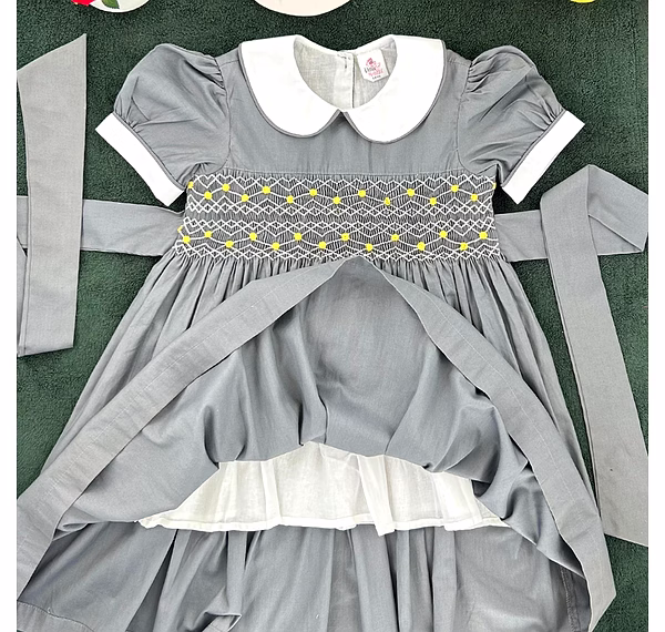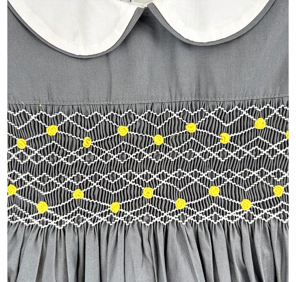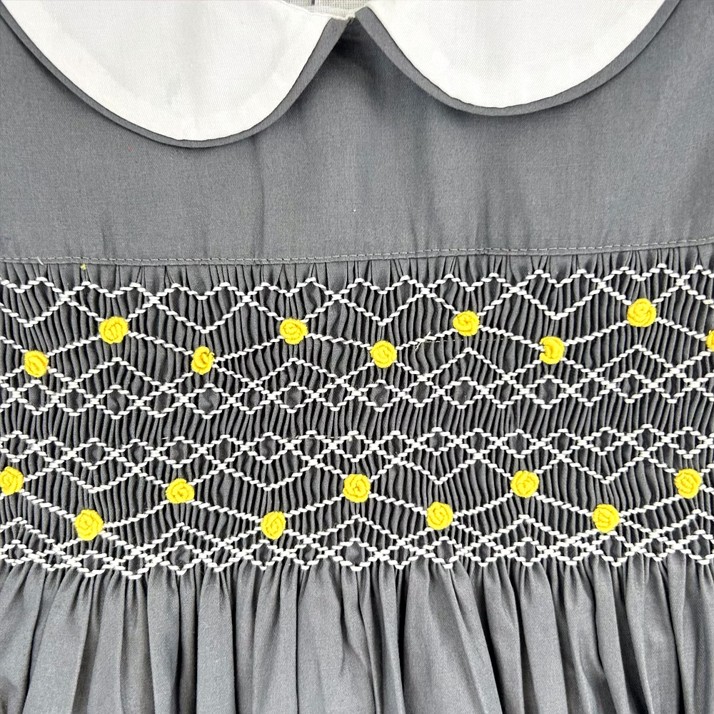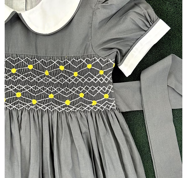 Every detail of this dress speaks of artisanal care and beauty. The hand-smocked chest features fine embroidery in clean white thread, accented with dainty yellow flowers that add a soft, joyful touch. A classic white Peter Pan collar, framed by a dark gray border and detailed with yellow floral embroidery, brings vintage elegance to the design. Complemented by puffed sleeves with white trim and adjustable waist ties for a perfect fit, this dress promises both comfort and classic appeal.