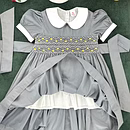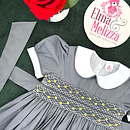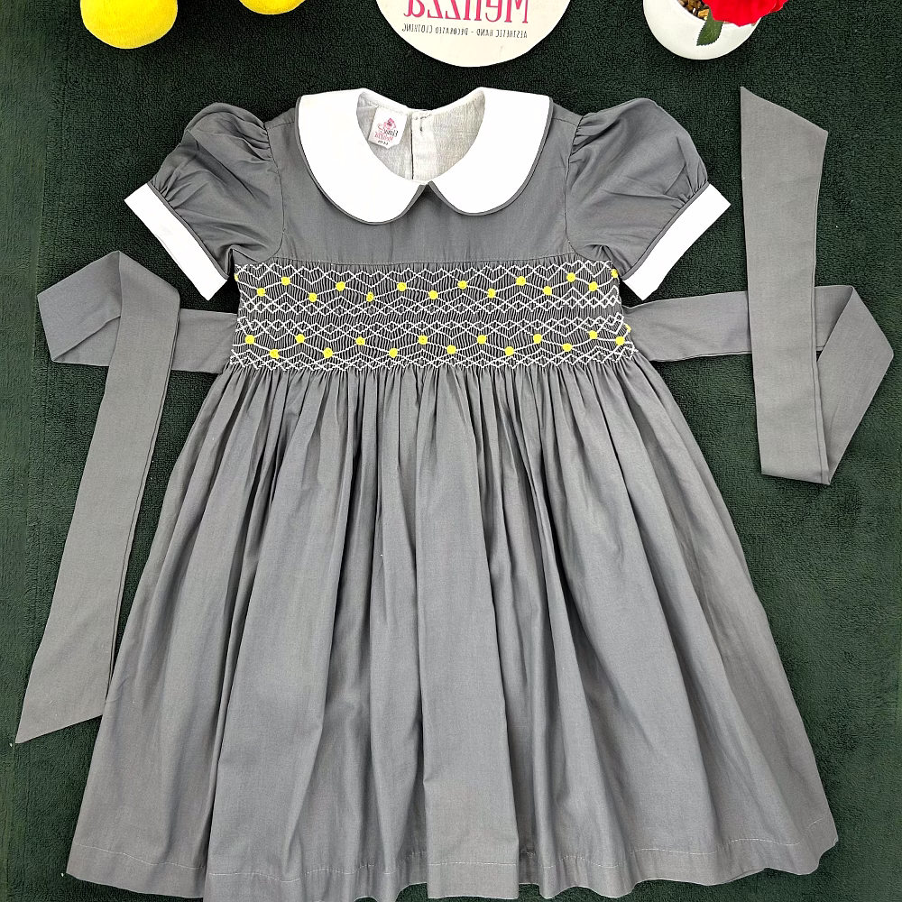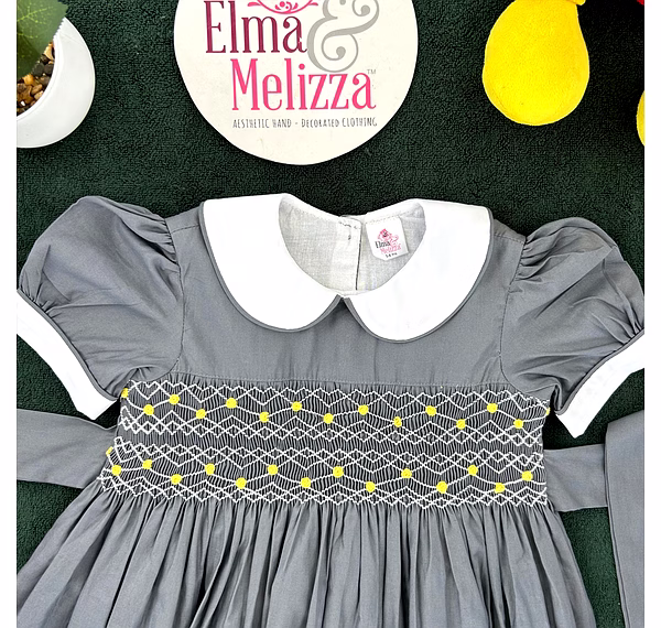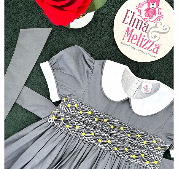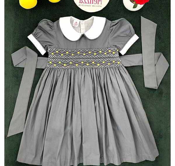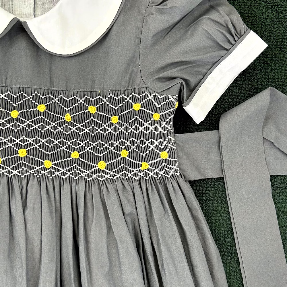 Every detail of this dress speaks of artisanal care and beauty. The hand-smocked chest features fine embroidery in clean white thread, accented with dainty yellow flowers that add a soft, joyful touch. A classic white Peter Pan collar, framed by a dark gray border and detailed with yellow floral embroidery, brings vintage elegance to the design. Complemented by puffed sleeves with white trim and adjustable waist ties for a perfect fit, this dress promises both comfort and classic appeal.