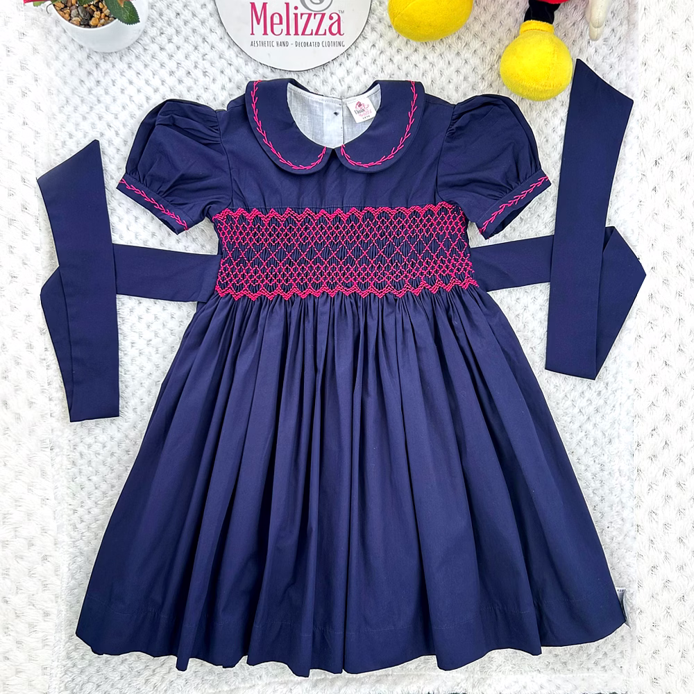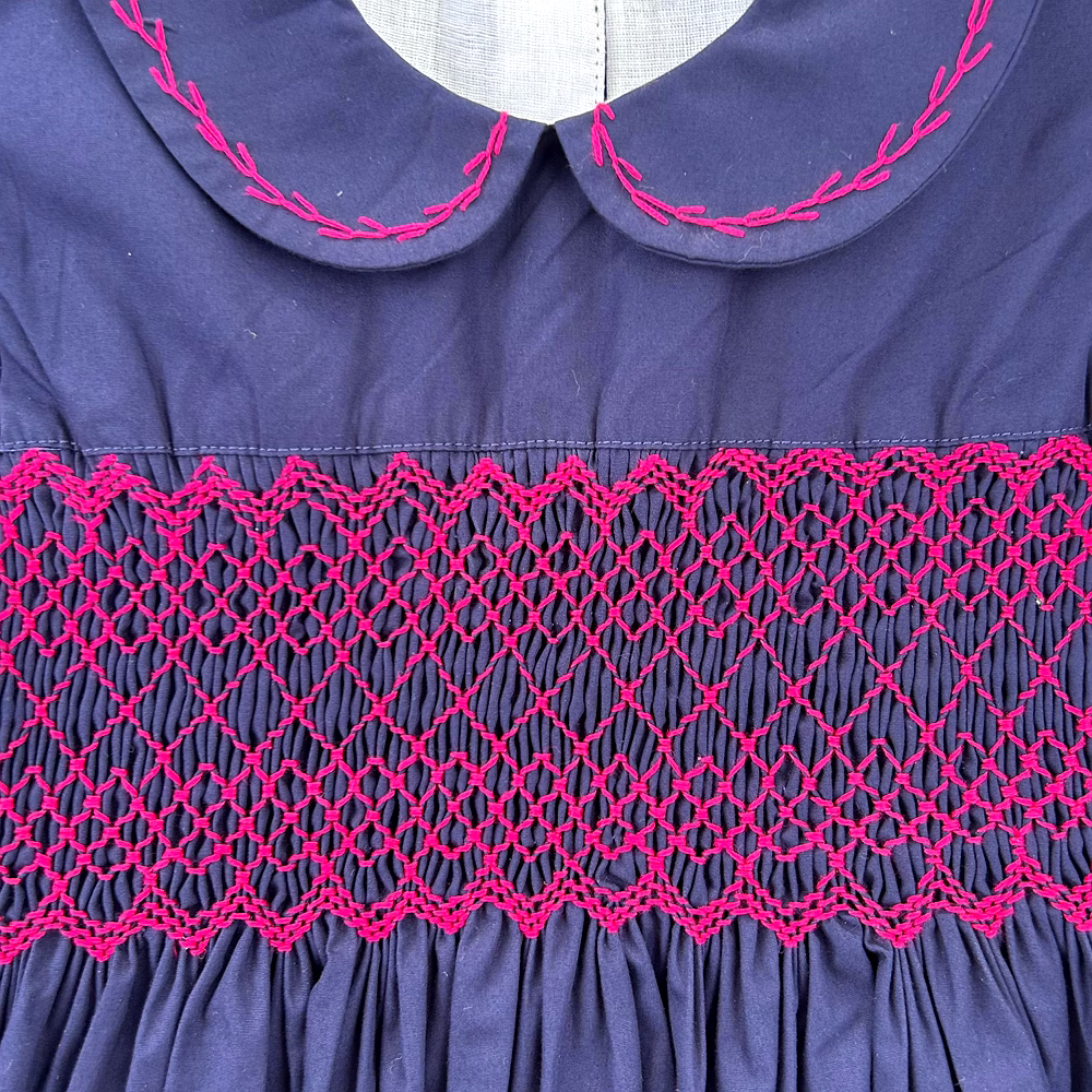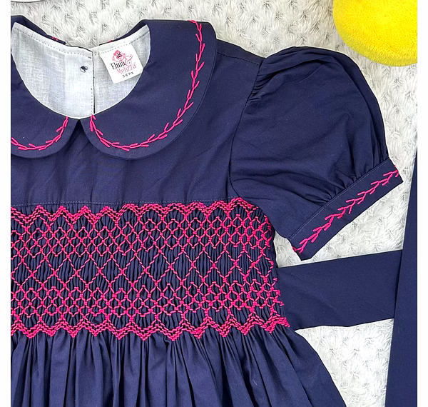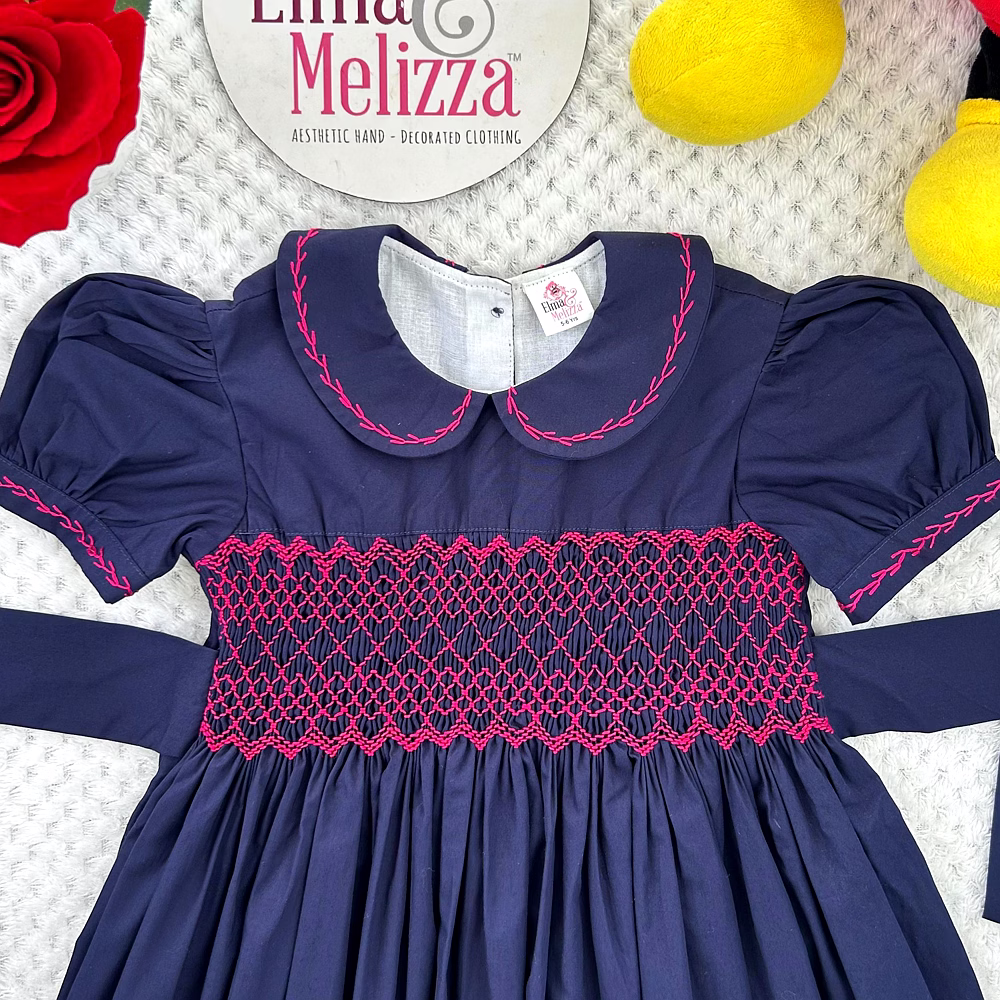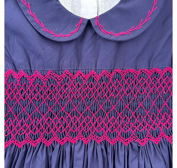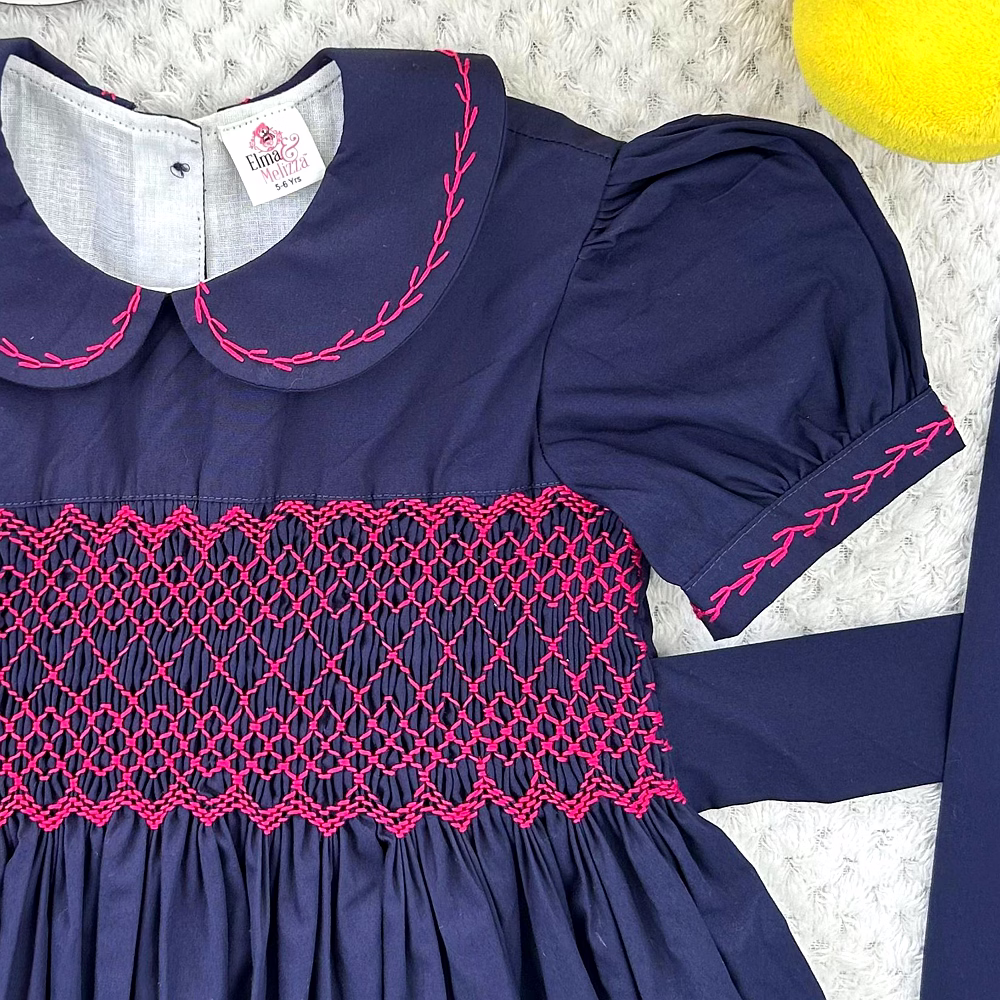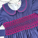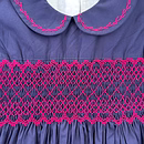 The intricately hand-smocked chest, delicately embroidered in dark pink thread, offers a sophisticated contrast against the deep blue fabric. This artisanal touch adds depth, elegance, and a dash of colour, elevating the dress to heirloom status. The Peter Pan collar and puffed sleeves are tastefully embroidered with matching pink lines, blending simplicity with thoughtful accents that draw the eye and warm the heart.