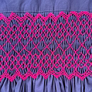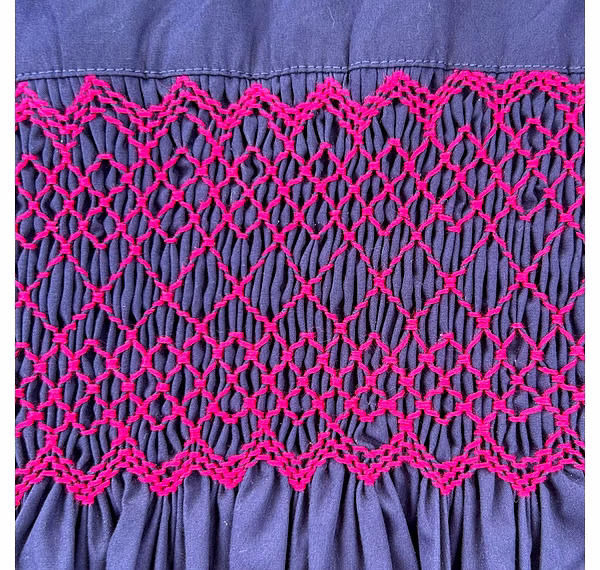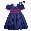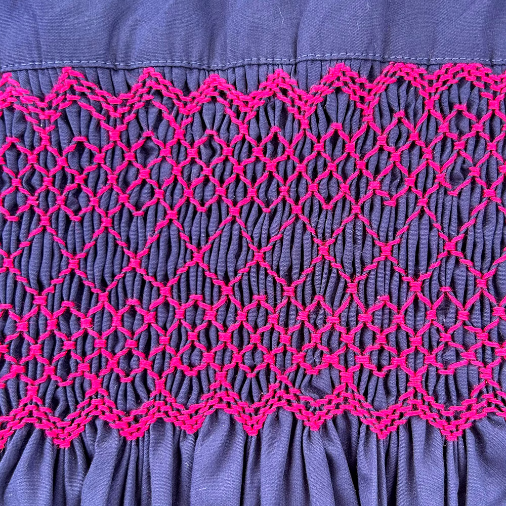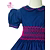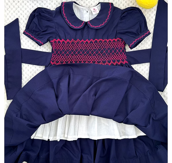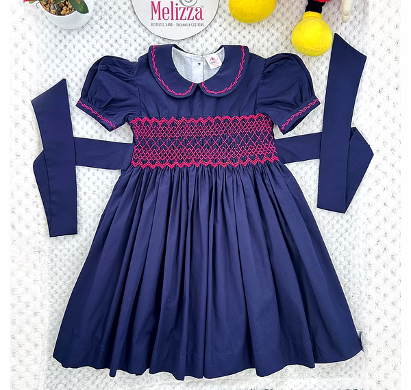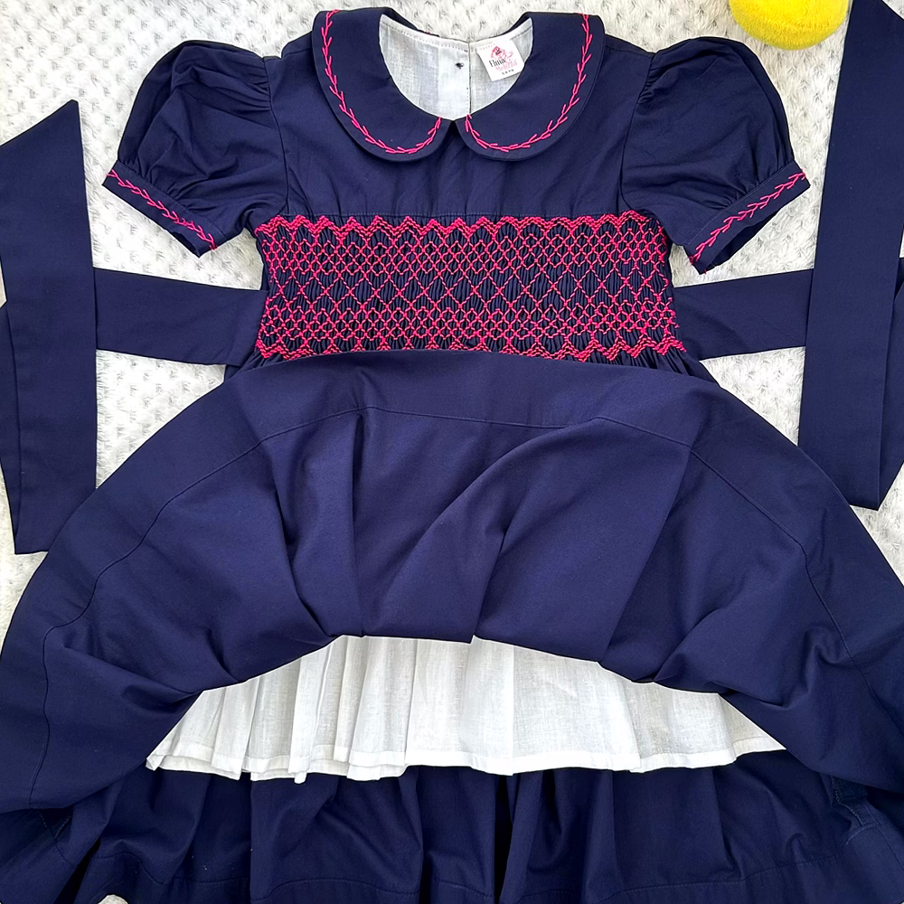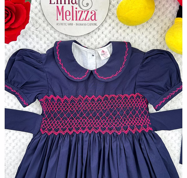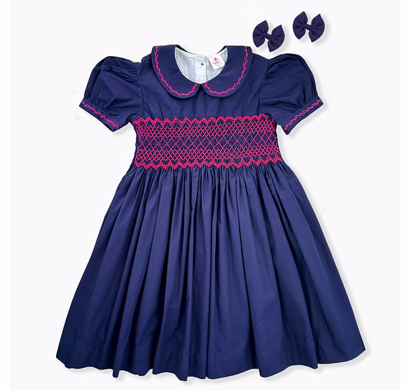 The intricately hand-smocked chest, delicately embroidered in dark pink thread, offers a sophisticated contrast against the deep blue fabric. This artisanal touch adds depth, elegance, and a dash of colour, elevating the dress to heirloom status. The Peter Pan collar and puffed sleeves are tastefully embroidered with matching pink lines, blending simplicity with thoughtful accents that draw the eye and warm the heart.