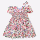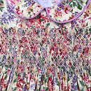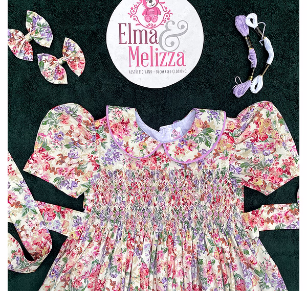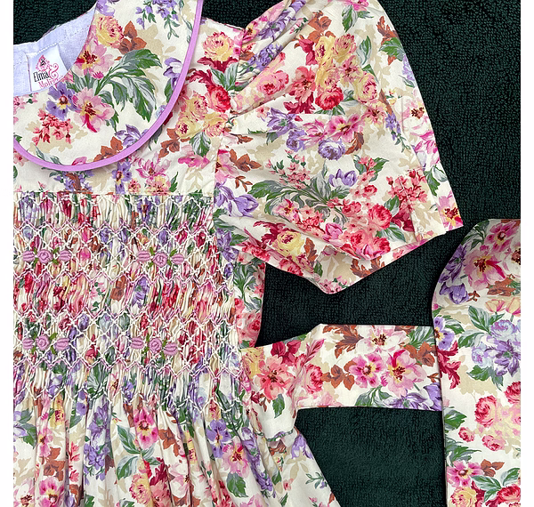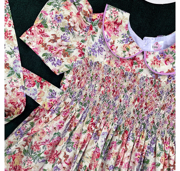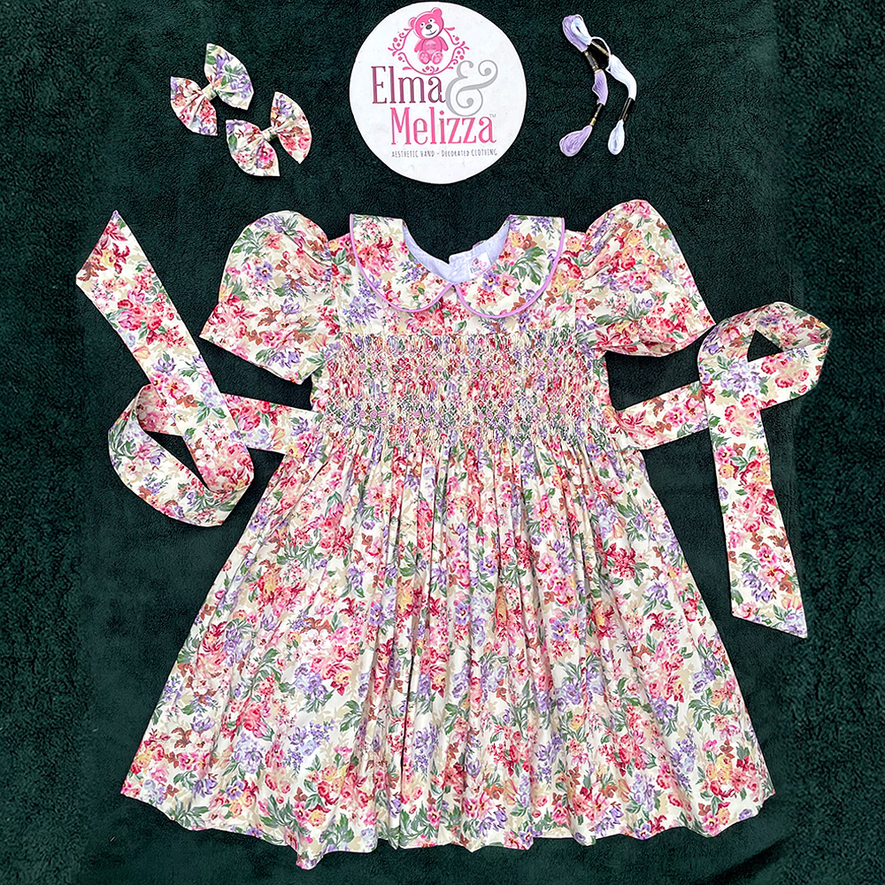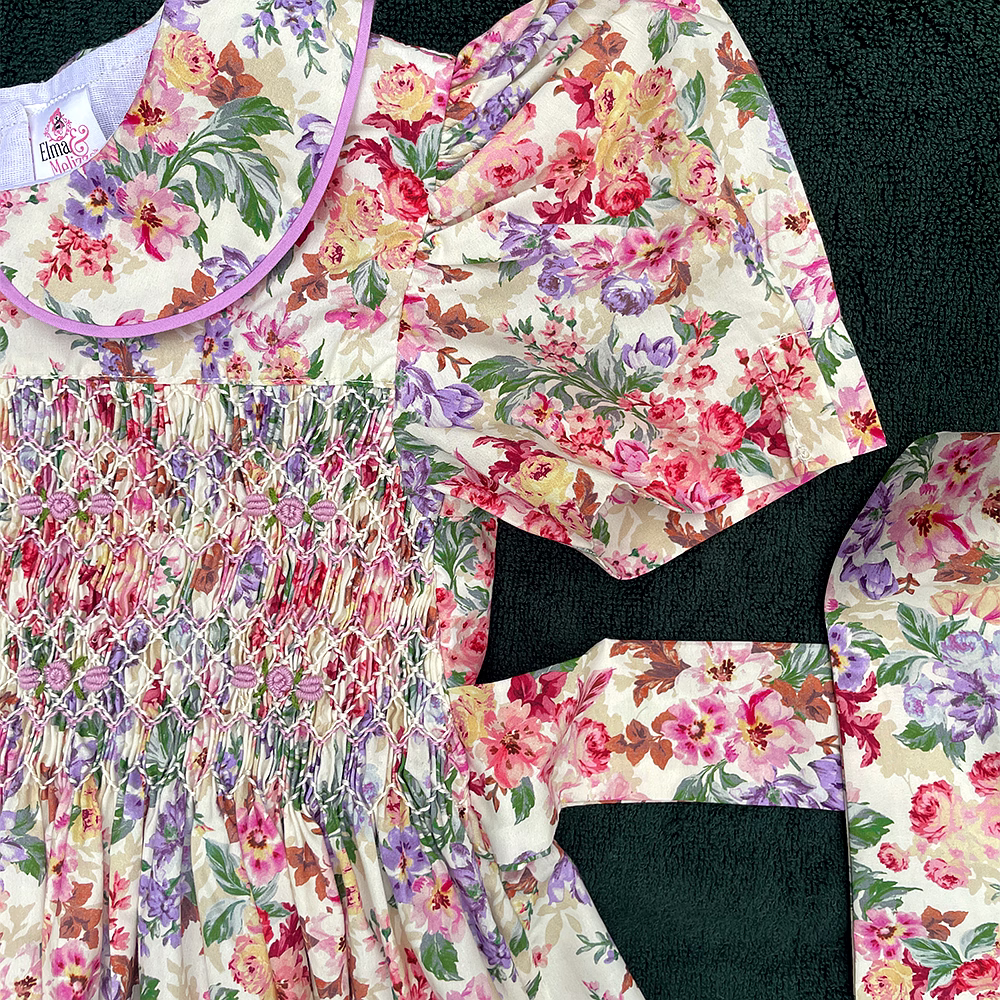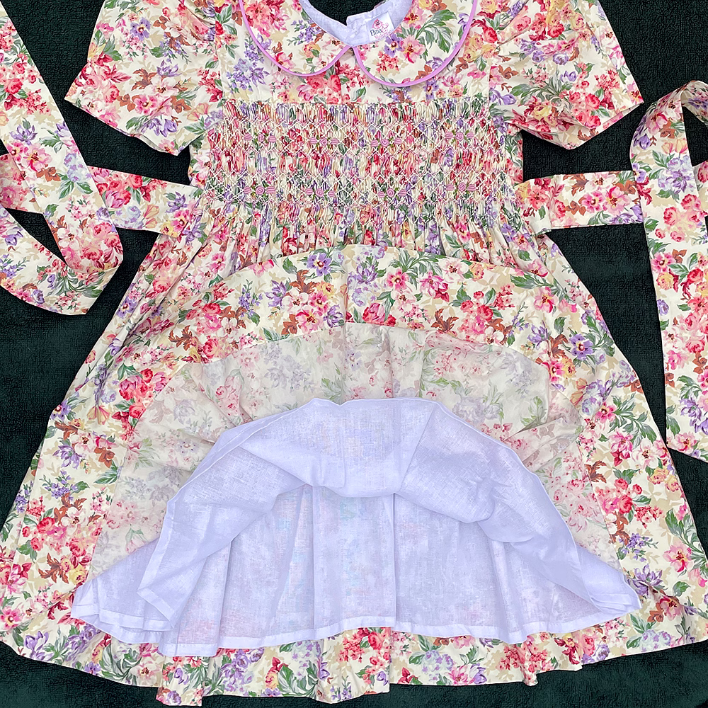 Design Features: Hand-smocked and hand-embroidered.Elegantly designed with a Peter Pan collar and puffed sleeves. Charm, simple pink and white embroidery design.