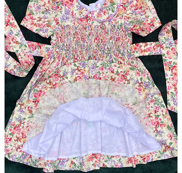 Drape your little girl in charm with this hand-smocked baby dress featuring purple and red floral prints on pure white cotton. Meticulously handmade for comfort and grace, the dress blossoms with soft rose motifs and intricate embroidery. Whether it’s her birthday, a family celebration, or a twirl-worthy photo shoot, this dress elevates her look with a storybook touch—refined, joyful, and picture-perfect.