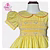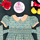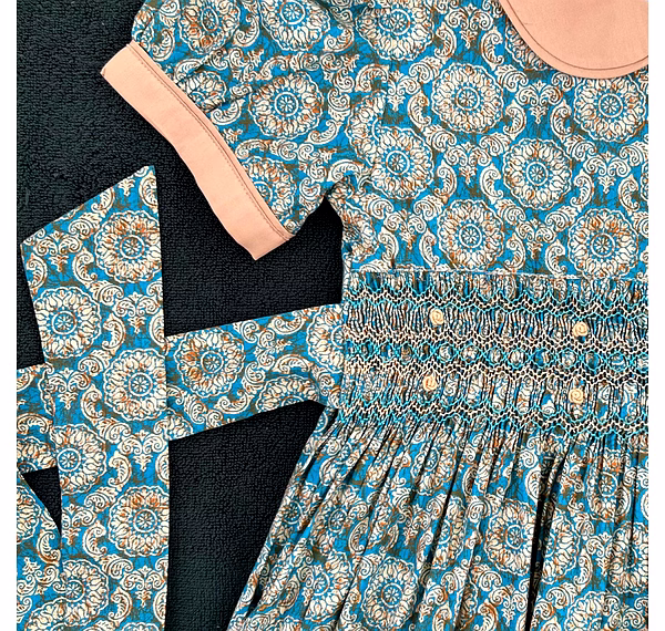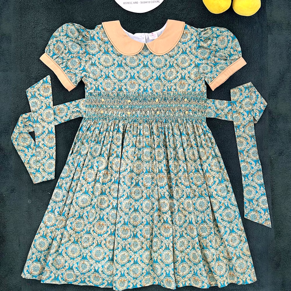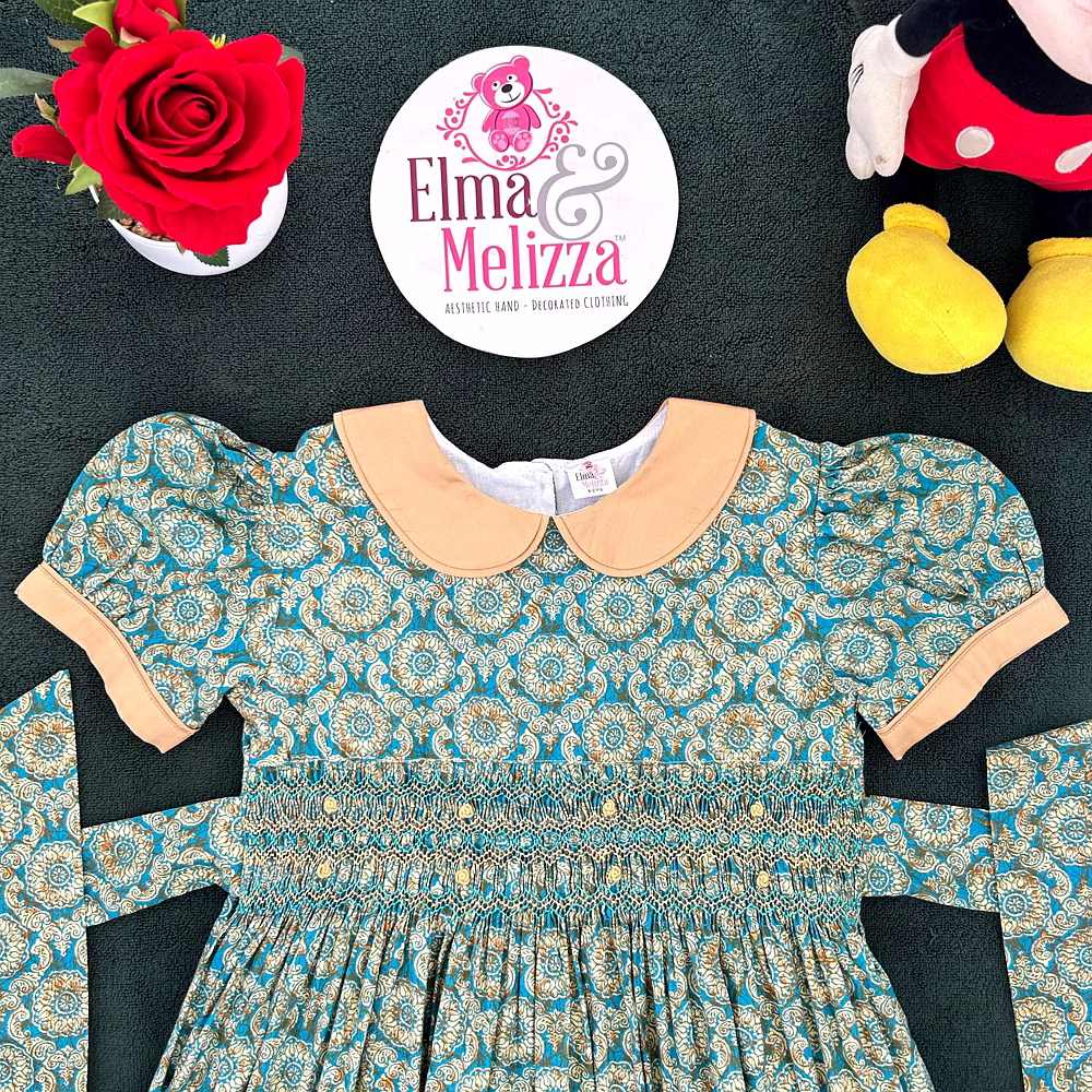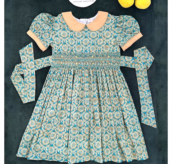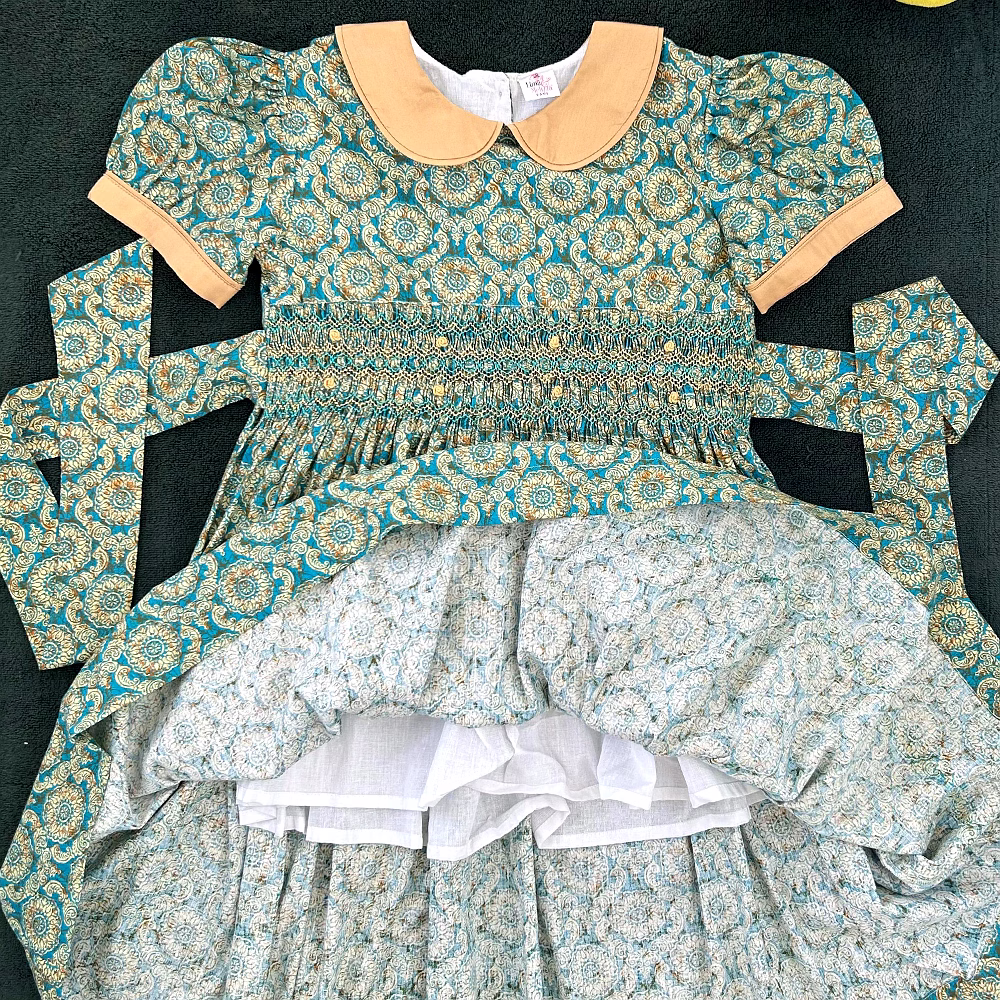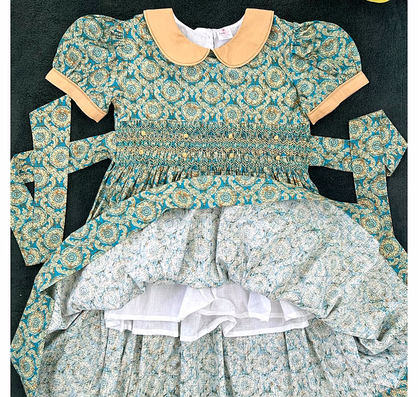 Every stitch of this dress tells a story of care and craftsmanship. The hand-smocked detailing across the chest is beautifully enhanced by golden rose embroidery, reflecting sophistication and love in every thread. A golden Peter Pan collar adds a soft glow, while puffed sleeves with golden borders bring a delicate, old-world silhouette. This dress is not just clothing—it’s an heirloom piece that celebrates childhood with refinement.