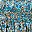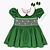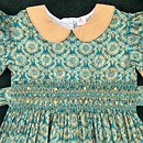 Introduce your little one to the magic of celebration with this Green Smocked Baby Girl Dress adorned with golden daisy whirl prints. This exquisite piece merges vintage charm with modern elegance, making it an essential for weddings, birthdays, and treasured family moments. The golden floral motifs bloom across soft green cotton, while the hand-smocked chest and golden rose embroidery create a rich, handcrafted finish that feels both regal and tender.