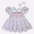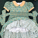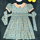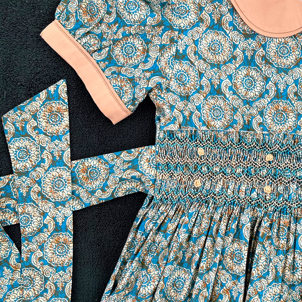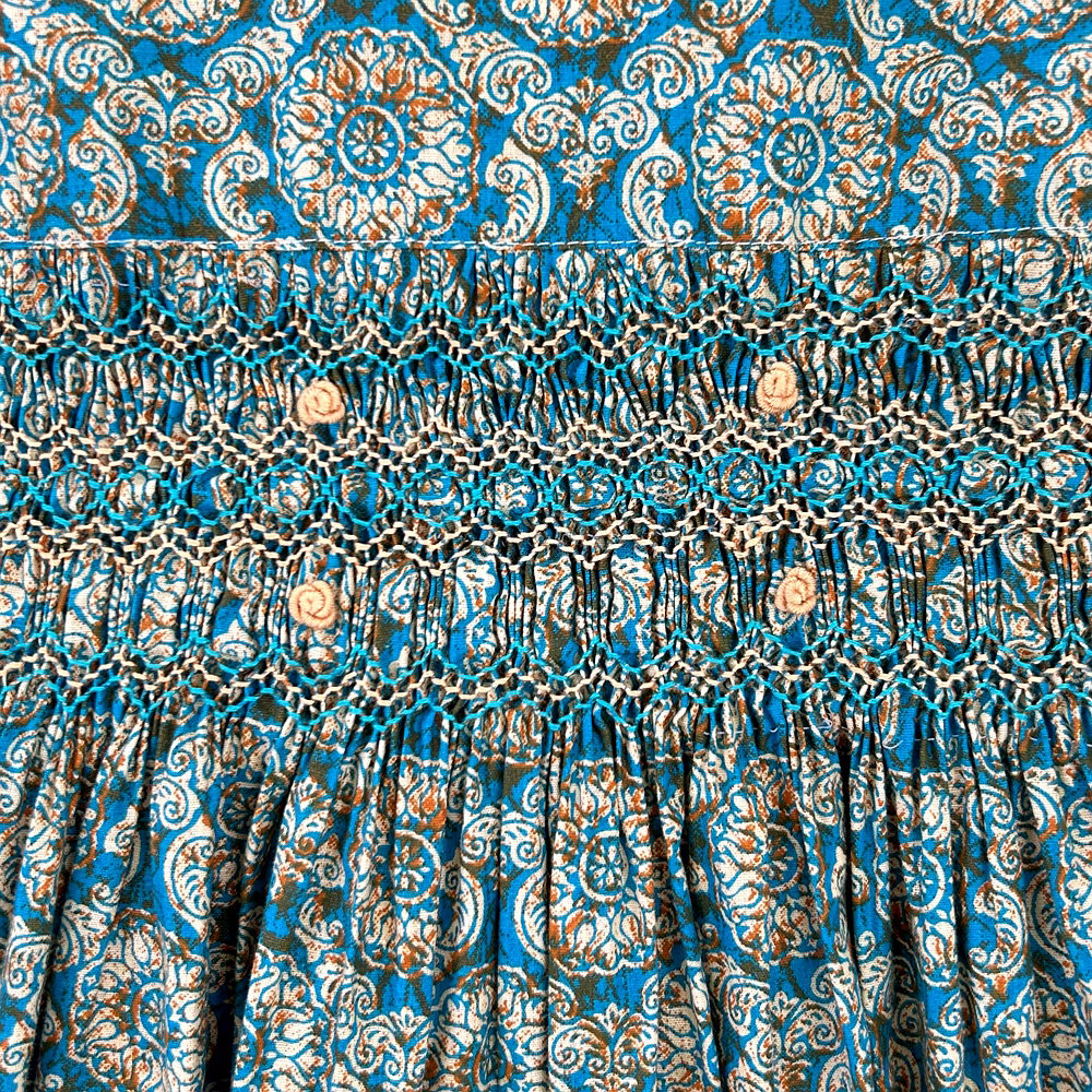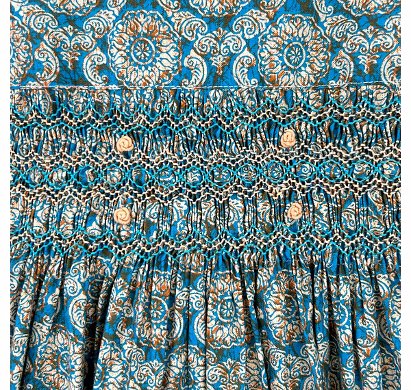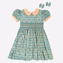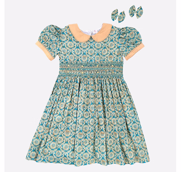 Design Features: Hand-smocked and hand-embroidered.Elegantly designed with a Peter Pan collar and puffed sleeves. Charm, cream, and blue colored embroidery design.