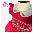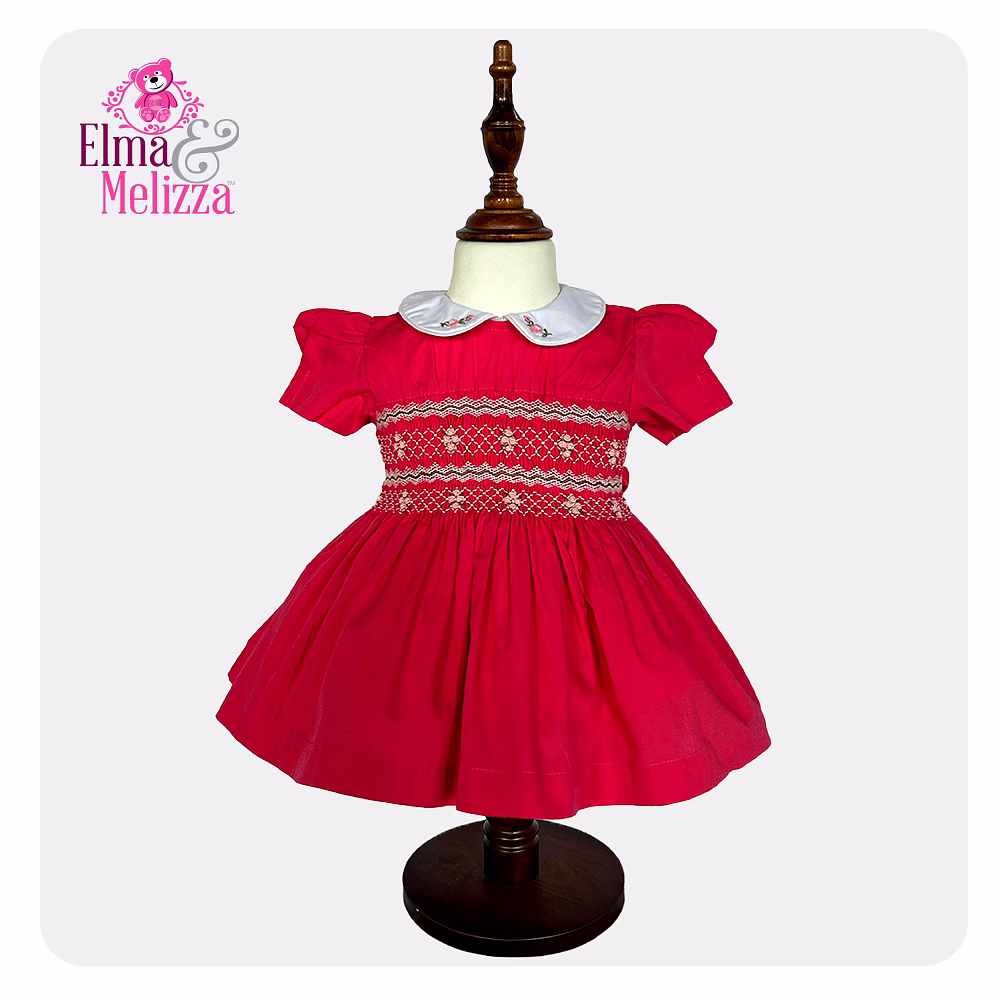 Every detail of this hand-smocked baby girl dress speaks of fine craftsmanship and love. The hand-smocked chest is carefully embroidered with dainty pink, white, and red threads, creating adorable rose motifs that enhance its vintage charm. A pure white Peter Pan collar, accented with tiny embroidered roses, completes the look, offering a sweet, sophisticated style perfect for capturing magical photos.