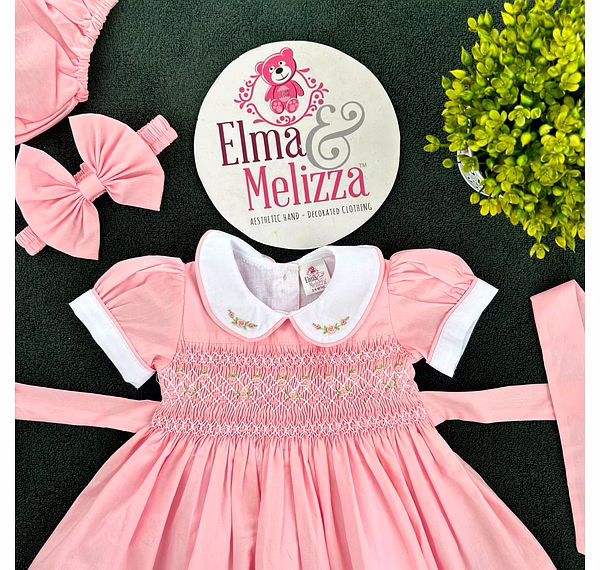 1. Pink color hand smocked dress with hair clips and panty - 2 Nos