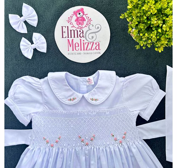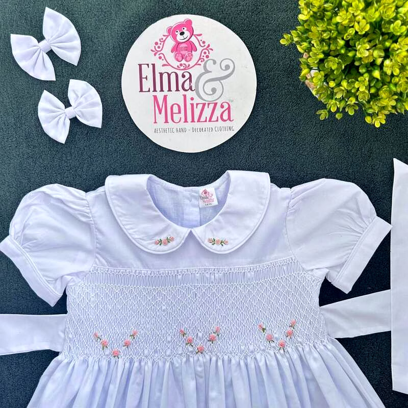 3.White color hand smocked dress with pink flowers - 01 Nos